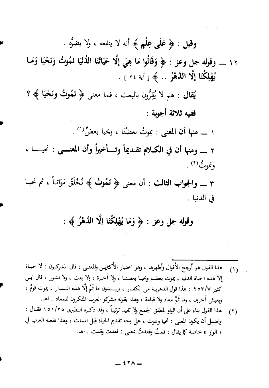 وقيل على علم انه لا ينفعه ولا يضره 12 - وقوله جل وعز (وقالوا ما هي إلا حياتنا الدنيا نموت ونحيا وما يهلكنا إلا الدهر) (آية 24) يقال هم لا يقرون بالبعث فما معنى (نموت ونحيا) ؟ ففيه ثلاثة أجوبة: 1 - منها ان المعنى يموت بعضنا ويحيا بعض 2 - ومنه ان في الكلام تقديما وتأخيرا وأن المعنى نحيا ونموت 3 - والجواب الثالث أن معنى (نموت) نخلق مواتا ثم نحيا في الدنيا وقوله جل وعز (وما يهلكنا إلا الدهر)