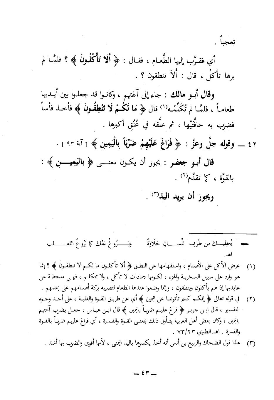 أي فقرب إليها الطعام فقال (ألا تأكلون) ؟ فلما لم يرها تأكل قال ألا تنطقون؟ وقال أبو مالك جاء إلى آلهتهم وكانوا قد جعلوا بين أيديها طعاما فلما لم تكلمه قال مالكم لا تنطقون فأخذ فأسا فضرب به حافتيها ثم علقه في عنق أكبرها 42 - وقوله جل وعز (فراغ عليهم ضربا باليمين) (آية 93) قال أبو جعفر يجوز أن يكون معنى (باليمين) بالقوة كما تقدم ويجوز أن يريد اليد
