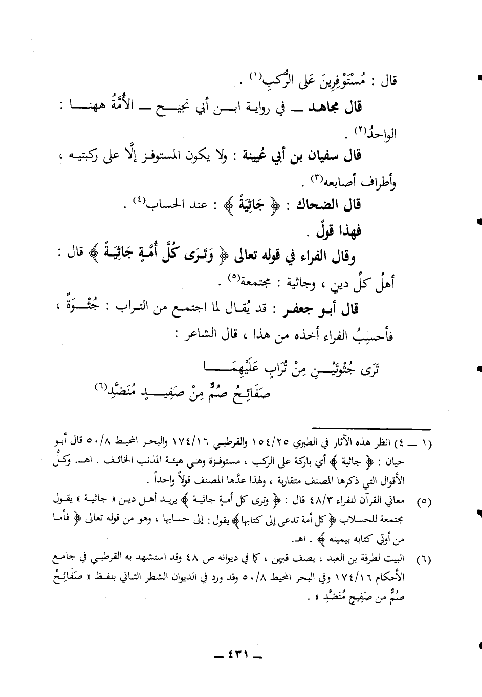 قال مستوفرين على الركب قال مجاهد في رواية ابن أبي نجيح الأمة ههنا الواحد قال سفيان بن أبي عيينة ولا يكون المستوفز إلا على ركبتيه وأطراف أصابعه قال الضحاك (جاثية) عند الحساب فهذا قول وقال الفراء في قوله تعالى (وترى كل أمة جاثية) قال أهل كل دين وجاثية مجتمعة قال أبو جعفر قد يقال لما اجتمع من التراب جثوة فأحسب الفراء أخذه من هذا قال الشاعر: ترى جثوتين من تراب عليهما * صفائح صم من صفيد ابن منضد