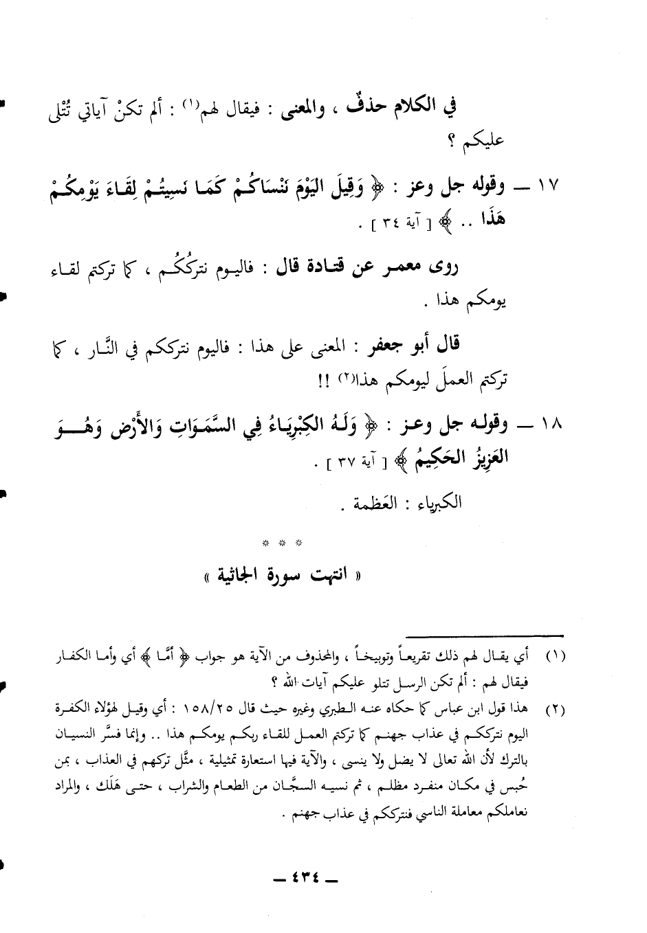 روى معمر عن قتادة قال فاليوم نترككم كما تركتم لقاء يومكم هذا قال أبو جعفر المعنى على هذا فاليوم نترككم في النار كما تركتم العمل ليومكم هذا 18 - وقوله جل وعز (وله الكبرياء في السموات والأرض وهو العزيز الحكيم) (آية 37) الكبرياء العظمة انتهت سورة الجاثية