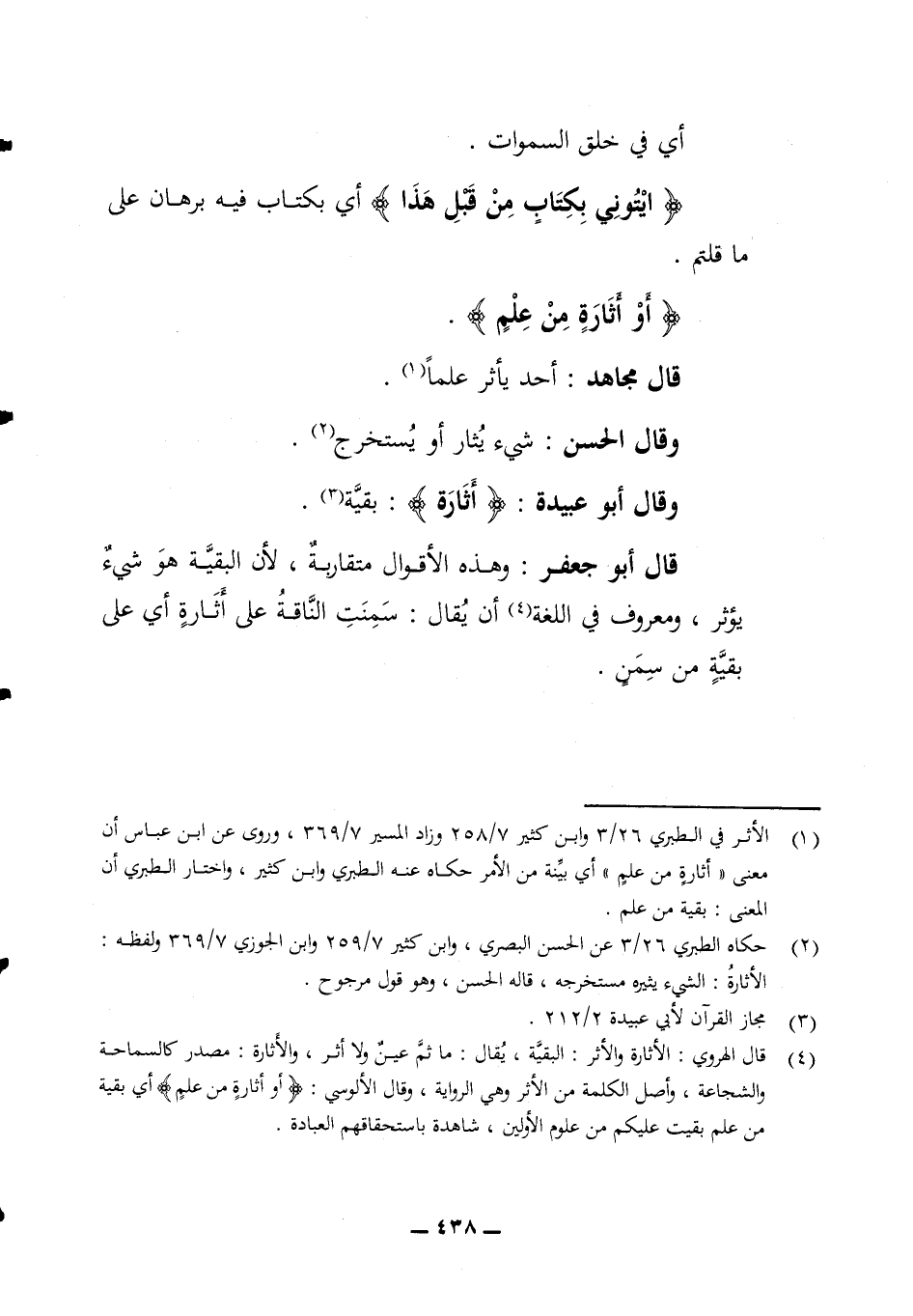 أي في خلق السموات (ايتوني بكتاب من قبل هذا) أي بكتاب فيه برهان على ما قلتم (أو أثارة من علم) قال مجاهد أحد يأثر علما وقال الحسن شئ يثار أو يستخرج وقال أبو عبيدة (أثارة) بقية قال أبو جعفر وهذه القوال متقاربة لأن البقية هو شئ يؤثر ومعروف في اللغة أن يقال سمنت الناقة على أثارة أي على بقية من سمن
