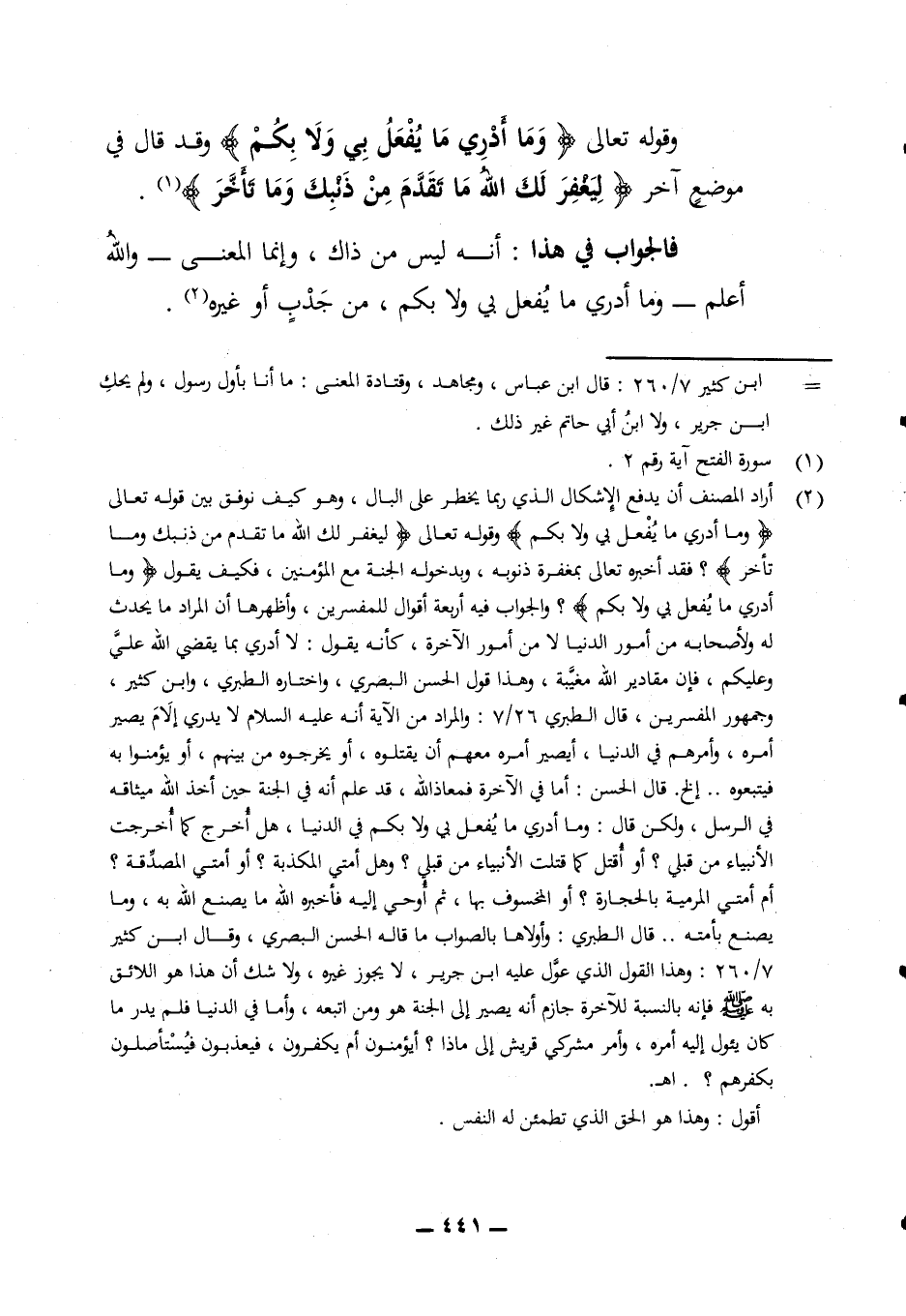 وقوله تعالى (وما أدري ما يفعل بي ولا بكم) وقد قال في موضع آخر (ليغفر لك الله ما تقدم من ذنبك وما تأخر) فالجواب في هذا أنه ليس من ذاك وإنما المعنى - والله أعلم - وما أدري ما يفعل بي ولا بكم من جدب أو غيره