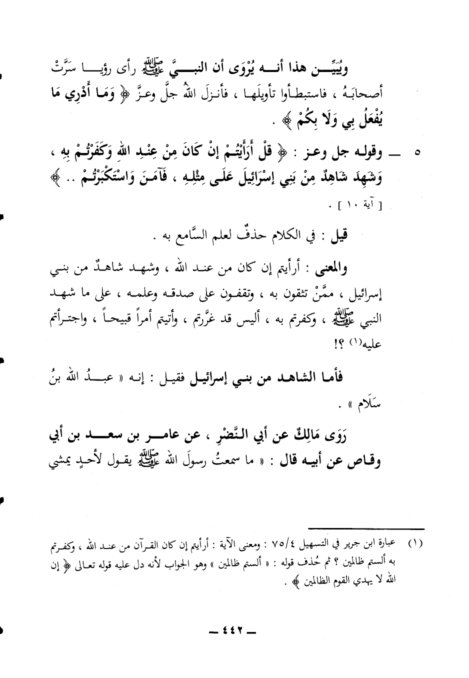 (آية 10) قيل في الكلام حذف لعلم السامع به والمعنى أرأيتم إن كان من عند الله وشهد شاهد من بني إسرائيل ممن تثقون به وتقفون على صدقه وعلمه على ما شهد النبي صلى الله عليه وسلم وكفرتم به أليس قد غررتم وأتيتم أمرا قبيحا واجترأتم عليه؟ ! فأما الشاهد من بني إسرائيل فقيل إنه عبد الله بن سلام روى مالك عن أبي النضر عن عامر بن سعد بن أبي وقاص عن أبيه قال ما سمعت رسول الله صلى الله عليه وسلم يقول لأحد يمشي