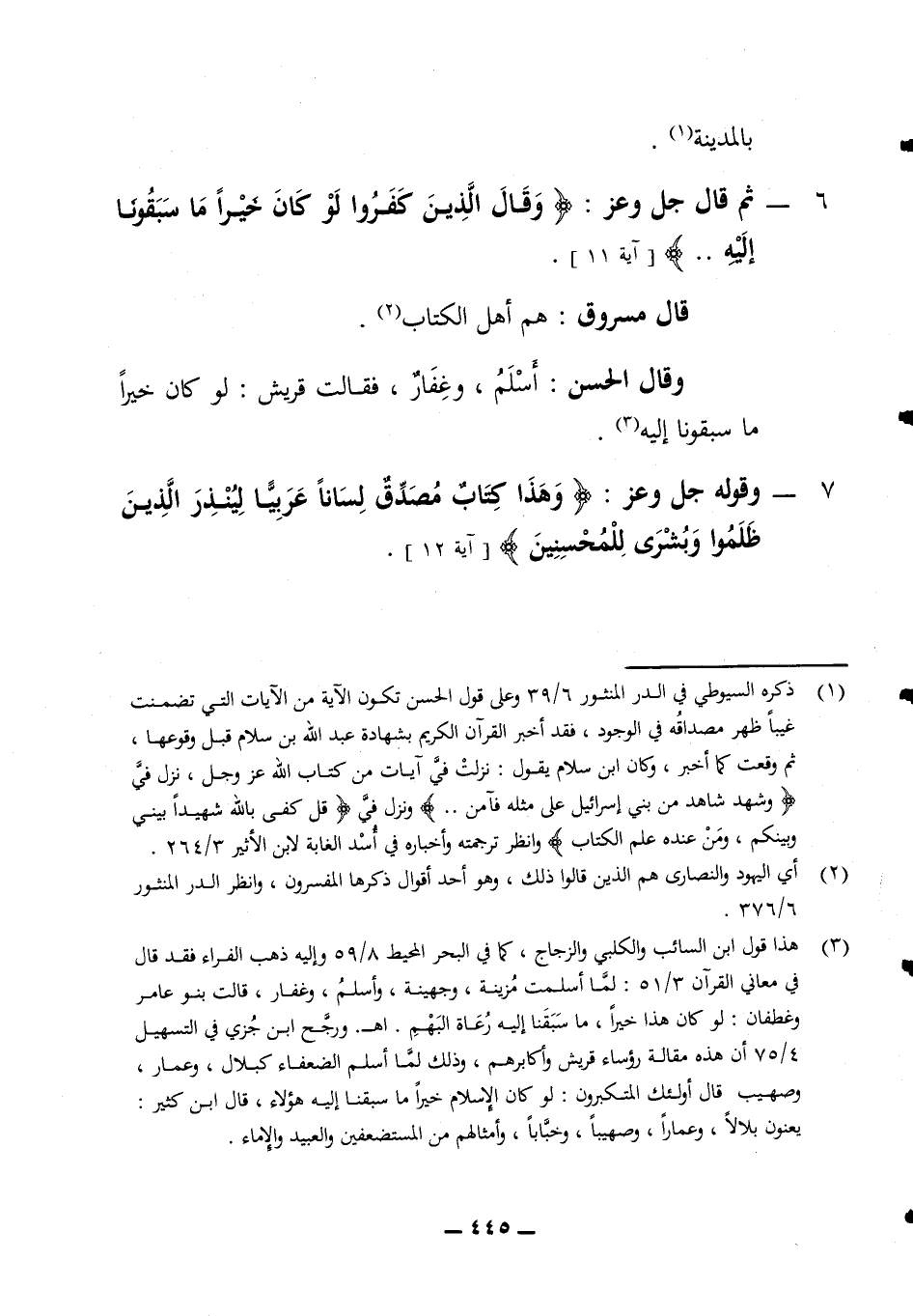 بالمدينة 6 - ثم قال جل وعز (وقال الذين كفروا لو كان خيرا ما سبقونا إليه) (آية 11) قال مسروق هم أهل الكتاب وقال الحسن اسلم وغفار فقالت قريش لو كان خيرا ما سبقونا إليه 7 - وقوله جل وعز (وهذا كتاب مصدق لسانا عربيا لينذر الذين ظلموا وبشرى للمحسنين) (آية 12)