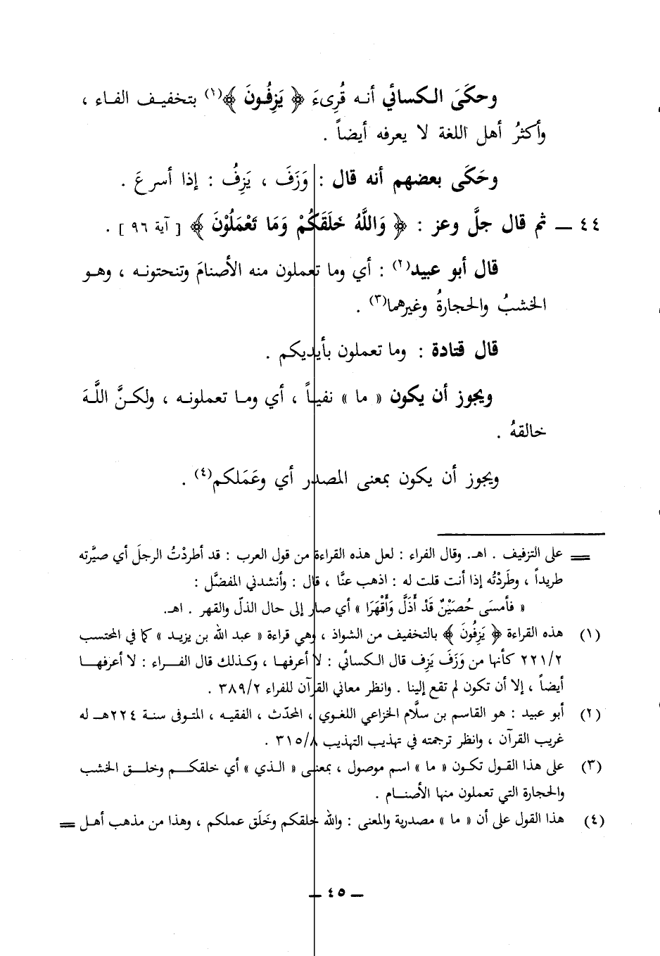 44 - ثم قال جل وعز (والله خلقكم وما تعملون) (آية 96) قال أبو عبيد أي وما تعملون منه الأصنام وتنحتونه عليه وهو الخشب والحجارة وغيرهما قال قتادة وما تعملون بايديكم ويجوز أن يكون ما نفيا أي وما تعملونه ولكن الله خالقه ويجوز أن يكون بمعنى المصدر أي وعملكم
