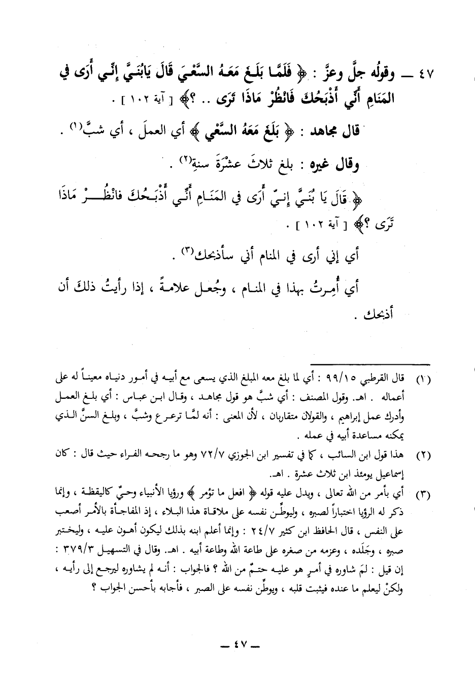 47 - وقوله جل وعز (فلما بلغ معه السعي قال يا بني إني أرى في المنام أني أذبحك فانظر ماذا ترى) (آية 102) قال مجاهد (بلغ معه السعي) أي العمل أي شب وقال غيره بلغ ثلاث عشرة سنة قال يا بني إني أرى في المنام أني أذبحك فانظر ماذا