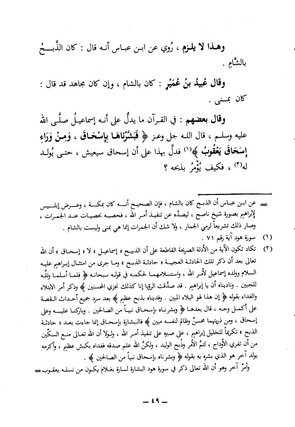 وهذا لا يلزم روي عن ابن عباس انه قال كان الذبح بالشام وقال عبيد بن عمير كان بالشام وإن كان مجاهد قد قال كان بمنى وقال بعضهم في القرآن ما يدل على أنه إسماعيل صلى الله عليه وسلم قال الله عز وجل (فبشرناه بإسحاق ومن وراء إسحاق يعقوب) فدل بهذا على أن إسحاق سيعيش حتى يولد له فكيف يؤمر بذبحه؟