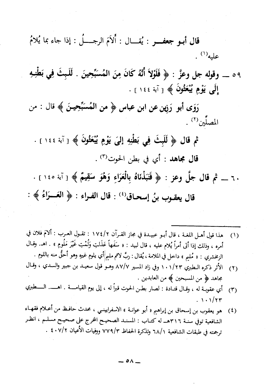 قال أبو جعفر يقال ألام الرجل إذا جاب ما يلام عليه 59 - وقوله جل وعز (فلولا انه كان من المسبحين للبث في بطنه إلى يوم يبعثون) (آية 144) روى أبو رزين عن ابن عباس (من المسبحين) قال من المصلين ثم قال (للبث في بطنه إلى يوم يبعثون) (آية 144) قال مجاهد أي في بطن الحوت 60 - ثم قال جل وعز (فنبذناه بالعراء وهو سقيم) (آية 145) قال يعقوب بن إسحاق قال الفراء (العراء)
