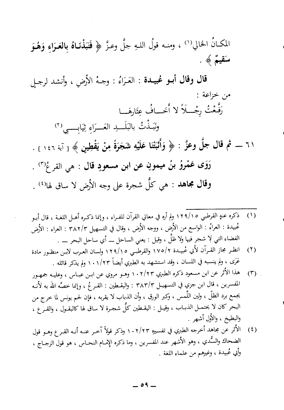 سقيم) قال وقال أبو عبيدة العراء وجه الأرض وأنشد لرجل من خزاعة: رفعت رجلا لا أخاف عثارها * ونبذت بالبلد العراء ثيابي 61 - ثم قال جل وعز (وأنبتنا عليه شجرة من يقطين) (آية 146) روى عمرو بن ميمون عن ابن مسعود قال هي القرع وقال مجاهد هي كل شجرة على وجه الأرض لا ساق لها