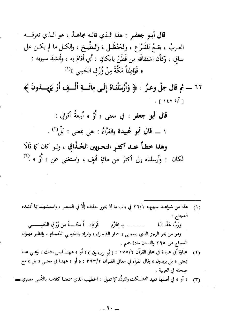 قال أبو جعفر هذا الذي قاله مجاهد هو الذي تعرفه العرب يقع للقرع والحنظل والبطيخ والكل ما لم يكن على ساق وكأن اشتقاقه من قطن بالمكان أي أقام به وانشد سيويه: قواطنا مكة من ورق الحمي 62 - ثم قال جل وعز (وأرسلناه إلى مائة الف أو يزيدون) (آية 147) قال أبو جعفر في معنى أو أربعة اقوال 1 - قال أبو عبيدة والفراء هي بمعنى بل وهذا خطأ عند أكثر النحويين الحذاق ولو كان كما قالا لكان وارسلناه إلى أكثر من مائة ألف واستغنى عن أو