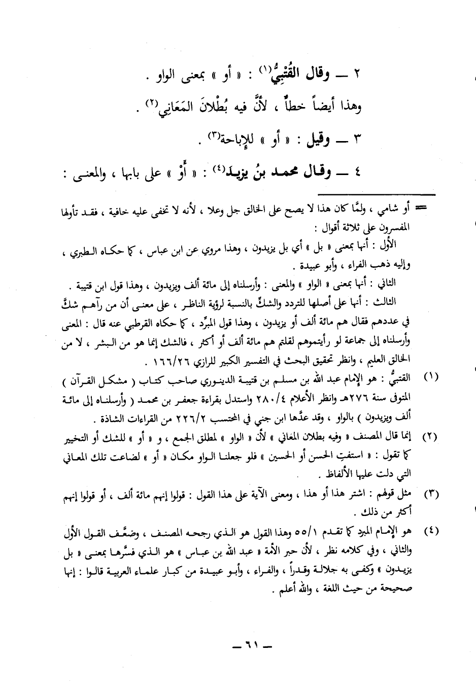 2 - وقال القتبي أو بمعنى الواو وهذا ايضا خطا لأن فيه بطلان المعاني 3 - وقيل أو للإباحة