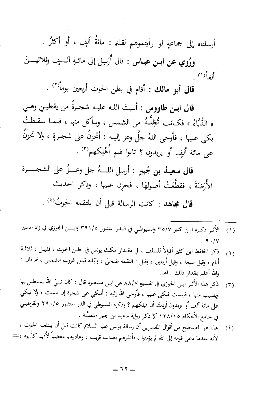 أرسلناه إلى جماعة لو رأيتموهم لقلتم مائة ألف أو أكثر وروي عن ابن عباس قال أرسل إلى مائة ألف وثلاثين الفا قال أبو مالك اقام في بطن الحوت أربعين يوما قال ابن طاووس أنبت الله عليه شجرة من يقطين وهي الدباء فكانت تظله من الشمس ويأكل منها فلما سقطت بكى عليها فأوحى الله جل وعز إليه أتحزن على شجرة ولا تحزن على مائة ألف أو يزيد وتابوا فلم أهلكهم قال سعيد بن جبير أرسل الله جل وعز على الشجرة الأرضة فقطعت أصولها فحزن عليها وذكر الحديث قال مجاهد كانت الرسالة قبل أن يلتقمه الحوت
