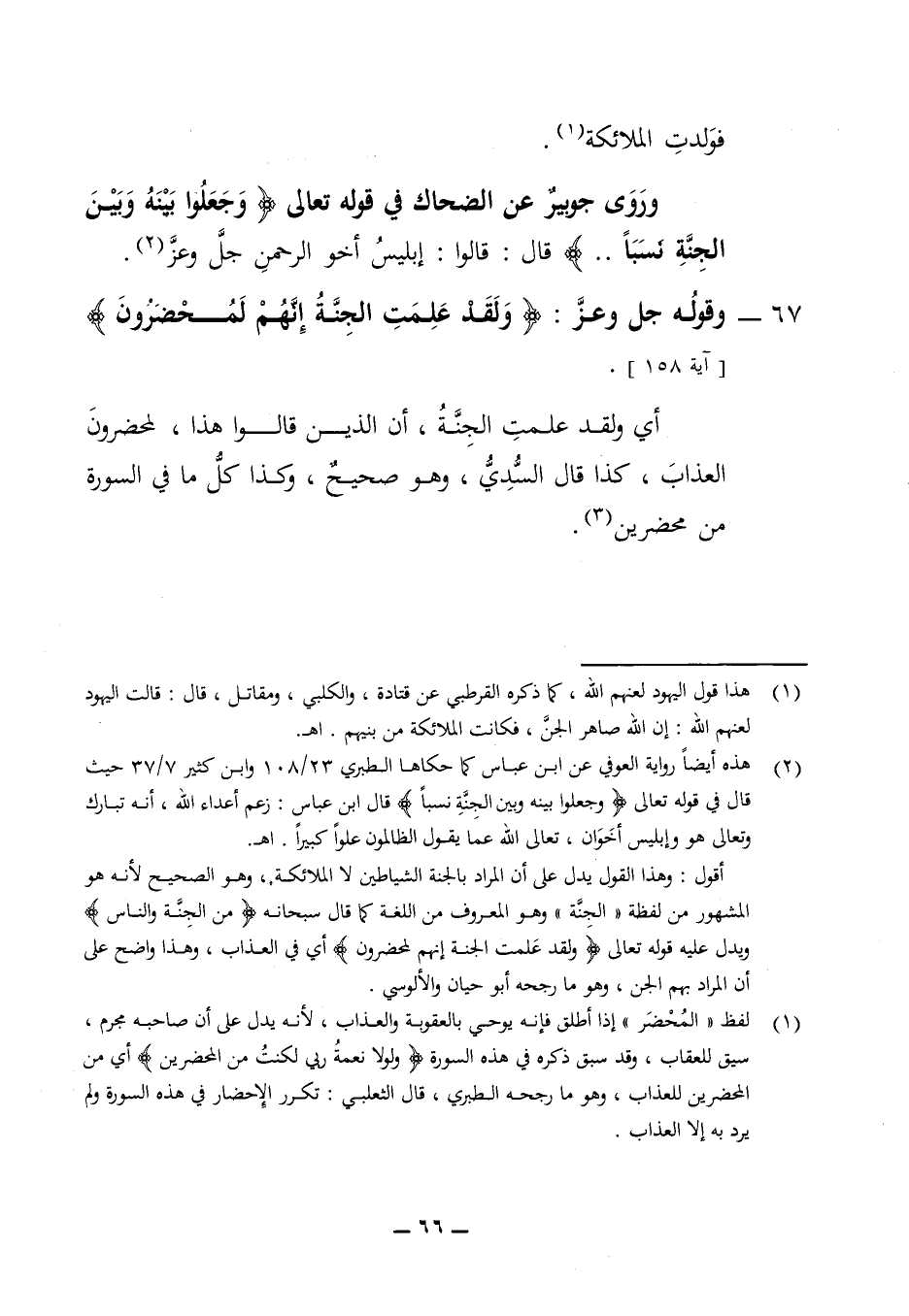 فولدت الملائكة وروى جويبر عن الضحاك في قوله تعالى (وجعلوا بينه وبين الجنة نسبا) قال قالوا إبليس أخو الرحمن جل وعز 67 - وقوله جل وعز (ولقد علمت الجنة إنهم لمحضرون) (آية 158) أي ولقد علمت الجنة ان الذين قالوا هذا لمحضرون العذاب كذا قال السدي وهو صحيح وكذا كل ما في السورة من محضرين