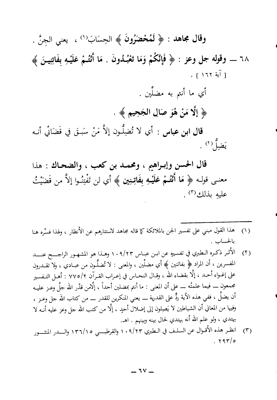 وقال مجاهد (لمحضرون) الحساب يعني الجن 68 - وقوله جل وعز (فإنكم وما تعبدون ما أنتم عليه بفاتنين) (آية 162) أي ما أنتم به مضلين (إلا من هو صال الجحيم) قال ابن عباس أي لا تضلون إلا من سبق في قضائي أنه يضل قال الحسن وإبراهيم ومحمد بن كعب والضحاك هذا معنى قوله (ما أنتم عليه بفاتنين) أي لن تفتنوا إلا من قضيت عليه بذلك