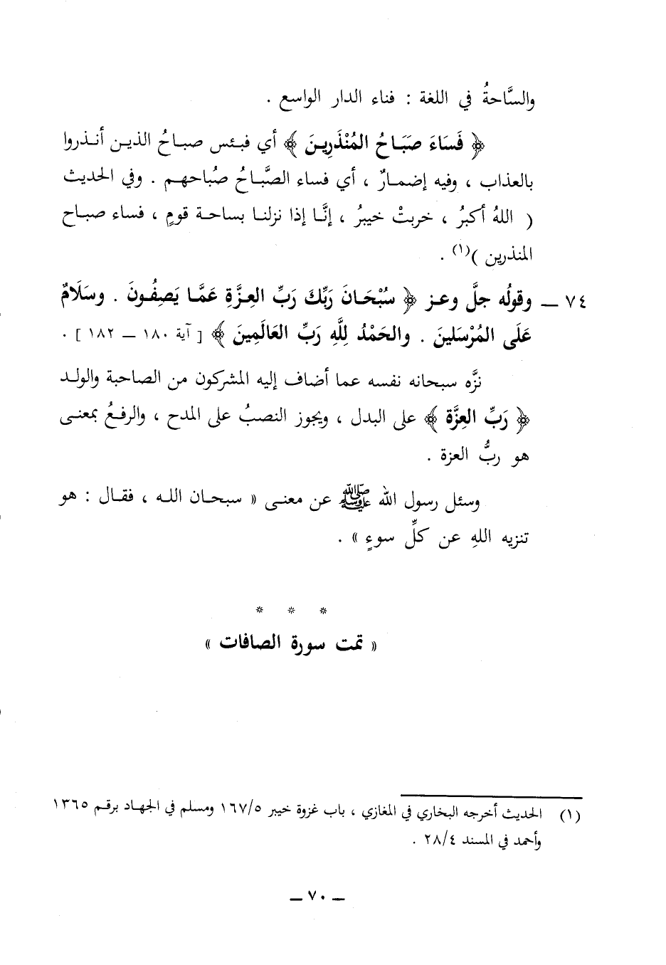 والساحة في اللغة فناء الدار الواسع (فساء صباح المنذرين) أي فبئس صباح الذين أنذروا بالعذاب وفيه إضمار أي فساء الصباح صباحهم وفي الحديث (الله أكبر خربت خيبر إنا إذا انزلنا بساحة قوم فساء صباح المنذرين) 74 - وقوله جل وعز (سبحانك ربك رب العزة عما يصفون وسلام على المرسلين والحمد لله رب العالمين) (آية 182 180) نزه سبحانه نفسه عما أضاف إليه المشركون من الصاحبة والولد (رب العزة) على البدل ويجوز النصب على المدح والرفع بمعنى هو رب العزة وسئل رسول الله صلى الله عليه وسلم عن معنى سبحان الله فقال هو تنزيه الله عن كل سوء تمت سورة الصافات