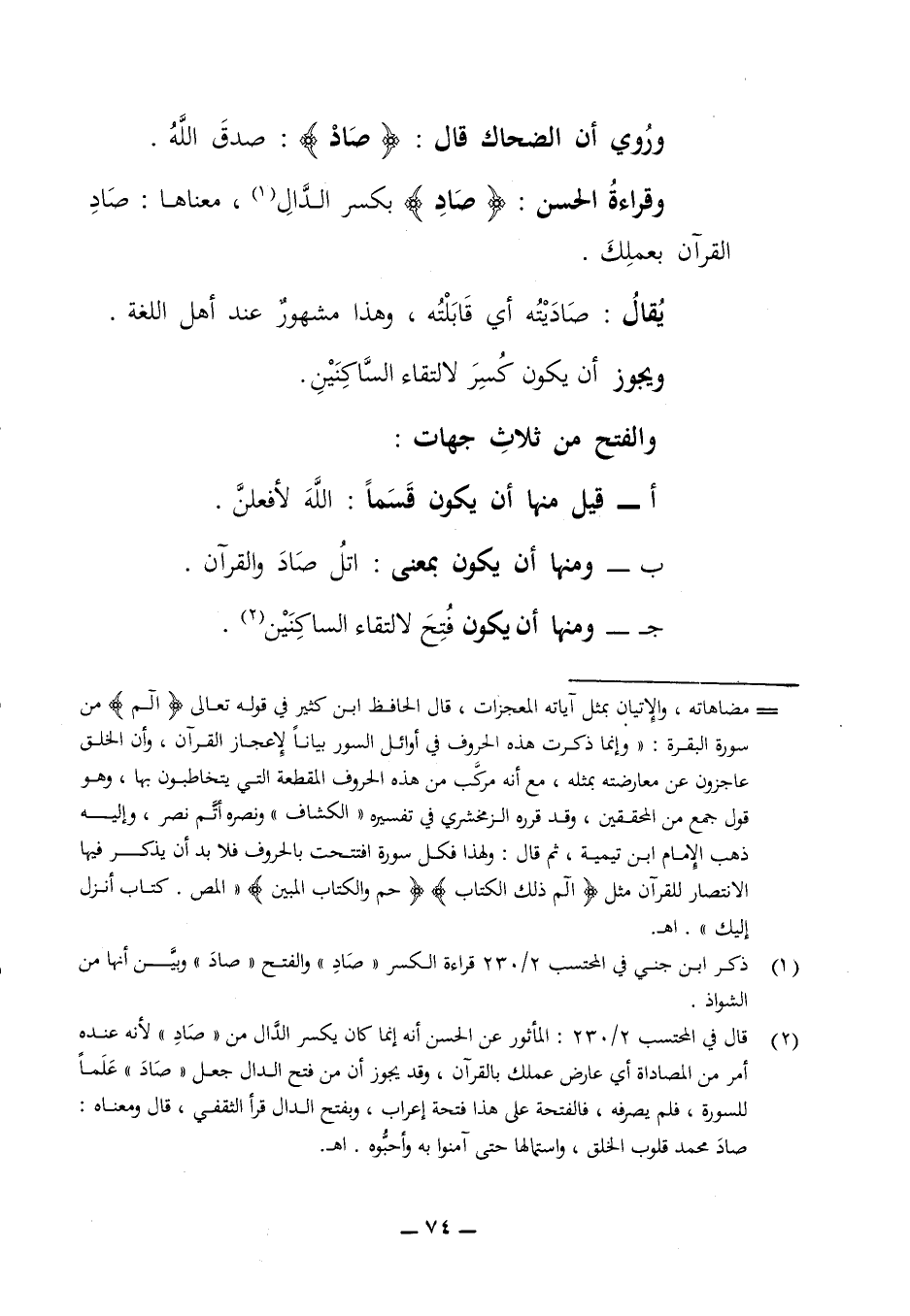 وروي أن الضحاك قال صاد صدق الله وقراءة الحسن (صاد) بكسر الدال معناها صاد القرآن بعملك يقال صاديته أي قابلته وهذا مشهور عند أهل اللغة ويجوز أن يكون كسر لالتقاء الساكنين والفتح من ثلاث جهات: أ - قيل منها أن يكون قسما الله لأفعلن ب - ومنها أن يكون بمعنى اتل صاد والقرآن ج - ومنها ان يكون فتح لالتقاء الساكنين