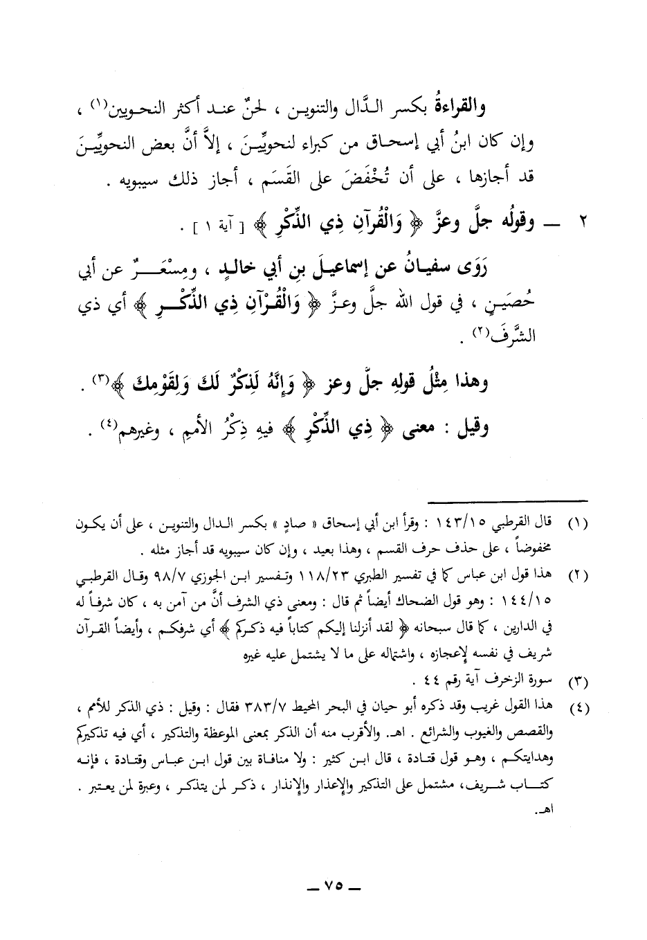 والقراءة بكسر الدال والتنوين لحن عند أكثر النحويين وإن كان ابن أبي إسحاق من كبراء النحويين إلا ان بعض النحويين قد أجازها على أن تخفض على القسم أجاز ذلك سيبويه 2 - وقوله جل وعز (والقرآن ذي الذكر) (آية 1) روى سفيان عن إسماعيل بن أبي خالد ومسعر عن ابي حصين في قول الله جل وعز والقرآن ذي الذكر أي ذي الشرف وهذا مثل قوله جل وعز (وإنه لذكر لك ولقومك) وقيل معنى (ذي الذكر) فيه ذكر الأمم وغيرهم