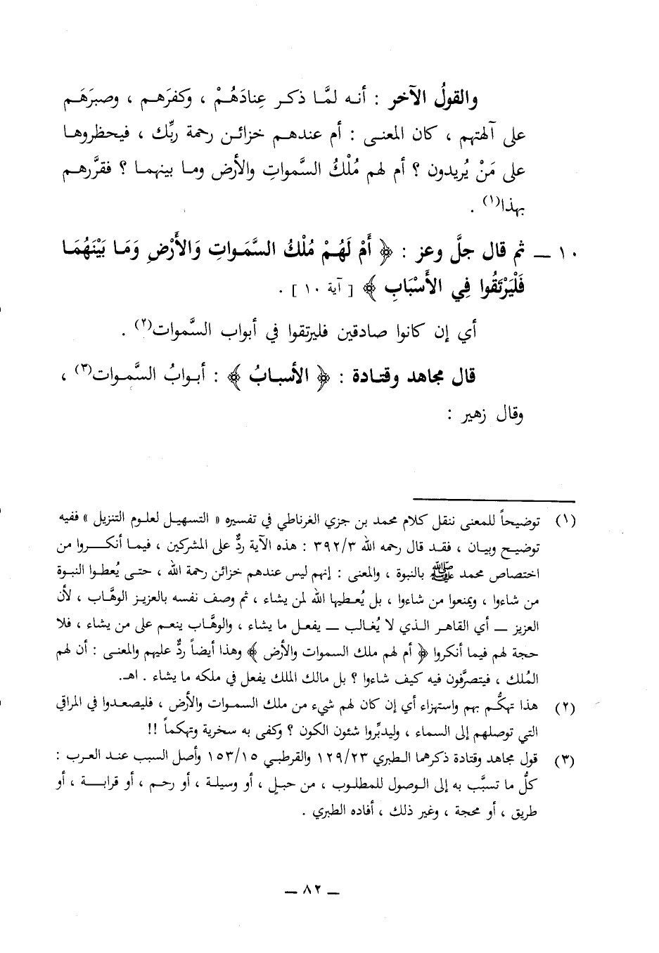 والقول الآخر أنه لما ذكر عنادهم وكفرهم وصبرهم على آلهتهم كان المعنى ام عندهم خزائن رحمة ربك فيحظروها قال على من يريدون أم لهم ملك السموات والأرض وما بينهما فقررهم بهذا 10 - ثم قال جل وعز (أم لهم ملك السموات والأرض وما بينهما فليرتقوا في الأسباب) (آية 10) أي إن كانوا صادقين فليرتقوا في أبواب السموات قال مجاهد وقتادة الأسباب أبواب السموات وقال زهير