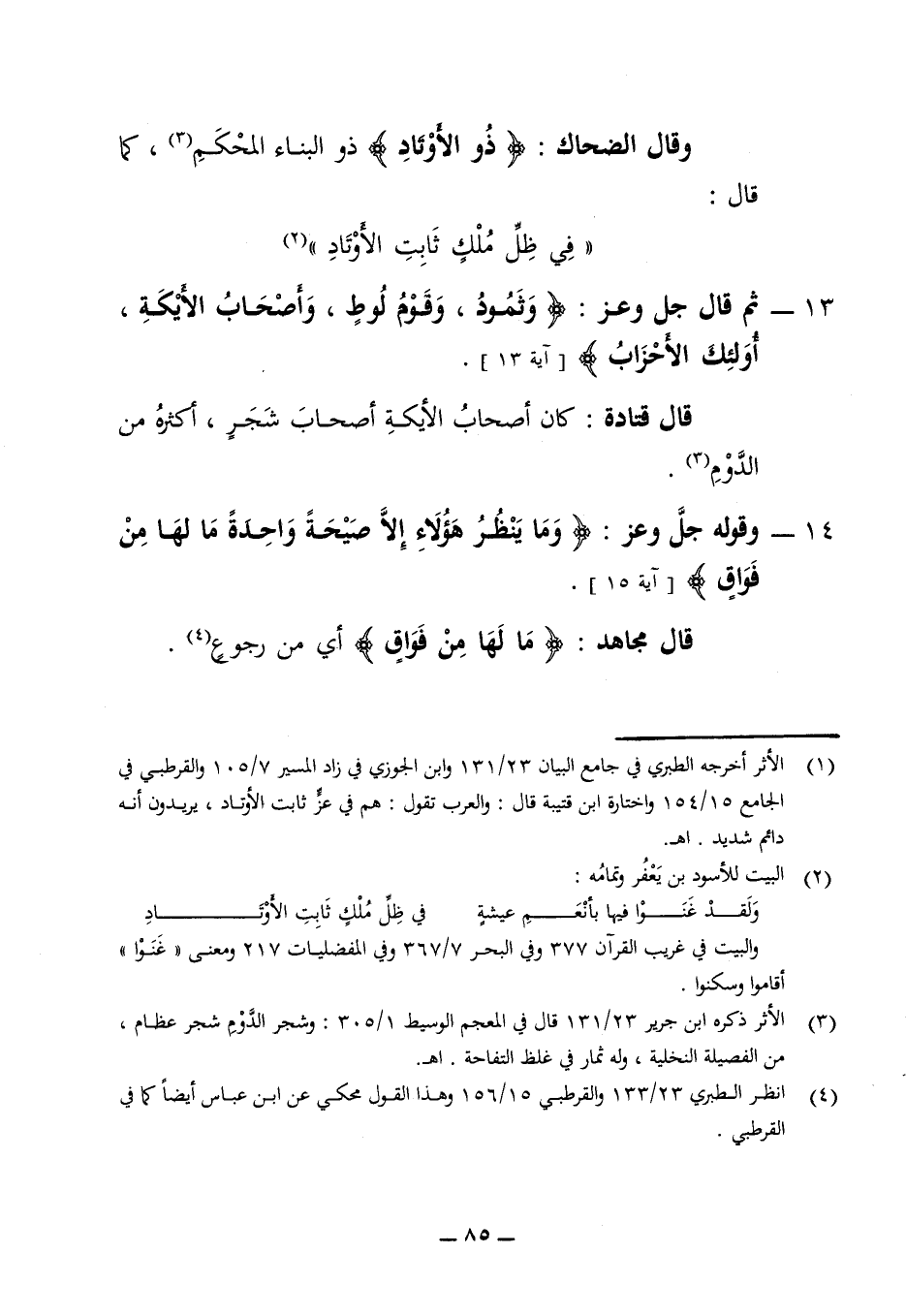 وقال الضحاك ذو الأوتاد ذو البناء المحكم كما قال: في ظل ملك ثابت الأوتاد 13 - ثم قال جل وعز (وثمود وقوم لوطو في أصحاب الأيكة