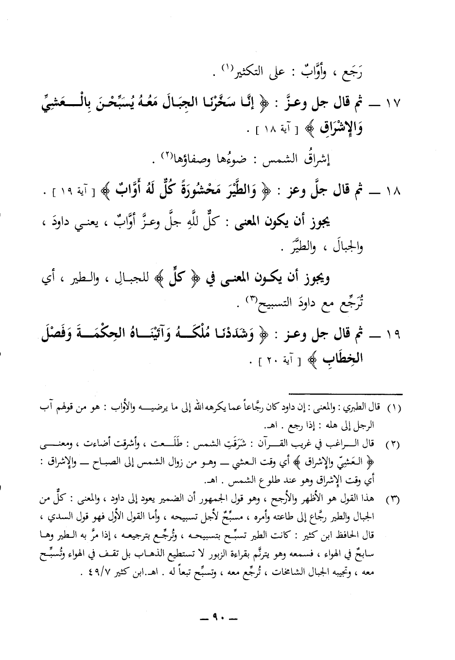 رجع وأواب على التكثير 17 - ثم قال جل وعز (إنا سخرنا الجبال معه يسبحن بالعشي والإشراق) (آية 18) إشراق الشمس ضوءها وصفاؤها 18 - ثم قال جل وعز (والطير محشورة كل له أواب) (آية 19) يجوز أن يكون المعنى كل لله جل وعز أواب يعني داود والجبال والطير ويجوز أن يكون المعنى في (كل) للجبال والطير أي ترجع مع داود التسبيح 19 - ثم قال جل وعز (وشددنا ملكه وآتيناه الحكمة وفصل الخطاب) (آية 20)