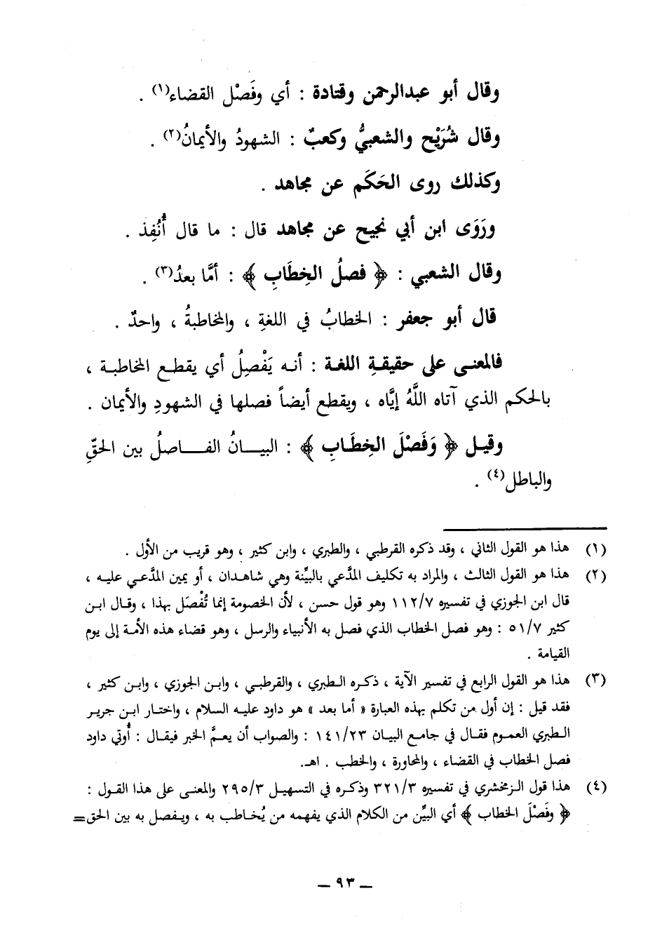 وقال أبو عبد الرحمن وقتادة أي وفصل القضاء وقال شريح والشعبي وكعب الشهود والأيمان وكذلك روى الحكم عن مجاهد وروى ابن أبي نجيح عن مجاهد قال ما قال أنفذ وقال الشعبي فصل الخطاب أما بعد قال أبو جعفر الخطاب في اللغة والمخاطبة واحد فالمعنى على حقيقة اللغة أنه يفصل أي يقطع المخاطبة