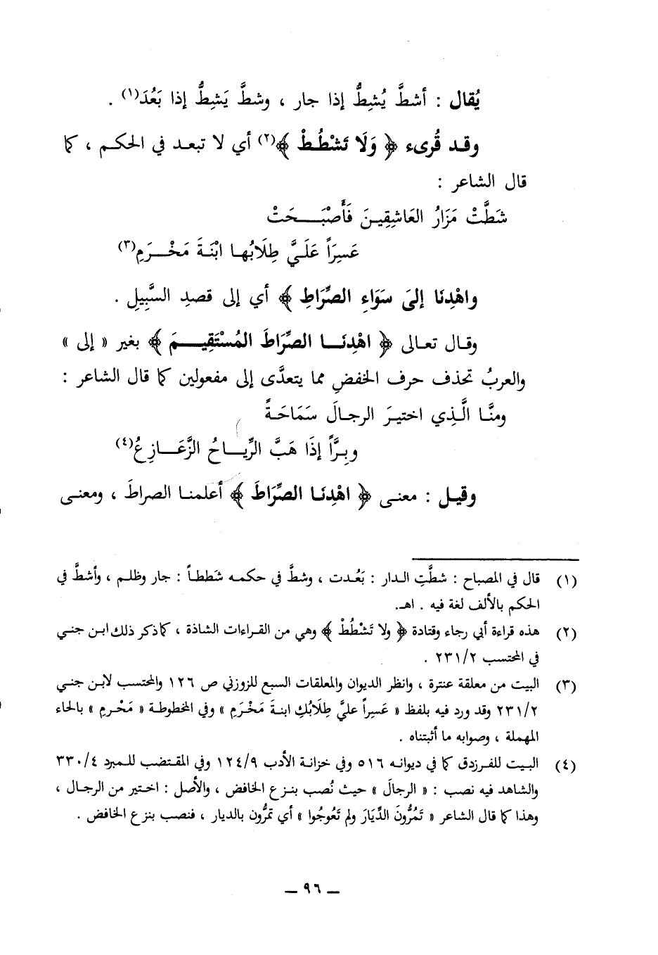 يقال أشط يشط إذا جار وشط يشط إذا بعد وقد قرى ولا تشطط أي لا تبعد في الحكم كما قال الشاعر: شطت مزار العاشقين فأصبحت * عسرا علي طلابها ابنة مخرم واهدنا إلى سواء الصراط أي إلى قصد السبيل وقال تعالى (اهدنا الصراط المستقيم) بغير إلى والعرب تحذف حرف الخفض مما يتعدى إلى مفعولين كما قال الشاعر: ومنا الذي اختير الرجال سماحة * وبرا إذا هب الرياح الزعازع وقيل معنى اهدنا الصراط أعلمنا الصراط ومعنى