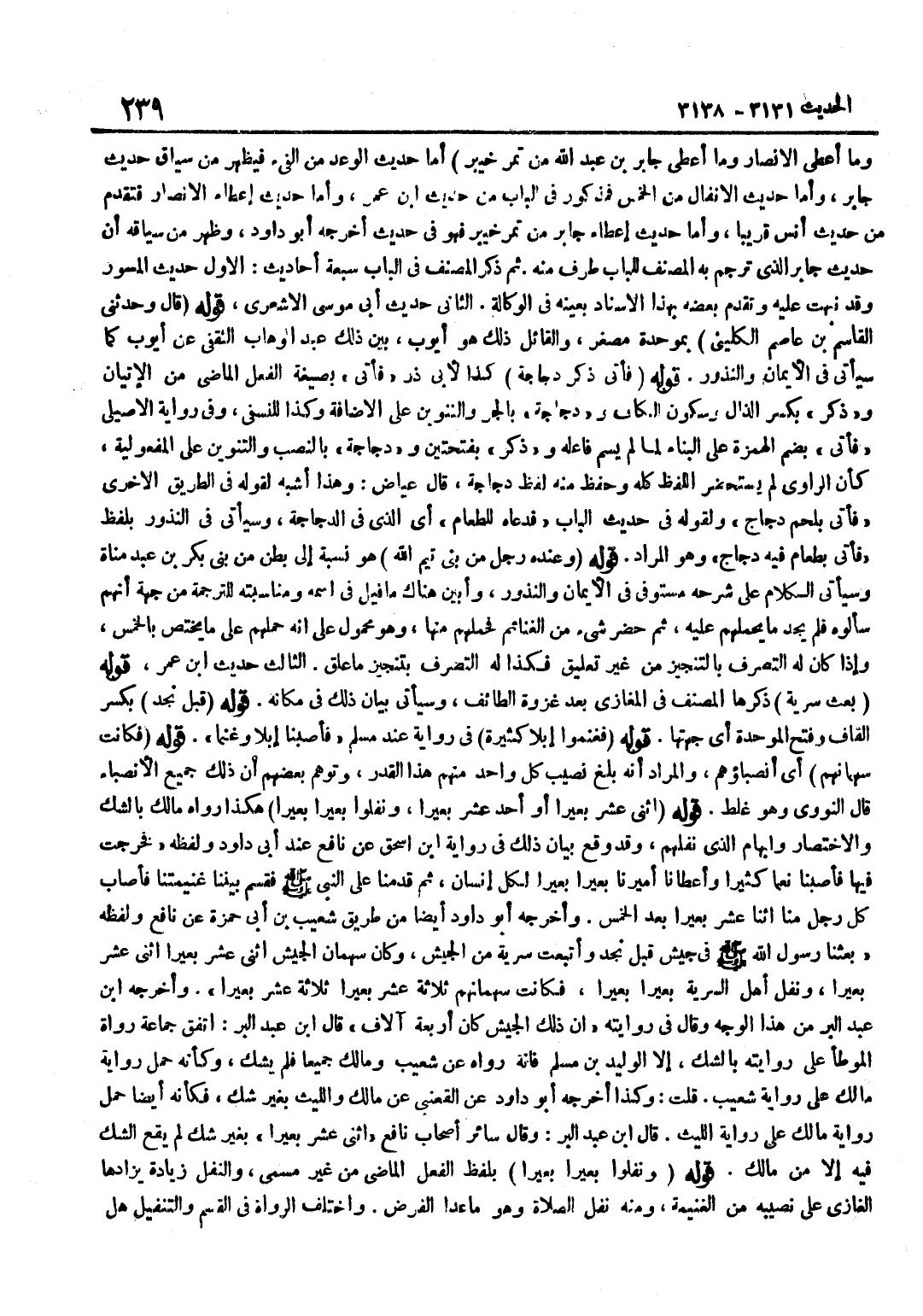 [3134] قَوْلُهُ بَعَثَ سَرِيَّةً ذَكَرَهَا الْمُصَنِّفُ فِي الْمَغَازِي بَعْدَ غَزْوَةِ الطَّائِفِ وَسَيَأْتِي بَيَانُ ذَلِكَ فِي مَكَانِهِ قَوْلُهُ قِبَلَ نَجْدٍ بِكَسْرِ الْقَافِ وَفَتْحِ الْمُوَحَّدَةِ أَيْ جِهَتَهَا قَوْلُهُ فَغَنِمُوا إِبِلًا كَثِيرَةً فِي رِوَايَةٍ عِنْدَ مُسْلِمٍ فَأَصَبْنَا إِبِلًا وَغنما قَوْله فَكَانَت سُهْمَانهمْ أَيْ أَنْصِبَاؤُهُمْ وَالْمُرَادُ أَنَّهُ بَلَغَ نَصِيبُ كُلِّ وَاحِدٍ مِنْهُمْ هَذَا الْقَدْرَ وَتَوَهَّمَ بَعْضُهُمْ أَنَّ ذَلِكَ جَمِيعُ الْأَنْصِبَاءِ قَالَ النَّوَوِيُّ وَهُوَ غَلَطٌ قَوْلُهُ اثْنَيْ عَشَرَ بَعِيرًا أَوْ أَحَدَ عَشَرَ بَعِيرًا ونفلوا بَعِيرًا بَعِيرًا هَكَذَا رَوَاهُ مَالك بِالشَّكِّ والاختصار وإبهام الَّذِي نَفَلَهُمْ وَقَدْ وَقَعَ بَيَانُ ذَلِكَ فِي رِوَايَة بن إِسْحَاقَ عنْ نَافِعٍ عِنْدَ أَبِي دَاوُدَ وَلَفْظُهُ فَخَرَجْتُ فِيهَا فَأَصَبْنَا نَعَمًا كَثِيرًا وَأَعْطَانَا أَمِيرُنَا بَعِيرًا بَعِيرًا لِكُلِّ إِنْسَانٍ ثُمَّ قَدِمْنَا عَلَى النَّبِيِّ صَلَّى اللَّهُ عَلَيْهِ وَسَلَّمَ فَقَسَمَ بَيْنَنَا غَنِيمَتَنَا فَأَصَابَ كُلَّ رَجُلٍ مِنَّا اثْنَا عَشَرَ بَعِيرًا بَعْدَ الْخُمُسِ وَأَخْرَجَهُ أَبُو دَاوُدَ أَيْضًا مِنْ طَرِيقِ شُعَيْبِ بْنِ أَبِي حَمْزَةَ عَنْ نَافِعٍ وَلَفْظُهُ بَعَثَنَا رَسُولُ اللَّهِ صَلَّى اللَّهُ عَلَيْهِ وَسَلَّمَ فِي جَيْشٍ قِبَلَ نَجْدٍ وَأَتْبَعْتُ سَرِيَّةً مِنَ الْجَيْشِ وَكَانَ سُهْمَانُ الْجَيْشِ اثْنَيْ عَشَرَ بَعِيرًا اثْنَيْ عَشَرَ بَعِيرًا وَنَفَلَ أَهْلَ السَّرِيَّةِ بَعِيرًا بَعِيرًا فَكَانَتْ سُهْمَانُهُمْ ثَلَاثَةَ عَشَرَ بَعِيرًا ثَلَاثَة عشر بَعِيرًا وَأخرجه بن عَبْدِ الْبَرِّ مِنْ هَذَا الْوَجْهِ وَقَالَ فِي رِوَايَتِهِ إِنَّ ذَلِكَ الْجَيْشَ كَانَ أَرْبَعَةَ آلَافٍ قَالَ بن عَبْدِ الْبَرِّ اتَّفَقَ جَمَاعَةُ رُوَاةِ الْمُوَطَّإِ عَلَى رِوَايَتِهِ بِالشَّكِّ إِلَّا الْوَلِيدَ بْنَ مُسْلِمٍ فَإِنَّهُ رَوَاهُ عَنْ شُعَيْبٍ وَمَالِكٍ جَمِيعًا فَلَمْ يَشُكَّ وَكَأَنَّهُ حَمَلَ رِوَايَةَ مَالِكٍ عَلَى رِوَايَةِ شُعَيْبٍ قُلْتُ وَكَذَا أَخْرَجَهُ أَبُو دَاوُدَ عَنِ الْقَعْنَبِيِّ عَنْ مَالِكٍ وَاللَّيْثِ بِغَيْرِ شَكٍّ فَكَأَنَّهُ أَيْضًا حَمَلَ رِوَايَةَ مَالِكٍ عَلَى رِوَايَةِ اللَّيْثِ قَالَ بن عَبْدِ الْبَرِّ وَقَالَ سَائِرُ أَصْحَابِ نَافِعٍ اثْنَيْ عَشَرَ بَعِيرًا بِغَيْرِ شَكٍّ لَمْ يَقَعِ الشَّكُّ فِيهِ إِلَّا مِنْ مَالِكٍ قَوْلُهُ وَنُفِّلُوا بَعِيرًا بَعِيرًا بِلَفْظِ الْفِعْلِ الْمَاضِي مِنْ غَيْرِ مُسَمًّى وَالنَّفَلُ زِيَادَةٌ يُزَادُهَا الْغَازِي عَلَى نَصِيبِهِ مِنَ الْغَنِيمَةِ وَمِنْهُ نَفْلُ الصَّلَاةِ وَهُوَ مَا عَدَا الْفَرْضَ وَاخْتَلَفَ الرُّوَاةُ فِي الْقَسْمِ وَالتَّنْفِيلِ هَلْ