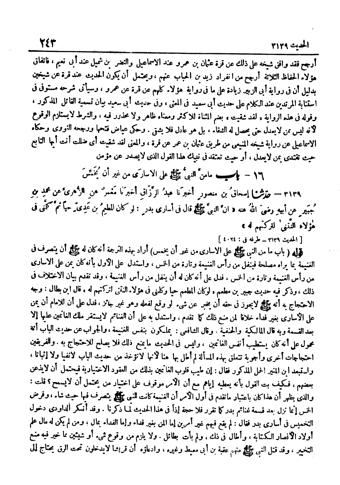 أَرَادَ بِهَذِهِ التَّرْجَمَةِ أَنَّهُ كَانَ لَهُ صَلَّى اللَّهُ عَلَيْهِ وَسَلَّمَ أَنْ يَتَصَرَّفَ فِي الْغَنِيمَةِ بِمَا يَرَاهُ مَصْلَحَةً فَيُنَفِّلَ مِنْ رَأْسِ الْغَنِيمَةِ وَتَارَةً مِنَ الْخُمُسِ وَاسْتَدَلَّ عَلَى الْأَوَّلِ بِأَنَّهُ كَانَ يَمُنُّ عَلَى الْأُسَارَى مِنْ رَأْسِ الْغَنِيمَةِ وَتَارَةً مِنَ الْخُمُسِ فَدَلَّ عَلَى أَنَّهُ كَانَ لَهُ أَنْ يُنَفِّلَ مِنْ رَأْسِ الْغَنِيمَةِ وَقَدْ تَقَدَّمَ بَيَانُ الِاخْتِلَافِ فِي ذَلِكَ وَذَكَرَ فِيهِ حَدِيثَ جُبَيْرِ بْنِ مُطْعِمٍ لَوْ كَانَ الْمُطْعِمُ حَيًّا وَكَلَّمَنِي فِي هَؤُلَاءِ النَّتْنَى لَتَرَكْتُهُمْ لَهُ قَالَ بن بَطَّالٍ وَجْهُ الِاحْتِجَاجِ بِهِ أَنَّهُ صَلَّى اللَّهُ عَلَيْهِ وَسَلَّمَ لَا يَجُوزُ فِي حَقِّهِ أَنْ يُخْبِرَ عَنْ شَيْءٍ لَوْ وَقَعَ لَفَعَلَهُ وَهُوَ غَيْرُ جَائِزٍ فَدَلَّ عَلَى أَنَّ لِلْإِمَامِ أَنْ يَمُنَّ عَلَى الْأُسَارَى بِغَيْرِ فِدَاءٍ خِلَافًا لِمَنْ مَنَعَ ذَلِكَ كَمَا تَقَدَّمَ وَاسْتُدِلَّ بِهِ عَلَى أَنَّ الْغَنَائِمَ لَا يَسْتَقِرُّ مِلْكُ الْغَانِمِينَ عَلَيْهَا إِلَّا بَعْدَ الْقِسْمَةِ وَبِهِ قَالَ الْمَالِكِيَّةُ وَالْحَنَفِيَّةُ وَقَالَ الشَّافِعِيُّ يَمْلِكُونَ بِنَفْسِ الْغَنِيمَةِ وَالْجَوَابُ عَنْ حَدِيثِ الْبَابِ أَنَّهُ مَحْمُولٌ عَلَى أَنَّهُ كَانَ يَسْتَطِيبُ أَنْفُسَ الْغَانِمِينَ وَلَيْسَ فِي الْحَدِيثِ مَا يَمْنَعُ ذَلِكَ فَلَا يَصْلُحُ لِلِاحْتِجَاجِ بِهِ وَلِلْفَرِيقَيْنِ احْتِجَاجَاتٌ أُخْرَى وَأَجْوِبَةٌ تَتَعَلَّقُ بِهَذِهِ الْمَسْأَلَةِ لَمْ أُطِلْ بِهَا هُنَا لِأَنَّهَا لَا تُؤْخَذُ مِنْ حَدِيثِ الْبَابِ لَا نَفْيًا وَلَا إِثْبَاتًا وَاسْتَبْعَدَ بن الْمُنِيرِ الْحَمْلَ الْمَذْكُورَ فَقَالَ إِنَّ طِيبَ قُلُوبِ الْغَانِمِينَ بِذَلِكَ مِنَ الْعُقُودِ الِاخْتِيَارِيَّةِ فَيُحْتَمَلُ أَنْ لَا يُذْعِنَ بَعْضُهُمْ فَكَيْفَ بَتَّ الْقَوْلَ بِأَنَّهُ يُعْطِيهِ إِيَّاهُمْ مَعَ أَنَّ الْأَمْرَ مَوْقُوفٌ عَلَى اخْتِيَارِ مَنْ يَحْتَمِلُ أَنْ لَا يَسْمَحَ قُلْتُ وَالَّذِي يَظْهَرُ أَنَّ هَذَا كَانَ بِاعْتِبَارِ مَا تَقَدَّمَ فِي أَوَّلِ الْأَمْرِ أَنَّ الْغَنِيمَةَ كَانَتْ لِلنَّبِيِّ صَلَّى اللَّهُ عَلَيْهِ وَسَلَّمَ يَتَصَرَّفُ فِيهَا حَيْثُ شَاءَ وَفَرْضُ الْخُمُسِ إِنَّمَا نَزَلَ بَعْدَ قِسْمَةِ غَنَائِمِ بَدْرٍ كَمَا تَقَرَّرَ فَلَا حُجَّةَ إِذًا فِي هَذَا الْحَدِيثِ لِمَا ذَكَرْنَا وَقَدْ أَنْكَرَ الدَّاوُدِيُّ دُخُولَ التَّخْمِيسِ فِي أُسَارَى بَدْرٍ فَقَالَ لَمْ يَقَعْ فِيهِمْ غَيْرُ أَمْرَيْنِ إِمَّا الْمَنُّ بِغَيْرِ فِدَاءٍ وَإِمَّا الْفِدَاءُ بِمَالٍ وَمَنْ لَمْ يَكُنْ لَهُ مَالٌ عَلَّمَ أَوْلَادَ الْأَنْصَارِ الْكِتَابَةَ وَأَطَالَ فِي ذَلِكَ وَلَمْ يَأْتِ بِطَائِلٍ وَلَا يَلْزَمُ مِنْ وُقُوعِ شَيْءٍ أَوْ شَيْئَيْنِ مِمَّا خُيِّرَ فِيهِ مَنْعُ التَّخْيِيرِ وَقَدْ قَتَلَ النَّبِيُّ صَلَّى اللَّهُ عَلَيْهِ وَسَلَّمَ مِنْهُمْ عُقْبَةَ بْنَ أَبِي مُعَيْطٍ وَغَيْرَهُ وَادِّعَاؤُهُ أَنَّ قُرَيْشًا لَا يَدْخُلُونَ تَحْتَ الرِّقِّ يَحْتَاجُ إِلَى