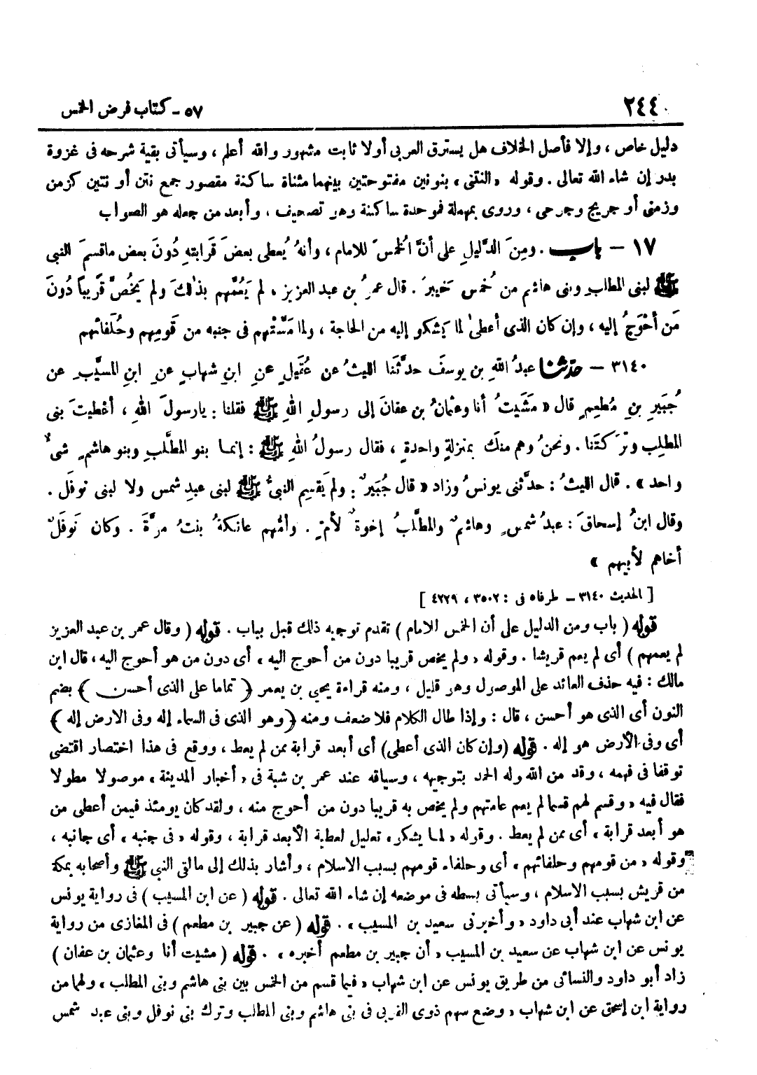 تَقَدَّمَ تَوْجِيهُ ذَلِكَ قَبْلُ بِبَابٍ قَوْلُهُ وَقَالَ عُمَرُ بْنُ عَبْدِ الْعَزِيزِ لَمْ يَعُمَّهُمْ أَيْ لَمْ يَعُمَّ قُرَيْشًا وَقَوْلُهُ وَلَمْ يَخُصَّ قَرِيبا دون من أَحْوَجُ إِلَيْهِ أَيْ دُونَ مَنْ هُوَ أَحْوَجُ إِلَيْهِ قَالَ بن مَالِكٍ فِيهِ حَذْفُ الْعَائِدِ عَلَى الْمَوْصُولِ وَهُوَ قَلِيلٌ وَمِنْهُ قِرَاءَةُ يَحْيَى بْنِ يَعْمُرَ تَمَامًا عَلَى الَّذِي أَحْسَنُ بِضَمِّ النُّونِ أَيِ الَّذِي هُوَ أَحْسَنُ قَالَ وَإِذَا طَالَ الْكَلَامُ فَلَا ضَعْفَ وَمِنْهُ وَهُوَ الَّذِي فِي السَّمَاءِ إِلَهٌ وَفِي الْأَرْضِ إِلَه أَيْ وَفِي الْأَرْضِ هُوَ إِلَهٌ قَوْلُهُ وَإِنْ كَانَ الَّذِي أَعْطَى أَيْ أَبْعَدَ قَرَابَةً مِمَّنْ لَمْ يُعْطِ وَوَقَعَ فِي هَذَا اخْتِصَارٌ اقْتَضَى توقفا فِي فَهْمِهِ وَقَدْ مَنَّ اللَّهُ وَلَهُ الْحَمْدُ بِتَوْجِيهِهِ وَسِيَاقُهُ عِنْدَ عُمَرَ بْنِ شَبَّةَ فِي أَخْبَارِ الْمَدِينَةِ مَوْصُولًا مُطَوَّلًا فَقَالَ فِيهِ وَقَسَمَ لَهُمْ قَسْمًا لَمْ يَعُمَّ عَامَّتَهُمْ وَلَمْ يَخُصَّ بِهِ قَرِيبًا دُونَ مَنْ أَحْوَجُ مِنْهُ وَلَقَدْ كَانَ يَوْمَئِذٍ فِيمَنْ أَعْطَى مَنْ هُوَ أَبْعَدُ قَرَابَةً أَيْ مِمَّنْ لَمْ يُعْطِ وَقَوْلُهُ لِمَا يَشْكُو تَعْلِيلٌ لِعَطِيَّةِ الْأَبْعَدِ قَرَابَةً وَقَوْلُهُ فِي جَنْبِهِ أَيْ جَانِبِهِ وَقَوْلُهُ مِنْ قَوْمِهِمْ وَحُلَفَائِهِمْ أَيْ وَحُلَفَاءِ قَوْمِهِمْ بِسَبَبِ الْإِسْلَامِ وَأَشَارَ بِذَلِكَ إِلَى مَا لَقِيَ النَّبِيُّ صَلَّى اللَّهُ عَلَيْهِ وَسَلَّمَ وَأَصْحَابُهُ بِمَكَّةَ مِنْ قُرَيْشٍ بِسَبَبِ الْإِسْلَامِ وَسَيَأْتِي بَسْطُهُ فِي مَوْضِعِهِ إِنْ شَاءَ اللَّهُ تَعَالَى