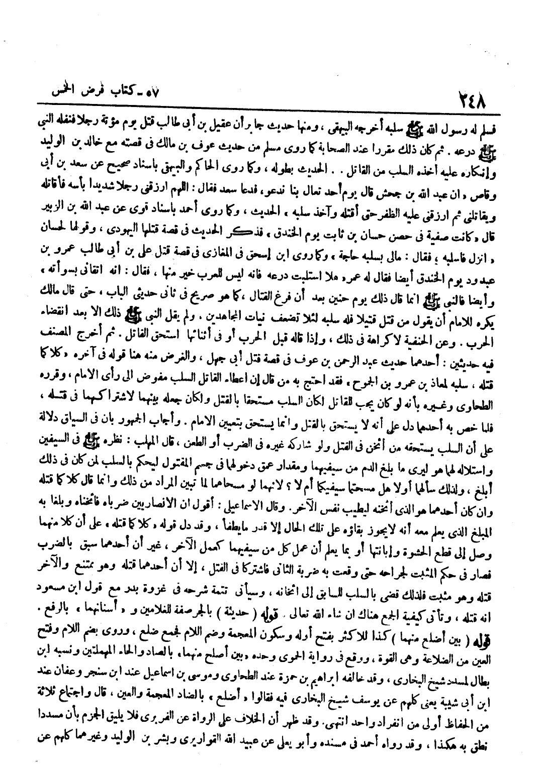 فَسَلَّمَ لَهُ رَسُولُ اللَّهِ صَلَّى اللَّهُ عَلَيْهِ وَسَلَّمَ سَلَبَهُ أَخْرَجَهُ الْبَيْهَقِيُّ وَمِنْهَا حَدِيثُ جَابِرٍ أَنَّ عَقِيلَ بْنَ أَبِي طَالِبٍ قَتَلَ يَوْمَ مُؤْتَةَ رَجُلًا فَنَفَلَهُ النَّبِيُّ صَلَّى اللَّهُ عَلَيْهِ وَسَلَّمَ دِرْعَهُ ثُمَّ كَانَ ذَلِكَ مُقَرَّرًا عِنْدَ الصَّحَابَةِ كَمَا رَوَى مُسْلِمٌ مِنْ حَدِيثِ عَوْفِ بْنِ مَالِكٍ فِي قِصَّتِهِ مَعَ خَالِدِ بْنِ الْوَلِيدِ وَإِنْكَارِهِ عَلَيْهِ أَخْذَهُ السَّلَبَ مِنَ الْقَاتِلِ الْحَدِيثَ بِطُولِهِ وَكَمَا رَوَى الْحَاكِمُ وَالْبَيْهَقِيُّ بِإِسْنَادٍ صَحِيحٍ عَنْ سَعْدِ بْنِ أَبِي وَقَّاصٍ أَنَّ عَبْدَ اللَّهِ بْنَ جَحْشٍ قَالَ يَوْمَ أُحُدٍ تَعَالَ بِنَا نَدْعُو فَدَعَا سَعْدٌ فَقَالَ اللَّهُمَّ ارْزُقْنِي رَجُلًا شَدِيدًا بَأْسُهُ فَأُقَاتِلُهُ وَيُقَاتِلُنِي ثُمَّ ارْزُقْنِي عَلَيْهِ الظَّفَرَ حَتَّى أَقْتُلَهُ وَآخُذَ سَلَبَهُ الْحَدِيثَ وَكَمَا رَوَى أَحْمَدُ بِإِسْنَادٍ قَوِيٍّ عَنْ عَبْدِ اللَّهِ بْنِ الزُّبَيْرِ قَالَ كَانَتْ صَفِيَّةُ فِي حِصْنِ حَسَّانَ بْنِ ثَابِتٍ يَوْمَ الْخَنْدَقِ فَذَكَرَ الْحَدِيثَ فِي قِصَّةِ قَتْلِهَا الْيَهُودِيَّ وَقَوْلِهَا لحسان انْزِلْ فاسلبه فَقَالَ مَالِي بسلبه حَاجَة وكما روى بن إِسْحَاقَ فِي الْمَغَازِي فِي قِصَّةِ قَتْلِ عَلِيِّ بْنِ أَبِي طَالِبٍ عَمْرَو بْنَ عَبْدِ وُدٍّ يَوْم الخَنْدَق أَيْضا فَقَالَ لَهُ عمر هَلَّا اسْتَلَبْتَ دِرْعَهُ فَإِنَّهُ لَيْسَ لِلْعَرَبِ خَيْرٌ مِنْهَا فَقَالَ إِنَّهُ اتَّقَانِي بِسَوْأَتِهِ وَأَيْضًا فَالنَّبِيُّ صَلَّى اللَّهُ عَلَيْهِ وَسَلَّمَ إِنَّمَا قَالَ ذَلِكَ يَوْمَ حُنَيْنٍ بَعْدَ أَنْ فَرَغَ الْقِتَالُ كَمَا هُوَ صَرِيحٌ فِي ثَانِي حَدِيثَيِ الْبَابِ حَتَّى قَالَ مَالِكٌ يُكْرَهُ لِلْإِمَامِ أَنْ يَقُولَ مَنْ قَتَلَ قَتِيلًا فَلَهُ سَلَبُهُ لِئَلَّا تَضْعُفَ نِيَّاتُ الْمُجَاهِدِينَ وَلَمْ يَقُلِ النَّبِيُّ صَلَّى اللَّهُ عَلَيْهِ وَسَلَّمَ ذَلِكَ إِلَّا بَعْدَ انْقِضَاءِ الْحَرْبِ وَعَنِ الْحَنَفِيَّةِ لَا كَرَاهَةَ فِي ذَلِكَ وَإِذَا نَالَهُ قَبْلَ الْحَرْبِ أَوْ فِي أَثْنَائِهَا اسْتَحَقَّ الْقَاتِلُ ثُمَّ أَخْرَجَ الْمُصَنِّفُ فِيهِ حَدِيثَيْنِ أَحَدُهُمَا حَدِيثُ عَبْدِ الرَّحْمَنِ بْنِ عَوْفٍ فِي قِصَّةِ قَتْلِ أَبِي جَهْلٍ وَالْغَرَضُ مِنْهُ هُنَا