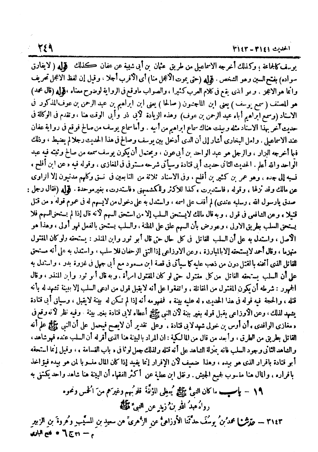 [3142] فِيهِ عَن بن أَفْلَحَ نَسَبَهُ إِلَى جَدِّهِ وَهُوَ عُمَرُ بْنُ كَثِيرِ بْنِ أَفْلَحَ وَفِي الْإِسْنَادِ ثَلَاثَةٌ مِنَ التَّابِعِينَ فِي نَسَقٍ وَكُلُّهُمْ مَدَنِيُّونَ إِلَّا الرَّاوِيَ عَنْ مَالِكٍ وَقَدْ نَزَلَهَا وَقَوْلُهُ فَاسْتَدْبَرْتُ كَذَا لِلْأَكْثَرِ وَلِلْكُشْمِيهَنِيِّ فَاسْتَدَرْتُ بِغَيْرِ مُوَحَّدَةٍ قَوْلُهُ فَقَالَ رَجُلٌ صَدَقَ يَا رَسُولَ اللَّهِ وَسَلَبُهُ عِنْدِي لَمْ أَقِفْ عَلَى اسْمِهِ وَاسْتُدِلَّ بِهِ عَلَى دُخُولِ مَنْ لَا يُسْهَمُ لَهُ فِي عُمُومِ قَوْلِهِ مَنْ قَتَلَ قَتِيلًا وَعَنِ الشَّافِعِيِّ فِي قَوْلٍ وَبِهِ قَالَ مَالِكٌ لَا يَسْتَحِقُّ السَّلَبَ إِلَّا مَنِ اسْتَحَقَّ السَّهْمَ لِأَنَّهُ قَالَ إِذَا لَمْ يَسْتَحِقَّ السَّهْمَ فَلَا يَسْتَحِقَّ السَّلَبَ بِطَرِيقِ الْأَوْلَى وَعُورِضَ بِأَنَّ السَّهْمَ عُلِّقَ عَلَى الْمَظِنَّةِ وَالسَّلَبُ يُسْتَحَقُّ بِالْفِعْلِ فَهُوَ أَوْلَى وَهَذَا هُوَ الْأَصْلُ وَاسْتُدِلَّ بِهِ عَلَى أَنَّ السَّلَبَ لِلْقَاتِلِ فِي كُلِّ حَالٍ حَتَّى قَالَ أَبُو ثَوْرٍ وبن الْمُنْذِرِ يَسْتَحِقُّهُ وَلَوْ كَانَ الْمَقْتُولُ مُنْهَزِمًا وَقَالَ أَحْمَدُ لَا يَسْتَحِقُّهُ إِلَّا بِالْمُبَارَزَةِ وَعَنِ الْأَوْزَاعِيِّ إِذَا الْتَقَى الزَّحْفَانِ فَلَا سَلَبَ وَاسْتُدِلَّ بِهِ عَلَى أَنَّهُ مُسْتَحَقٌّ لِلْقَاتِلِ الَّذِي أَثْخَنَهُ بِالْقَتْلِ دُونَ مَنْ ذَهَبَ عَلَيْهِ كَمَا سَيَأْتِي فِي قصَّة بن مَسْعُودٍ مَعَ أَبِي جَهْلٍ فِي غَزْوَةِ بَدْرٍ وَاسْتُدِلَّ بِهِ عَلَى أَنَّ السَّلَبَ يَسْتَحِقُّهُ الْقَاتِلُ مِنْ كُلِّ مَقْتُولٍ حَتَّى لَوْ كَانَ الْمَقْتُولُ امْرَأَة وَبِه قَالَ أَبُو ثَوْر وبن الْمُنْذِرِ وَقَالَ الْجُمْهُورُ شَرْطُهُ أَنْ يَكُونَ الْمَقْتُولُ مِنَ الْمُقَاتِلَةِ وَاتَّفَقُوا عَلَى أَنَّهُ لَا يُقْبَلُ قَوْلُ مَنِ ادَّعَى السَّلَبَ إِلَّا بِبَيِّنَةٍ تَشْهَدُ لَهُ بِأَنَّهُ قَتَلَهُ وَالْحُجَّةُ فِيهِ قَوْلُهُ فِي هَذَا الْحَدِيثِ لَهُ عَلَيْهِ بَيِّنَةٌ فَمَفْهُومُهُ أَنَّهُ إِذَا لَمْ تَكُنْ لَهُ بَيِّنَةٌ لَا يُقْبَلُ وَسِيَاقُ أَبِي قَتَادَةَ يَشْهَدُ لِذَلِكَ وَعَنِ الْأَوْزَاعِيِّ يُقْبَلُ قَوْلُهُ بِغَيْرِ بَيِّنَةٍ لِأَنَّ النَّبِيَّ صَلَّى اللَّهُ عَلَيْهِ وَسَلَّمَ أَعْطَاهُ لِأَبِي قَتَادَةَ بِغَيْرِ بَيِّنَةٍ وَفِيهِ نَظَرٌ لِأَنَّهُ وَقَعَ فِي مَغَازِي الْوَاقِدِيِّ أَنَّ أَوْسَ بْنَ خَوْلِيٍّ شَهِدَ لِأَبِي قَتَادَةَ وَعَلَى تَقْدِيرِ أَنْ لَا يَصِحَّ فَيُحْمَلُ عَلَى أَنَّ النَّبِيَّ صَلَّى اللَّهُ عَلَيْهِ وَسَلَّمَ عَلِمَ أَنَّهُ الْقَاتِلُ بِطَرِيقٍ مِنَ الطُّرُقِ وَأَبْعَدَ مَنْ قَالَ مِنَ الْمَالِكِيَّةِ أَنَّ الْمُرَادَ بِالْبَيِّنَةِ هُنَا الَّذِي أَقَرَّ لَهُ أَنَّ السَّلَبَ عِنْدَهُ فَهُوَ شَاهِدٌ وَالشَّاهِدُ الثَّانِي وُجُودُ السَّلَبِ فَإِنَّهُ بِمَنْزِلَةِ الشَّاهِدِ عَلَى أَنَّهُ قَتَلَهُ وَلِذَلِكَ جُعِلَ لَوْثًا فِي بَابِ الْقَسَامَةِ وَقِيلَ إِنَّمَا اسْتَحَقَّهُ أَبُو قَتَادَةَ بِإِقْرَارِ الَّذِي هُوَ بِيَدِهِ وَهذا ضَعِيفٌ لِأَنَّ الْإِقْرَارَ إِنَّمَا يُفِيدُ إِذَا كَانَ الْمَالُ مَنْسُوبًا لِمَنْ هُوَ بِيَدِهِ فَيُؤَاخَذُ بِإِقْرَارِهِ وَالْمَال هُنَا مَنْسُوب لجَمِيع الْجَيْش وَنقل بن عَطِيَّةَ عَنْ أَكْثَرِ الْفُقَهَاءِ أَنَّ الْبَيِّنَةَ هُنَا شَاهد وَاحِد يكْتَفى بِهِ