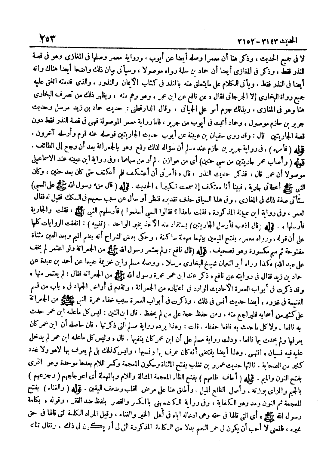 لَا فِي جَمِيعِ الْحَدِيثِ وَذَكَرَ هُنَا أَنَّ مَعْمَرًا وَصَلَهُ أَيْضًا عَنْ أَيُّوبَ وَرِوَايَةُ مَعْمَرٍ وَصَلَهَا فِي الْمَغَازِي وَهُوَ فِي قِصَّةِ النَّذْرِ فَقَطْ وَذَكَرَ فِي الْمَغَازِي أَيْضًا أَنَّ حَمَّادَ بْنَ سَلَمَةَ رَوَاهُ مَوْصُولًا وَسَيَأْتِي بَيَانُ ذَلِكَ وَاضِحًا أَيْضًا هُنَاكَ وَأَنَّهُ أَيْضًا فِي النَّذْرِ فَقَطْ وَيَأْتِي الْكَلَامُ عَلَى مَا يَتَعَلَّقُ مِنْهُ بِالنَّذْرِ فِي كِتَابِ الْأَيْمَانِ وَالنُّذُورِ وَالَّذِي قَدَّمْتُهُ اتَّفَقَ عَلَيْهِ جَمِيعُ رُوَاةِ الْبُخَارِيِّ إِلَّا الْجُرْجَانِيَّ فَقَالَ عَن نَافِع عَن بن عُمَرَ وَهُوَ وَهْمٌ مِنْهُ وَيَظْهَرُ ذَلِكَ مِنْ تَصَرُّفِ الْبُخَارِيِّ هُنَا وَهُوَ فِي الْمَغَازِي وَبِذَلِكَ جَزَمَ أَبُو عَلِيٍّ الْجَيَّانِيُّ وَقَالَ الدَّارَقُطْنِيُّ حَدِيثُ حَمَّادِ بْنِ زَيْدٍ مُرْسَلٌ وَحَدِيثُ جَرِيرِ بْنِ حَازِمٍ مَوْصُولٌ وَحَمَّادٌ أَثْبَتُ فِي أَيُّوبَ مِنْ جَرِيرٍ فَأَمَّا رِوَايَةُ مَعْمَرٍ الْمَوْصُولَةُ فَهِيَ فِي قِصَّةِ النَّذْرِ فَقَطْ دُونَ قِصَّةِ الْجَارِيَتَيْنِ قَالَ وَقَدْ رَوَى سُفْيَانُ بْنُ عُيَيْنَةَ عَنْ أَيُّوبَ حَدِيثَ الْجَارِيَتَيْنِ فَوَصَلَهُ عَنْهُ قَوْمٌ وَأَرْسَلَهُ آخَرُونَ قَوْلُهُ فَأَمَرَهُ فِي رِوَايَةِ جَرِيرِ بْنِ حَازِمٍ عِنْدَ مُسْلِمٍ أَنَّ سُؤَالَهُ لِذَلِكَ وَقَعَ وَهُوَ بِالْجِعِرَّانَةِ بَعْدَ أَنْ رَجَعَ إِلَى الطَّائِفِ قَوْلُهُ وَأَصَابَ عُمَرُ جَارِيَتَيْنِ مِنْ سَبْيِ حُنَيْنٍ أَيْ مِنْ هَوَازِنَ لَمْ أَرَ مَنْ سَمَّاهُمَا وَفِي رِوَايَة بن عُيَيْنَةَ عِنْدَ الْإِسْمَاعِيلِيِّ مَوْصُولًا أَنَّ عُمَرَ قَالَ فَذَكَرَ حَدِيثَ النَّذْرِ قَالَ فَأَمَرَنِي أَنْ أَعْتَكِفَ فَلَمْ أَعْتَكِفْ حَتَّى كَانَ بَعْدَ حُنَيْنٍ وَكَانَ النَّبِيُّ صَلَّى اللَّهُ عَلَيْهِ وَسَلَّمَ أَعْطَانِي جَارِيَةً فَبَيْنَا أَنَا مُعْتَكِفٌ إِذْ سَمِعْتُ تَكْبِيرًا الْحَدِيثَ قَوْلُهُ قَالَ مِنْ رَسُولِ اللَّهِ صَلَّى اللَّهُ عَلَيْهِ وَسَلَّمَ عَلَى السَّبْيِ سَتَأْتِي صِفَةُ ذَلِكَ فِي الْمَغَازِي وَفِي هَذَا السِّيَاقِ حَذْفٌ تَقْدِيرُهُ فَنَظَرَ أَوْ سَأَلَ عَنْ سَبَبِ سَعْيِهِمْ فِي السِّكَكِ فَقِيلَ لَهُ فَقَالَ لِعُمَرَ وَفِي رِوَايَةِ بن عُيَيْنَةَ الْمَذْكُورَةِ فَقُلْتُ مَا هَذَا فَقَالُوا السَّبْيُ أَسْلَمُوا فَأَرْسَلَهُمُ النَّبِيُّ صَلَّى اللَّهُ عَلَيْهِ وَسَلَّمَ فَقُلْتُ وَالْجَارِيَةُ فَأَرْسَلَهَا قَوْلُهُ قَالَ اذْهَبْ فَأَرْسِلِ الْجَارِيَتَيْنِ يُسْتَفَادُ مِنْهُ الْأَخْذُ بِخَبَرِ الْوَاحِدِ تَنْبِيهٌ اتَّفَقَتِ الرِّوَايَاتُ كُلُّهَا عَلَى أَنَّ قَوْلَهُ وَرَوَاهُ مَعْمَرٌ بِفَتْحِ الْمِيمَيْنِ بَيْنَهُمَا مُهْمَلَةٌ سَاكِنَةٌ وَحَكَى بَعْضُ الشُّرَّاحِ أَنَّهُ بِضَمِّ الْمِيمِ وَبَعْدَ الْعَيْنِ مُثَنَّاةٌ مَفْتُوحَةٌ ثُمَّ مِيمٌ مَكْسُورَةٌ وَهُوَ تَصْحِيفٌ قَوْلُهُ قَالَ نَافِعٌ وَلَمْ يَعْتَمِرْ رَسُولِ اللَّهِ صَلَّى اللَّهُ عَلَيْهِ وَسَلَّمَ مِنَ الْجِعِرَّانَةِ وَلَوِ اعْتَمَرَ لَمْ يَخْفَ عَلَى عَبْدِ اللَّهِ هَكَذَا رَوَاهُ أَبُو النُّعْمَانِ شَيْخُ الْبُخَارِيِّ مُرْسَلًا وَوَصَلَهُ مُسلم وبن خُزَيْمَةَ جَمِيعًا عَنْ أَحْمَدَ بْنِ عَبْدَةَ عَنْ حَمَّادِ بْنِ زَيْدٍ فَقَالَ فِي رِوَايَتِهِ عَنْ نَافِع ذكر عِنْد بن عُمَرَ عُمْرَةَ رَسُولِ اللَّهِ صَلَّى اللَّهُ عَلَيْهِ وَسَلَّمَ مِنَ الْجِعِرَّانَةِ فَقَالَ لَمْ يَعْتَمِرْ مِنْهَا وَقد ذكرت فِي أَبْوَاب الْعمرَة الْأَحَادِيث الْوَارِد فِي اعْتِمَارِهِ مِنَ الْجِعِرَّانَةِ وَتَقَدَّمَ فِي أَوَاخِرِ الْجِهَادِ فِي بَابِ مَنْ قَسَمَ الْغَنِيمَةَ ف
