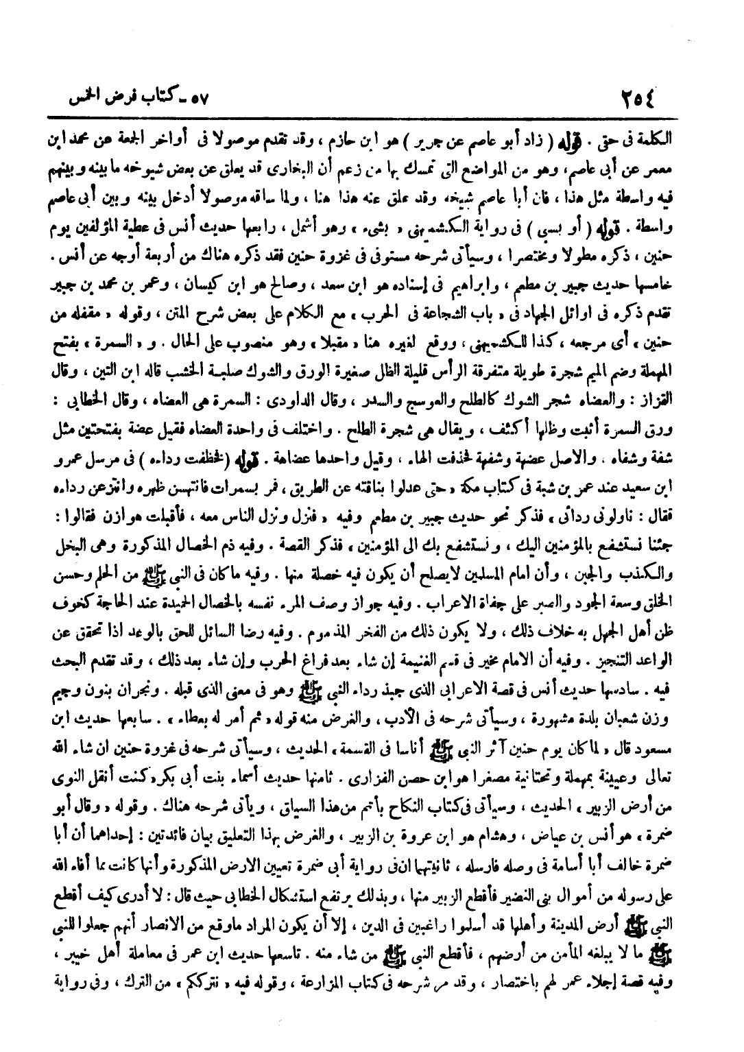 الْكَلِمَةُ فِي حَقِّي قَوْلُهُ زَادَ أَبُو عَاصِمٍ عَن جرير هُوَ بن حَازِمٍ وَقَدْ تَقَدَّمَ مَوْصُولًا فِي أَوَاخِرِ الْجُمُعَةِ عَنْ مُحَمَّدِ بْنِ مَعْمَرٍ عَنْ أَبِي عَاصِمٍ وَهُوَ مِنَ الْمَوَاضِعِ الَّتِي تَمَسَّكَ بِهَا مَنْ زَعَمَ أَنَّ الْبُخَارِيَّ قَدْ يُعَلِّقُ عَنْ بَعْضِ شُيُوخِهِ مَا بَيْنَهُ وَبَيْنَهُمْ فِيهِ وَاسِطَةٌ مِثْلَ هَذَا فَإِنَّ أَبَا عَاصِمٍ شَيْخُهُ وَقَدْ عَلَّقَ عَنْهُ هَذَا هُنَا وَلَمَّا سَاقَهُ مَوْصُولًا أَدْخَلَ بَيْنَهُ وَبَيْنَ أَبِي عَاصِمٍ وَاسِطَةً قَوْلُهُ أَوْ بِسَبْيٍ فِي رِوَايَةِ الْكُشْمِيهَنِيِّ بِشَيْءٍ وَهُوَ أَشْمَلُ رَابِعُهَا حَدِيثُ أَنَسٍ فِي عَطِيَّةِ الْمُؤَلَّفِينَ يَوْمَ حُنَيْنٍ ذَكَرَهُ مُطَوَّلًا وَمُخْتَصَرًا وَسَيَأْتِي شَرْحُهُ مُسْتَوْفًى فِي غَزْوَةِ حُنَيْنٍ فَقَدْ ذَكَرَهُ هُنَاكَ مِنْ أَرْبَعَة أوجه عَن أنس خَامِسُهَا حَدِيثُ جُبَيْرِ بْنِ مُطْعِمٍ وَإِبْرَاهِيمَ فِي إِسْنَاده هُوَ بن سعد وَصَالح هُوَ بن كَيْسَانَ وَعُمَرُ بْنُ مُحَمَّدِ بْنِ جُبَيْرٍ تَقَدَّمَ ذِكْرُهُ فِي أَوَائِلِ الْجِهَادِ فِي بَابِ الشَّجَاعَةِ فِي الْحَرْبِ مَعَ الْكَلَامِ عَلَى بَعْضِ شَرْحِ الْمَتْنِ وَقَوْلُهُ مَقْفَلَهُ مِنْ حُنَيْنٍ أَيْ مَرْجِعَهُ كَذَا لِلْكُشْمِيهَنِيِّ وَوَقَعَ لِغَيْرِهِ هُنَا مُقْبِلًا وَهُوَ مَنْصُوب على الْحَال والسمرة بِفَتْحِ الْمُهْمَلَةِ وَضَمِّ الْمِيمِ شَجَرَةٌ طَوِيلَةٌ مُتَفَرِّقَةُ الرَّأْسِ قَلِيلَةُ الظِّلِّ صَغِيرَةُ الْوَرَقِ وَالشَّوْكِ صُلْبَةُ الْخشب قَالَه بن التِّينِ وَقَالَ الْقَزَّازُ وَالْعِضَاهُ شَجَرُ الشَّوْكِ كَالطَّلْحِ وَالْعَوْسَجِ وَالسِّدْرِ وَقَالَ الدَّاوُدِيُّ السَّمُرَةُ هِيَ الْعِضَاهُ وَقَالَ الْخَطَّابِيُّ وَرَقُ السَّمُرَةِ أَثْبَتُ وَظِلُّهَا أَكْثَفُ وَيُقَالُ هِيَ شَجَرَةُ الطَّلْحِ وَاخْتُلِفَ فِي وَاحِدَةِ الْعِضَاهِ فَقِيلَ عَضَةٌ بِفَتْحَتَيْنِ مِثْلُ شَفَةٍ وَشِفَاهُ وَالْأَصْلُ عَضْهَةٌ وَشَفَهَةٌ فَحُذِفَتِ الْهَاءُ وَقِيلَ وَاحِدُهَا عِضَاهَةٌ