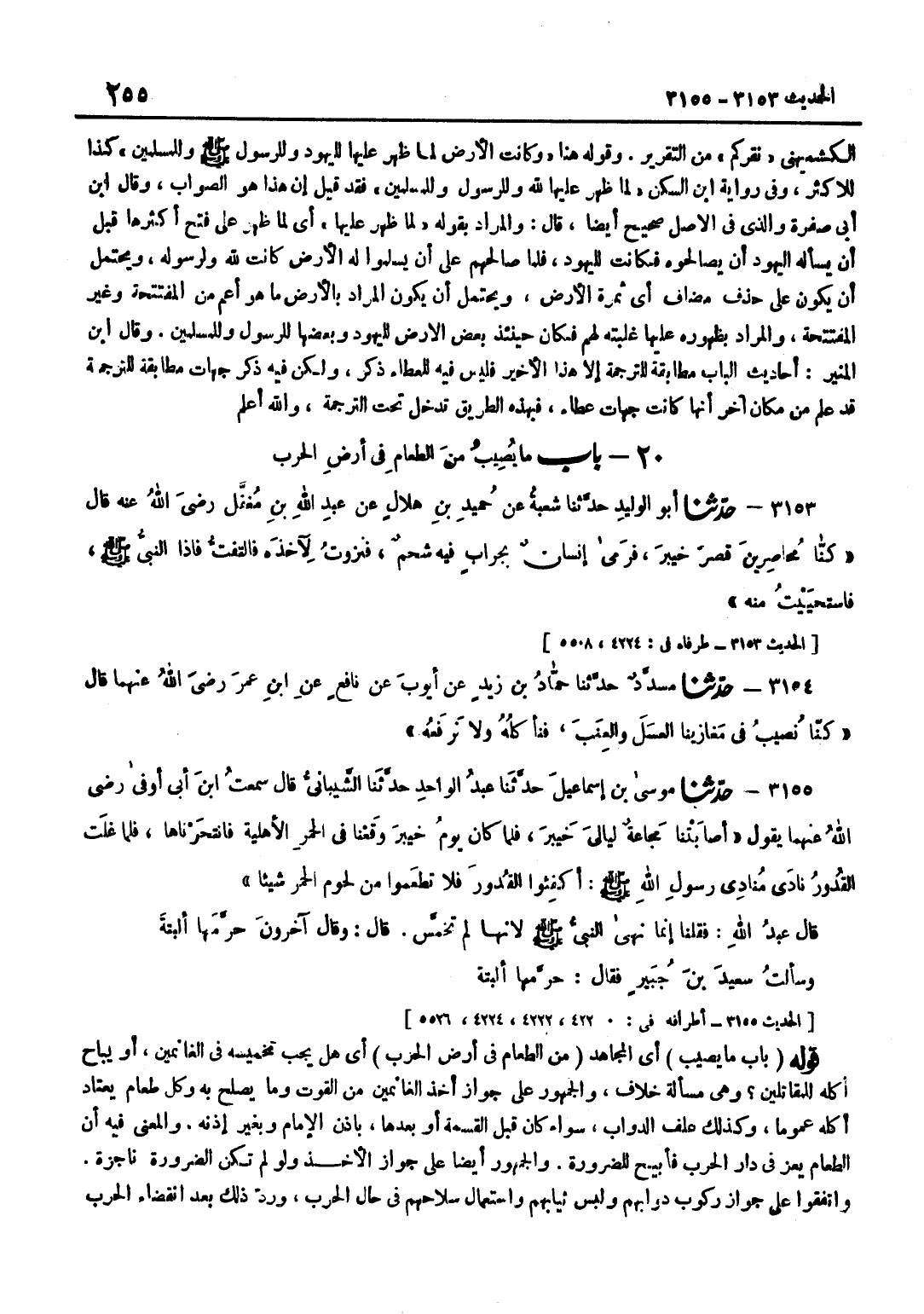 [3152] هُنَا وَكَانَتِ الْأَرْضُ لَمَّا ظَهَرَ عَلَيْهَا لِلْيَهُودِ وَلِلرَّسُولِ صَلَّى اللَّهُ عَلَيْهِ وَسَلَّمَ وَلِلْمُسْلِمِينَ كَذَا للْأَكْثَر وَفِي رِوَايَة بن السَّكَنِ لَمَّا ظَهَرَ عَلَيْهَا لِلَّهِ وَلِلرَّسُولِ وَلِلْمُسْلِمِينَ فَقَدْ قِيلَ إِنَّ هَذَا هُوَ الصَّوَابُ وَقَالَ بن أَبِي صُفْرَةَ وَالَّذِي فِي الْأَصْلِ صَحِيحٌ أَيْضًا قَالَ وَالْمُرَادُ بِقَوْلِهِ لَمَّا ظَهَرَ عَلَيْهَا أَيْ لَمَّا ظَهَرَ عَلَى فَتْحِ أَكْثَرِهَا قَبْلَ أَنْ يَسْأَلَهُ الْيَهُودُ أَنْ يُصَالِحُوهُ فَكَانَتْ لِلْيَهُودِ فَلَمَّا صَالَحَهُمْ عَلَى أَنْ يُسَلِّمُوا لَهُ الْأَرْضَ كَانَتْ لِلَّهِ وَلِرَسُولِهِ وَيَحْتَمِلُ أَنْ يَكُونَ عَلَى حَذْفِ مُضَافٍ أَيْ ثَمَرَةِ الْأَرْضِ وَيُحْتَمَلُ أَنْ يَكُونَ الْمُرَادُ بِالْأَرْضِ مَا هُوَ أَعَمُّ مِنَ الْمُفْتَتَحَةِ وَغَيْرِ الْمُفْتَتَحَةِ وَالْمُرَادُ بِظُهُورِهِ عَلَيْهَا غَلَبَتُهُ لَهُمْ فَكَانَ حِينَئِذٍ بَعْضُ الْأَرْضِ لِلْيَهُودِ وَبَعْضُهَا لِلرَّسُولِ وللمسلمين وَقَالَ بن الْمُنِيرِ أَحَادِيثُ الْبَابِ مُطَابِقَةٌ لِلتَّرْجَمَةِ إِلَّا هَذَا الْأَخِيرَ فَلَيْسَ فِيهِ لِلْعَطَاءِ ذِكْرٌ وَلَكِنْ فِيهِ ذِكْرُ جِهَاتٍ مُطَابِقَةٍ لِلتَّرْجَمَةِ قَدْ عُلِمَ مِنْ مَكَانٍ آخَرَ أَنَّهَا كَانَتْ جِهَاتُ عَطَاءٍ فَبِهَذِهِ الطَّرِيق تدخل تَحت التَّرْجَمَة وَالله أعلم
