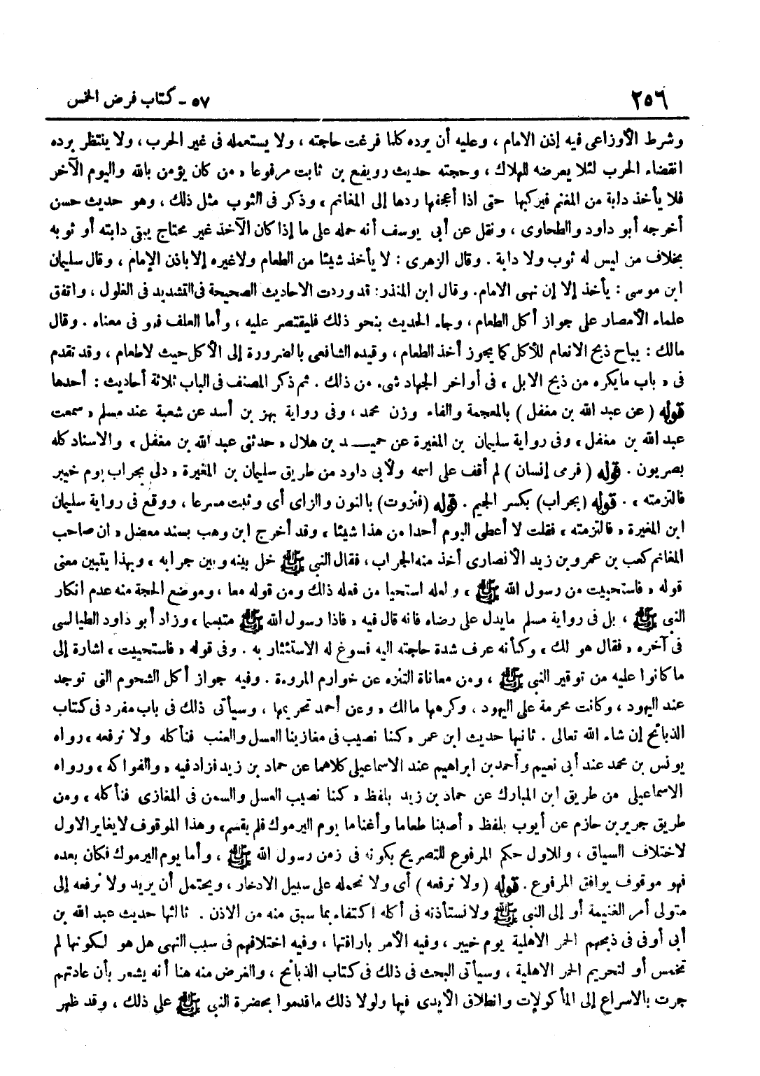 وَشَرَطَ الْأَوْزَاعِيُّ فِيهِ إِذْنَ الْإِمَامِ وَعَلَيْهِ أَنْ يَرُدَّهُ كُلَّمَا فَرَغَتْ حَاجَتُهُ وَلَا يَسْتَعْمِلَهُ فِي غَيْرِ الْحَرْبِ وَلَا يَنْتَظِرُ بِرَدِّهِ انْقِضَاءَ الْحَرْبِ لِئَلَّا يُعَرِّضَهُ لِلْهَلَاكِ وَحُجَّتُهُ حَدِيثُ رُوَيْفِعِ بْنِ ثَابِتٍ مَرْفُوعًا مَنْ كَانَ يُؤْمِنُ بِاللَّهِ وَالْيَوْمِ الْآخِرِ فَلَا يَأْخُذْ دَابَّةً مِنَ الْمَغْنَمِ فَيَرْكَبَهَا حَتَّى إِذَا أَعْجَفَهَا رَدَّهَا إِلَى الْمَغَانِمِ وَذَكَرَ فِي الثَّوْبِ مِثْلَ ذَلِكَ وَهُوَ حَدِيثٌ حَسَنٌ أَخْرَجَهُ أَبُو دَاوُدَ وَالطَّحَاوِيُّ وَنُقِلَ عَنْ أَبِي يُوسُفَ أَنَّهُ حَمَلَهُ عَلَى مَا إِذَا كَانَ الْآخِذُ غَيْرَ مُحْتَاجٍ يُبْقِي دَابَّتَهُ أَوْ ثَوْبَهُ بِخِلَافِ مَنْ لَيْسَ لَهُ ثَوْبٌ وَلَا دَابَّةٌ وَقَالَ الزُّهْرِيُّ لَا يَأْخُذْ شَيْئًا مِنَ الطَّعَامِ وَلَا غَيْرِهِ إِلَّا بِإِذْنِ الْإِمَامِ وَقَالَ سُلَيْمَانُ بْنُ مُوسَى يَأْخُذُ إِلَّا إِنْ نَهَى الْإِمَامُ وَقَالَ بن الْمُنْذِرِ قَدْ وَرَدَتِ الْأَحَادِيثُ الصَّحِيحَةُ فِي التَّشْدِيدِ فِي الْغُلُولِ وَاتَّفَقَ عُلَمَاءُ الْأَمْصَارِ عَلَى جَوَازِ أَكْلِ الطَّعَامِ وَجَاءَ الْحَدِيثُ بِنَحْوِ ذَلِكَ فَلْيُقْتَصَرْ عَلَيْهِ وَأَمَّا الْعَلَفُ فَهُوَ فِي مَعْنَاهُ وَقَالَ مَالِكٌ يُبَاحُ ذَبْحُ الْأَنْعَامِ لِلْأَكْلِ كَمَا يَجُوزُ أَخْذُ الطَّعَامِ وَقَيَّدَهُ الشَّافِعِيُّ بِالضَّرُورَةِ إِلَى الْأَكْلِ حَيْثُ لَا طَعَامَ وَقَدْ تَقَدَّمَ فِي بَابِ مَا يُكْرَهُ مِنْ ذَبْحِ الْإِبِلِ فِي أَوَاخِرِ الْجِهَادِ شَيْءٌ مِنْ ذَلِكَ ثُمَّ ذَكَرَ الْمُصَنِّفُ فِي الْبَابِ ثَلَاثَةَ أَحَادِيثَ أَحَدُهَا قَوْلُهُ عَنْ عَبْدِ اللَّهِ بْنِ مُغَفَّلٍ بِالْمُعْجَمَةِ وَالْفَاءِ وَزْنُ مُحَمَّدٍ وَفِي رِوَايَةِ بَهْزِ بْنِ أَسَدٍ عَنْ شُعْبَةَ عِنْدَ مُسْلِمٍ سَمِعْتُ عَبْدَ اللَّهِ بْنَ مُغَفَّلٍ وَفِي رِوَايَةِ سُلَيْمَانَ بْنِ الْمُغِيرَةِ عَنْ حُمَيْدِ بْنِ هِلَالٍ حَدَّثَنِي عَبْدُ اللَّهِ بْنُ مُغَفَّلٍ وَالْإِسْنَادُ كُلُّهُ بَصْرِيُّونَ