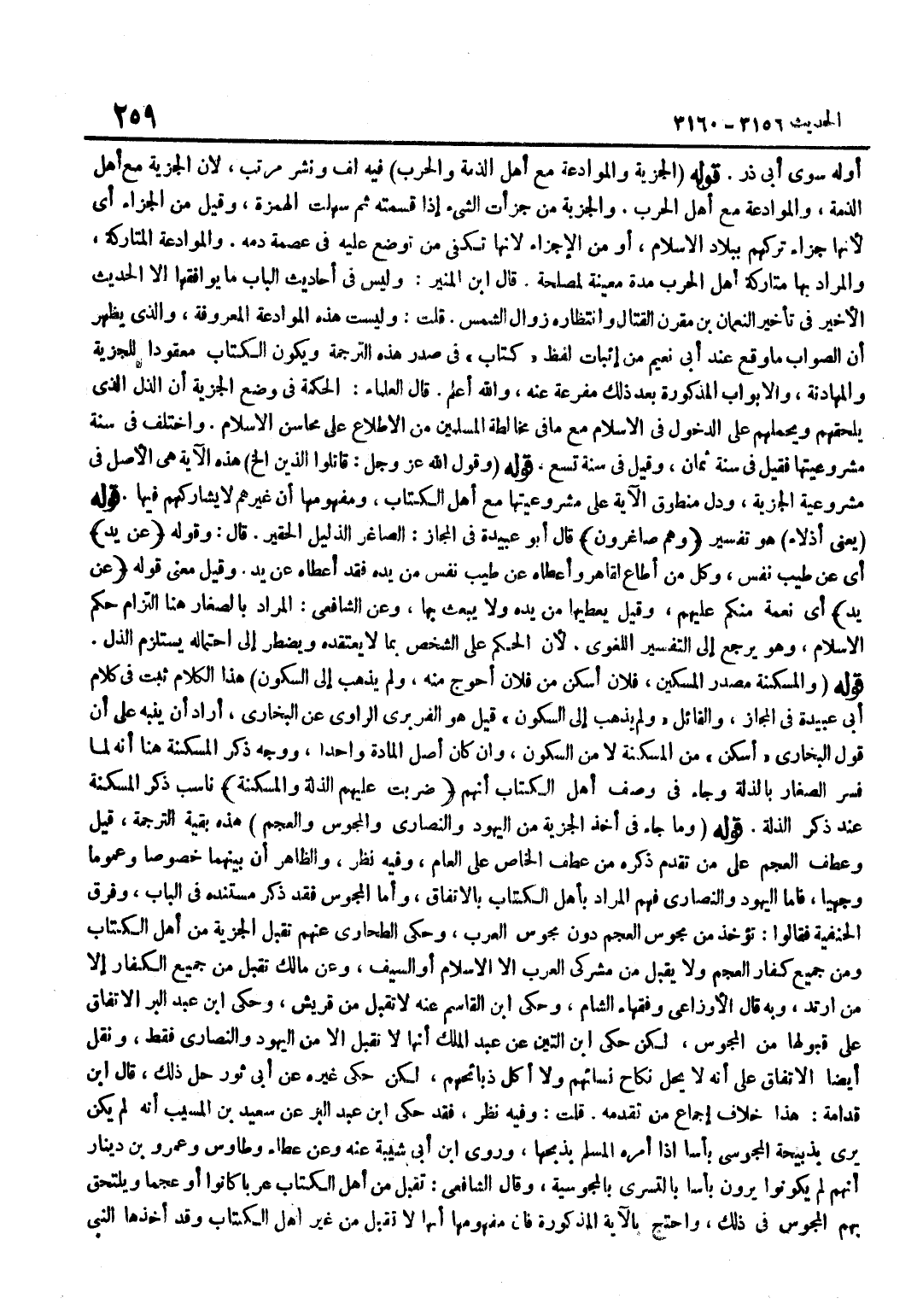 فِيهِ لَفٌّ وَنَشْرٌ مُرَتَّبٌ لِأَنَّ الْجِزْيَةَ مَعَ أَهْلِ الذِّمَّةِ وَالْمُوَادَعَةَ مَعَ أَهْلِ الْحَرْبِ وَالْجِزْيَةُ مِنْ جَزَّأْتُ الشَّيْءَ إِذَا قَسَّمْتُهُ ثُمَّ سُهِّلَتِ الْهَمْزَةُ وَقِيلَ مِنَ الْجَزَاءِ أَيْ لِأَنَّهَا جَزَاءُ تَرْكِهِمْ بِبِلَادِ الْإِسْلَامِ أَوْ مِنَ الْإِجْزَاءِ لِأَنَّهَا تَكْفِي مَنْ تُوضَعُ عَلَيْهِ فِي عِصْمَةِ دَمِهِ وَالْمُوَادَعَةُ الْمُتَارَكَةُ وَالْمُرَادُ بِهَا مُتَارَكَةُ أَهْلِ الْحَرْبِ مُدَّةً مُعَيَّنَةً لِمَصْلَحَةٍ قَالَ بن الْمُنِيرِ وَلَيْسَ فِي أَحَادِيثِ الْبَابِ مَا يُوَافِقُهَا إِلَّا الْحَدِيثُ الْأَخِيرُ فِي تَأْخِيرِ النُّعْمَانِ بْنِ مُقَرِّنٍ الْقِتَالَ وَانْتِظَارِهِ زَوَالَ الشَّمْسِ قُلْتُ وَلَيْسَتْ هَذِهِ الْمُوَادَعَةُ الْمَعْرُوفَةُ وَالَّذِي يَظْهَرُ أَنَّ الصَّوَابَ مَا وَقَعَ عِنْدَ أَبِي نُعَيْمٍ مِنْ إِثْبَاتِ لَفْظِ كِتَابٍ فِي صَدْرِ هَذِهِ التَّرْجَمَةِ وَيَكُونُ الْكِتَابُ مَعْقُودًا لِلْجِزْيَةِ وَالْمُهَادَنَةِ وَالْأَبْوَابُ الْمَذْكُورَةُ بَعْدَ ذَلِكَ مُفَرَّعَةٌ عَنْهُ وَاللَّهُ أَعْلَمُ قَالَ الْعُلَمَاءُ الْحِكْمَةُ فِي وَضْعِ الْجِزْيَةِ أَنَّ الذُّلَّ الَّذِي يَلْحَقُهُمْ وَيَحْمِلُهُمْ عَلَى الدُّخُولِ فِي الْإِسْلَامِ مَعَ مَا فِي مُخَالَطَةِ الْمُسْلِمِينَ مِنَ الِاطِّلَاعِ عَلَى مَحَاسِنِ الْإِسْلَامِ وَاخْتُلِفَ فِي سَنَةِ مَشْرُوعِيَّتِهَا فَقِيلَ فِي سَنَةِ ثَمَانٍ وَقِيلَ فِي سَنَةِ تِسْعٍ قَوْلُهُ وَقَوْلُ اللَّهِ عَزَّ وَجَلَّ قَاتِلُوا الَّذِينَ إِلَخْ هَذِهِ الْآيَةُ هِيَ الْأَصْلُ فِي مَشْرُوعِيَّةِ الْجِزْيَةِ وَدَلَّ مَنْطُوقُ الْآيَةِ عَلَى مَشْرُوعِيَّتِهَا مَعَ أَهْلِ الْكِتَابِ وَمَفْهُومُهَا أَنَّ غَيْرَهُمْ لَا يُشَارِكُهُمْ فِيهَا قَوْلُهُ يَعْنِي أَذِلَّاءَ هُوَ تَفْسِيرُ وَهُمْ صَاغِرُونَ قَالَ أَبُو عُبَيْدَةَ فِي الْمَجَازِ الصَّاغِرُ الذَّلِيلُ الْحَقِيرُ قَالَ وَقَوْلُهُ عَنْ يَدٍ أَيْ عَنْ طِيبِ نَفْسٍ وَكُلُّ مَنْ أَطَاعَ لِقَاهِرٍ وَأَعْطَاهُ عَن طيب نفس من يَده فَقَدْ أَعْطَاهُ عَنْ يَدٍ وَقِيلَ مَعْنَى قَوْلِهِ عَنْ يَدٍ أَيْ نِعْمَةٍ مِنْكُمْ عَلَيْهِمْ وَقِيلَ يُعْطِيهَا مِنْ يَدِهِ وَلَا يَبْعَثُ بِهَا وَعَنِ الشَّافِعِيِّ الْمُرَادُ بِالصَّغَارِ هُنَا الْتِزَامُ حُكْمِ الْإِسْلَامِ وَهُوَ يَرْجِعُ إِلَى التَّفْسِيرِ اللُّغَوِيِّ لِأَنَّ الْحُكْمَ عَلَى الشَّخْصِ بِمَا لَا يَعْتَقِدُهُ وَيُضْطَرُّ إِلَى احْتِمَالِهِ يَسْتَلْزِمُ الذُّلَّ قَوْلُهُ وَالْمَسْكَنَةُ مَصْدَرُ الْمِسْكِينِ فُلَانٌ أَسْكَنُ مِنْ فُلَانٍ أَحْوَجُ مِنْهُ وَلَمْ يَذْهَبْ إِلَى السُّكُونِ هَذَا الْكَلَامُ ثَبَتَ فِي كَلَامِ أَبِي عُبَيْدَةَ فِي الْمَجَازِ وَالْقَائِلُ وَلَمْ يَذْهَبْ إِلَى السُّكُونِ قِيلَ هُوَ الْفَرَبْرِيُّ الرَّاوِي عَنِ الْبُخَارِيِّ أَرَادَ أَنْ يُنَبِّهَ عَلَى أَنَّ قَوْلَ الْبُخَارِيِّ أَسْكَنُ مِنَ الْمَسْكَنَةِ لَا مِنَ السُّكُونِ وَإِنْ كَانَ أَصْلُ الْمَادَّةِ وَاحِدًا وَوَجْهُ ذِكْرِ الْمَسْكَنَةِ هُنَا أَنَّهُ لَمَّا فَسَّرَ الصَّغَارَ بِالذِّلَّةِ وَجَاءَ فِي وَصْفِ أَهْلِ الْكِتَابِ أَنَّهُمْ ضربت عَلَيْهِم الذلة والمسكنة نَاسَبَ ذِكْرَ الْمَسْكَنَةِ عِنْدَ ذِكْرِ الذِّلَّةِ قَوْلُهُ وَمَا جَاءَ فِي أَخْذِ الْجِزْيَةِ مِنَ الْيَهُودِ وَالنَّصَارَى وَالْمَجُوسِ وَالْعَجَمِ هَذِهِ بَقِيَّةُ التَّرْجَمَةِ قِيلَ وَعَطْفُ الْعَجَمِ عَلَى مَنْ تَقَدَّمَ ذِكْرُهُ مِنْ عَطْفِ الْخَاصِّ عَلَى الْعَامِّ وَفِيهِ نَظَرٌ وَالظَّاهِرُ أَنَّ بَيْنَهُمَا خُصُوصًا وَعُمُومًا وَجْهِيًّا فَأَمَّا الْيَهُودُ وَا