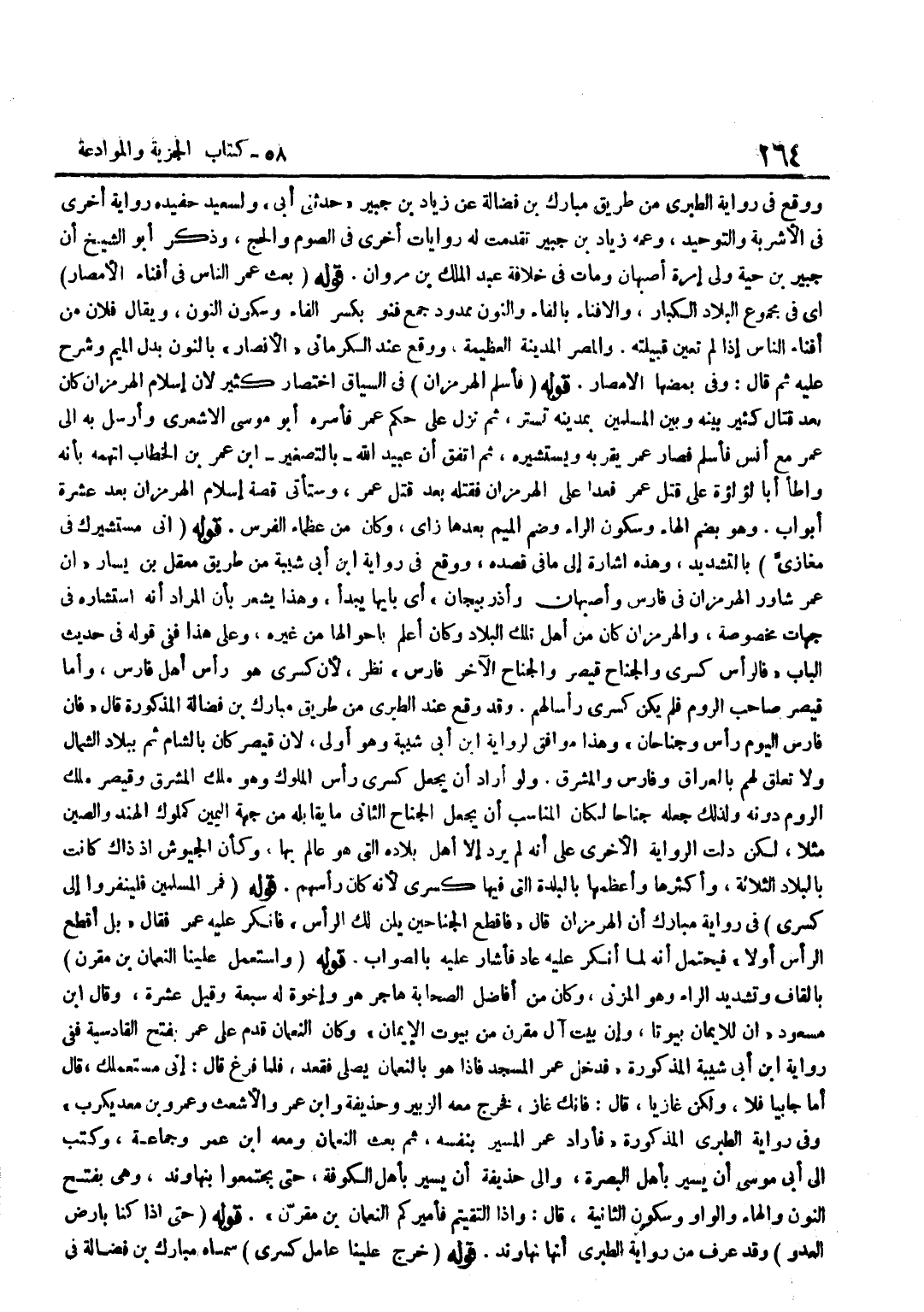 وَوَقَعَ فِي رِوَايَةِ الطَّبَرِيِّ مِنْ طَرِيقِ مُبَارَكِ بْنِ فَضَالَةَ عَنْ زِيَادِ بْنِ جُبَيْرٍ حَدَّثَنِي أَبِي وَلِسَعِيدٍ حَفِيدِهِ رِوَايَةٌ أُخْرَى فِي الْأَشْرِبَةِ وَالتَّوْحِيدِ وَعَمُّهُ زِيَادُ بْنُ جُبَيْرٍ تَقَدَّمَتْ لَهُ رِوَايَاتٌ أُخْرَى فِي الصَّوْمِ وَالْحَجِّ وَذَكَرَ أَبُو الشَّيْخِ أَنَّ جُبَيْرَ بْنَ حَيَّةَ وَلِيَ إِمْرَةَ أَصْبَهَانَ وَمَاتَ فِي خِلَافَةِ عَبْدِ الْمَلِكِ بْنِ مَرْوَانَ قَوْلُهُ بَعَثَ عُمَرُ النَّاسَ فِي أَفْنَاءِ الْأَمْصَارِ أَيْ فِي مَجْمُوعِ الْبِلَادِ الْكِبَارِ وَالْأَفْنَاءُ بِالْفَاءِ وَالنُّونِ مَمْدُودٌ جَمْعُ فِنْوٍ بِكَسْرِ الْفَاءِ وَسُكُونِ النُّونِ وَيُقَالُ فُلَانٌ مِنْ أَفْنَاءِ النَّاسِ إِذَا لَمْ تُعَيَّنْ قَبِيلَتُهُ وَالْمِصْرُ الْمَدِينَةُ الْعَظِيمَةُ وَوَقَعَ عِنْدَ الْكِرْمَانِيِّ الْأَنْصَارِ بِالنُّونِ بَدَلَ الْمِيمِ وَشَرَحَ عَلَيْهِ ثُمَّ قَالَ وَفِي بَعْضِهَا الْأَمْصَارُ قَوْلُهُ فَأَسْلَمَ الْهُرْمُزَانُ فِي السِّيَاقِ اخْتِصَارٌ كَثِيرٌ لِأَنَّ إِسْلَامَ الْهُرْمُزَانِ كَانَ بَعْدَ قِتَالٍ كَثِيرٍ بَيْنَهُ وَبَيْنَ الْمُسْلِمِينَ بِمَدِينَةِ تُسْتَرَ ثُمَّ نَزَلَ عَلَى حُكْمِ عُمَرَ فَأَسَرَهُ أَبُو مُوسَى الْأَشْعَرِيُّ وَأَرْسَلَ بِهِ إِلَى عُمَرَ مَعَ أَنَسٍ فَأَسْلَمَ فَصَارَ عُمَرُ يُقَرِّبهُ وَيَسْتَشِيرُهُ ثُمَّ اتَّفَقَ أَنَّ عبيد الله بِالتَّصْغِيرِ أَن عُمَرَ بْنِ الْخَطَّابِ اتَّهَمَهُ بِأَنَّهُ وَاطَأَ أَبَا لُؤْلُؤَةَ عَلَى قَتْلِ عُمَرَ فَعَدَا عَلَى الْهُرْمُزَانِ فَقَتَلَهُ بَعْدَ قَتْلِ عُمَرَ وَسَتَأْتِي قِصَّةُ إِسْلَامِ الْهُرْمُزَانِ بَعْدَ عَشَرَةِ أَبْوَابٍ وَهُوَ بِضَمِّ الْهَاءِ وَسُكُونِ الرَّاءِ وَضَمِّ الْمِيمِ بَعْدَهَا زَايٌ وَكَانَ من عُظَمَاء الْفُرْسِ قَوْلُهُ إِنِّي مُسْتَشِيرُكَ فِي مَغَازِيَّ بِالتَّشْدِيدِ وَهَذِهِ إِشَارَةٌ إِلَى مَا فِي قَصْدِهِ وَوَقَعَ فِي رِوَايَة بن أَبِي شَيْبَةَ مِنْ طَرِيقِ مَعْقِلِ بْنِ يَسَارٍ أَنَّ عُمَرَ شَاوَرَ الْهُرْمُزَانَ فِي فَارِسَ وَأَصْبَهَانَ وَأَذْرَبِيجَانَ أَيْ بِأَيِّهَا يَبْدَأُ وَهَذَا يُشْعِرُ بِأَنَّ الْمُرَادَ أَنَّهُ اسْتَشَارَهُ فِي جِهَاتٍ مَخْصُوصَةٍ وَالْهُرْمُزَانُ كَانَ مِنْ أَهْلِ تِلْكَ الْبِلَادِ وَكَانَ أَعْلَمَ بِأَحْوَالِهَا مِنْ غَيْرِهِ وَعَلَى هَذَا فَفِي قَوْلِهِ فِي حَدِيثِ الْبَابِ فَالرَّأْسُ كِسْرَى وَالْجَنَاحُ قَيْصَرُ وَالْجَنَاحُ الْآخَرُ فَارِسُ نَظَرٌ لِأَنَّ كِسْرَى هُوَ رَأْسُ أَهْلِ فَارِسَ وَأَمَّا قَيْصَرُ صَاحِبُ الرُّومِ فَلَمْ يَكُنْ كِسْرَى رَأْسًا لَهُمْ وَقَدْ وَقَعَ عِنْدَ الطَّبَرِيِّ مِنْ طَرِيقِ مُبَارَكِ بْنِ فَضَالَةَ الْمَذْكُورَةِ قَالَ فَإِنَّ فَارِسَ الْيَوْمَ رَأْسٌ وَجَنَاحَانِ وَهَذَا مُوَافق لرِوَايَة بن أَبِي شَيْبَةَ وَهُوَ أَوْلَى لِأَنَّ قَيْصَرَ كَانَ بِالشَّامِ ثُمَّ بِبِلَادِ الشَّمَالِ وَلَا تَعَلُّقَ لَهُمْ بِالْعِرَاقِ وَفَارِسَ وَالْمَشْرِقِ وَلَوْ أَرَادَ أَنْ يَجْعَلَ كِسْرَى رَأْسَ الْمُلُوكِ وَهُوَ مَلِكُ الْمَشْرِقِ وَقَيْصَرَ مَلِكَ الرُّومِ دُونَهُ وَلِذَلِكَ جَعَلَهُ جَنَاحَانِ لَكَانَ الْمُنَاسِبُ أَنْ يَجْعَلَ الْجَنَاحَ الثَّانِيَ مَا يُقَابِلُهُ مِنْ جِهَةِ الْيَمِينِ كَمُلُوكِ الْهِنْدِ وَالصِّينِ مَثَلًا لَكِنْ دَلَّتِ الرِّوَايَةُ الْأُخْرَى عَلَى أَنَّهُ لَمْ يُرِدْ إِلَّا أَهْلَ بِلَادِهِ الَّتِي هُوَ عَالِمٌ بِهَا وَكَأَنَّ الْجُيُوشَ إِذْ ذَاكَ كَانَتْ بِالْبِلَادِ الثَّلَاثَةِ وَأَكْثَرُهَا وَأَعْظَمُهَا بِالْبَلْدَةِ الَّتِي فِيهَا كِسْرَى لِأَنَّهُ كَانَ رَأْسُهُمْ قَوْلُهُ فَمُ