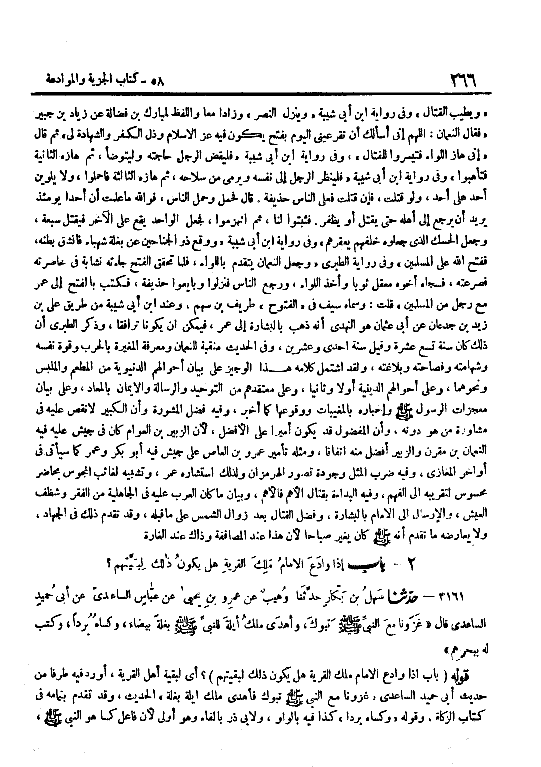 ويطيب الْقِتَال وَفِي رِوَايَة بن أبي شيبَة وَينزل النَّصْر وَزَادا مَعًا وَاللَّفْظُ لِمُبَارَكِ بْنِ فَضَالَةَ عَنْ زِيَادِ بْنِ جُبَيْرٍ فَقَالَ النُّعْمَانُ اللَّهُمَّ إِنِّي أَسْأَلُكَ أَنْ تُقِرَّ عَيْنِي الْيَوْمَ بِفَتْحٍ يَكُونُ فِيهِ عِزُّ الْإِسْلَامِ وَذُلُّ الْكُفْرِ وَالشَّهَادَةُ لِي ثُمَّ قَالَ إِنِّي هَازٌّ اللِّوَاءَ فَتَيَسَّرُوا لِلْقِتَالِ وَفِي رِوَايَة بن أَبِي شَيْبَةَ فَلْيَقْضِ الرَّجُلُ حَاجَتَهُ وَلْيَتَوَضَّأْ ثُمَّ هازه الثَّانِيَة فتأهبوا وَفِي رِوَايَة بن أَبِي شَيْبَةَ فَلْيَنْظُرِ الرَّجُلُ إِلَى نَفْسِهِ وَيَرْمِي مِنْ سِلَاحِهِ ثُمَّ هَازُّهُ الثَّالِثَةَ فَاحْمِلُوا وَلَا يَلْوِيَنَ أَحَدٌ عَلَى أَحَدٍ وَلَوْ قُتِلْتُ فَإِنْ قُتِلْتُ فَعَلَى النَّاسِ حُذَيْفَةُ قَالَ فَحَمَلَ وَحَمَلَ النَّاسُ فَوَاللَّهِ مَا عَلِمْتُ أَنَّ أَحَدًا يَوْمَئِذٍ يُرِيدُ أَنْ يَرْجِعَ إِلَى أَهْلِهِ حَتَّى يُقْتَلَ أَوْ يَظْفَرَ فَثَبَتُوا لَنَا ثُمَّ انْهَزَمُوا فَجَعَلَ الْوَاحِدُ يَقَعُ عَلَى الْآخَرِ فَيَقْتُلُ سَبْعَةً وَجَعَلَ الْحَسَكُ الَّذِي جَعَلُوهُ خَلْفَهُمْ يَعْقِرُهُمْ وَفِي رِوَايَةِ بن أَبِي شَيْبَةَ وَوَقَعَ ذُو الْجَنَاحَيْنِ عَنْ بَغْلَةٍ شَهْبَاءَ فَانْشَقَّ بَطْنُهُ فَفَتَحَ اللَّهُ عَلَى الْمُسْلِمِينَ وَفِي رِوَايَةِ الطَّبَرِيِّ وَجَعَلَ النُّعْمَانُ يَتَقَدَّمُ بِاللِّوَاءِ فَلَمَّا تَحَقَّقَ الْفَتْحُ جَاءَتْهُ نَشَّابَةٌ فِي خَاصِرَتِهِ فَصَرَعَتْهُ فَسَجَّاهُ أَخُوهُ مَعْقِلٌ ثَوْبًا وَأَخَذَ اللِّوَاءَ وَرَجَعَ النَّاسُ فَنَزَلُوا وَبَايَعُوا حُذَيْفَةَ فَكَتَبَ بِالْفَتْحِ إِلَى عُمَرَ مَعَ رَجُلٍ مِنَ الْمُسْلِمِينَ قُلْتُ وَسَمَّاهُ سَيْفٌ فِي الْفُتُوحِ طَرِيفَ بْنَ سَهْمٍ وَعند بن أَبِي شَيْبَةَ مِنْ طَرِيقِ عَلِيُّ بْنُ زَيْدِ بْنِ جُدْعَانَ عَنْ أَبِي عُثْمَانَ هُوَ النَّهْدِيُّ أَنَّهُ ذَهَبَ بِالْبِشَارَةِ إِلَى عُمَرَ فَيُمْكِنُ أَنْ يَكُونَا تَرَافَقَا وَذَكَرَ الطَّبَرِيُّ أَنَّ ذَلِكَ كَانَ سَنَةَ تِسْعَ عَشْرَةَ وَقِيلَ سَنَةَ إِحْدَى وَعِشْرِينَ وَفِي الْحَدِيثِ مَنْقَبَةٌ لِلنُّعْمَانِ وَمَعْرِفَةُ الْمُغِيرَةِ بِالْحَرْبِ وَقُوَّةُ نَفْسِهِ وَشَهَامَتُهُ وَفَصَاحَتُهُ وَبَلَاغَتُهُ وَلَقَدِ اشْتَمَلَ كَلَامُهُ هَذَا الْوَجِيزُ عَلَى بَيَانِ أَحْوَالِهِمُ الدُّنْيَوِيَّةِ مِنَ الْمَطْعَمِ وَالْمَلْبَسِ وَنَحْوِهِمَا وَعَلَى أَحْوَالِهِمُ الدِّينِيَّةِ أَوَّلًا وَثَانِيًا وَعَلَى مُعْتَقَدِهِمْ مِنَ التَّوْحِيدِ وَالرِّسَالَةِ وَالْإِيمَانِ بِالْمِعَادِ وَعَلَى بَيَانِ مُعْجِزَاتِ الرَّسُولِ صَلَّى اللَّهُ عَلَيْهِ وَسَلَّمَ وَإِخْبَارِهِ بِالْمُغَيَّبَاتِ وَوُقُوعِهَا كَمَا أَخْبَرَ وَفِيهِ فَضْلُ الْمَشُورَةِ وَأَنَّ الْكَبِيرَ لَا نَقْصَ عَلَيْهِ فِي مُشَاوَرَةِ مَنْ هُوَ دُونَهُ وَأَنَّ الْمَفْضُولَ قَدْ يَكُونُ أَمِيرًا عَلَى الْأَفْضَلِ لِأَنَّ الزُّبَيْرَ بْنَ الْعَوَّامِ كَانَ فِي جَيْشٍ عَلَيْهِ فِيهِ النُّعْمَانُ بْنُ مُقَرِّنٍ وَالزُّبَيْرُ أَفْضَلُ مِنْهُ اتِّفَاقًا وَمِثْلُهُ تَأْمِيرُ عَمْرِو بْنِ الْعَاصِ عَلَى جَيْشٍ فِيهِ أَبُو بَكْرٍ وَعُمَرُ كَمَا سَيَأْتِي فِي أَوَاخِرِ الْمَغَازِي وَفِيهِ ضَرْبُ الْمَثَلِ وَجَوْدَةُ تَصَوُّرِ الْهُرْمُزَانِ وَلِذَلِكَ اسْتَشَارَهُ عُمَرُ وَتَشْبِيهٌ لِغَائِبِ الْمَجُوسِ بِحَاضِرٍ مَحْسُوسٍ لِتَقْرِيبِهِ إِلَى الْفَهْمِ وَفِيهِ الْبُدَاءَةُ بِقِتَالِ الْأَهَمِّ فَالْأَهَمِّ وَبَيَانُ مَا كَانَ الْعَرَبُ عَلَيْهِ فِي الْجَاهِلِيَّةِ مِنَ الْفَقْرِ وَشَظَفِ الْعَيْشِ وَالْإِرْسَالُ إِلَى الْإِمَامِ بِالْبِشَا