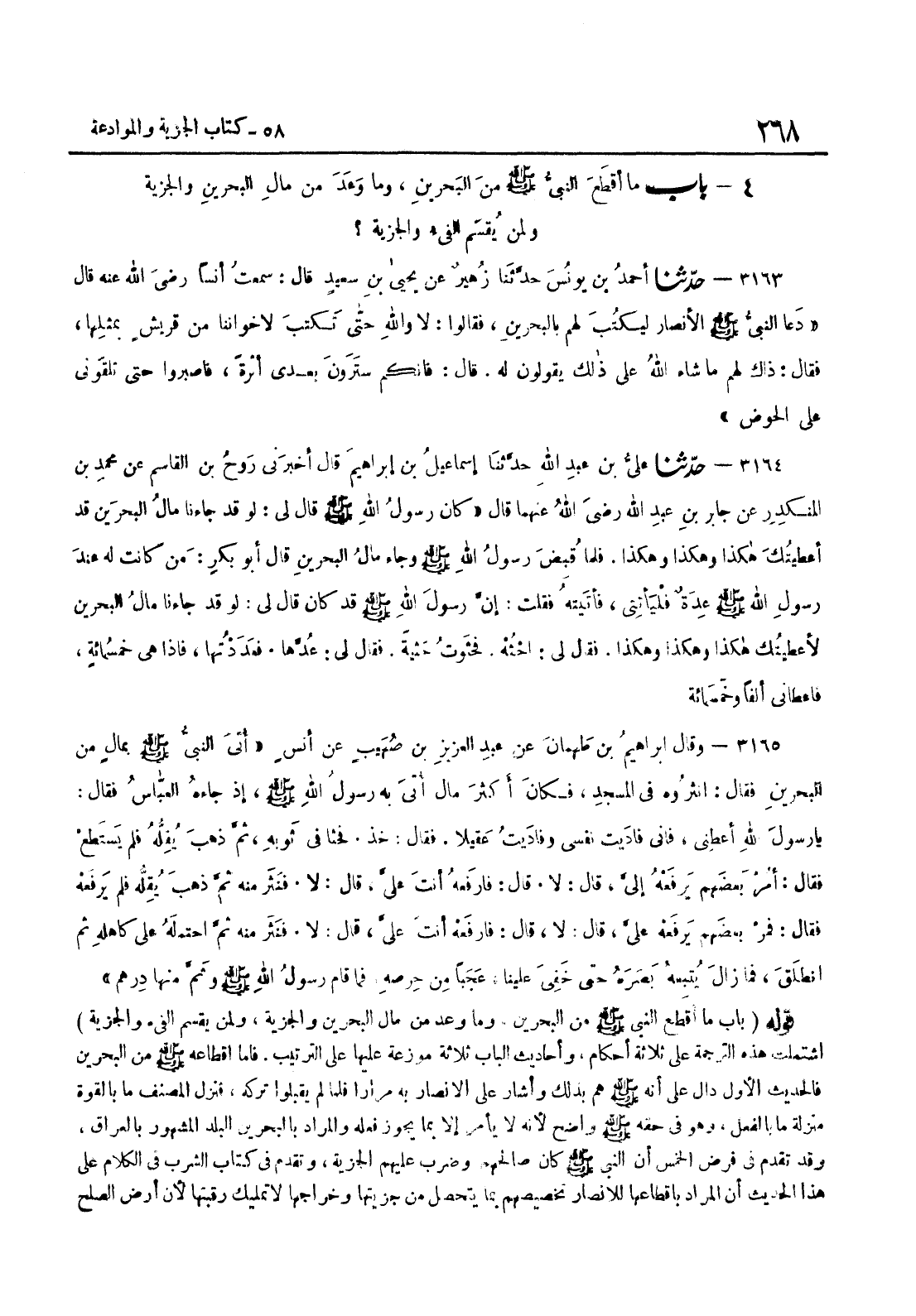 اشْتَمَلَتْ هَذِهِ التَّرْجَمَةُ عَلَى ثَلَاثَةِ أَحْكَامٍ وَأَحَادِيثُ الْبَابِ ثَلَاثَةٌ مُوَزَّعَةٌ عَلَيْهَا عَلَى التَّرْتِيبِ فَأَمَّا إِقْطَاعُهُ صَلَّى اللَّهُ عَلَيْهِ وَسَلَّمَ مِنَ الْبَحْرَيْنِ فَالْحَدِيثُ الْأَوَّلُ دَالٌّ عَلَى أَنَّهُ صَلَّى اللَّهُ عَلَيْهِ وَسَلَّمَ هَمَّ بِذَلِكَ وَأَشَارَ عَلَى الْأَنْصَارِ بِهِ مِرَارًا فَلَمَّا لَمْ يَقْبَلُوا تَرَكَهُ فَنَزَّلَ الْمُصَنِّفُ مَا بِالْقُوَّةِ مَنْزِلَةَ مَا بِالْفِعْلِ وَهُوَ فِي حَقِّهِ صَلَّى اللَّهُ عَلَيْهِ وَسَلَّمَ وَاضِحٌ لِأَنَّهُ لَا يَأْمُرُ إِلَّا بِمَا يَجُوزُ فِعْلُهُ وَالْمُرَادُ بِالْبَحْرَيْنِ الْبَلَدُ الْمَشْهُورُ بِالْعِرَاقِ وَقَدْ تَقَدَّمَ فِي فَرْضِ الْخُمُسِ أَنَّ النَّبِيَّ صَلَّى اللَّهُ عَلَيْهِ وَسَلَّمَ كَانَ صَالَحَهُمْ وَضَرَبَ عَلَيْهِمُ الْجِزْيَةَ وَتَقَدَّمَ فِي كِتَابِ الشُّرْبِ فِي الْكَلَامِ عَلَى هَذَا الْحَدِيثِ أَنَّ الْمُرَادَ بِإِقْطَاعِهَا لِلْأَنْصَارِ تَخْصِيصُهُمْ بِمَا يَتَحَصَّلُ مِنْ جِزْيَتِهَا وَخَرَاجِهَا لَا تَمْلِيكَ رَقَبَتِهَا لِأَنَّ أَرْضَ الصُّلْحِ لَا تُقْسَمُ