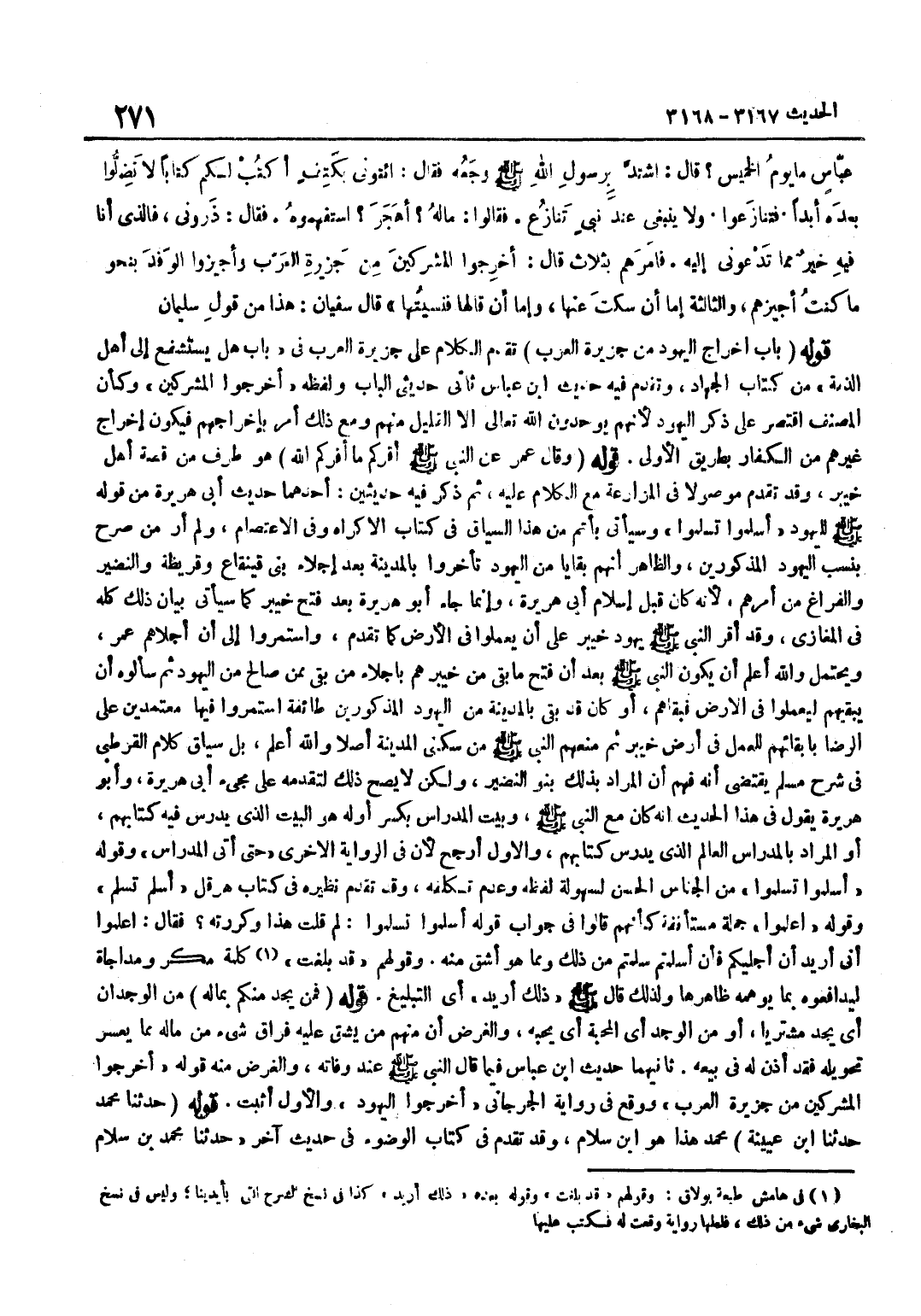 [3168] قَوْلُهُ حَدَّثَنَا مُحَمَّد حَدثنَا بن عُيَيْنَة مُحَمَّد هَذَا هُوَ بن سَلَامٍ وَقَدْ تَقَدَّمَ فِي كِتَابِ الْوُضُوءِ فِي حَدِيثٍ آخَرَ حَدَّثَنَا مُحَمَّدُ بْنُ سَلَامٍ حَدَّثَنَا بن عُيَيْنَةَ وَسَيَأْتِي الْكَلَامُ عَلَى شَرْحِ الْمَتْنِ فِي الْوَفَاةِ آخِرَ الْمَغَازِي إِنْ شَاءَ اللَّهُ تَعَالَى قَالَ الطَّبَرِيُّ فِيهِ أَنَّ عَلَى الْإِمَامِ إِخْرَاجَ كُلِّ مَنْ دَانَ بِغَيْرِ دِينِ الْإِسْلَامِ مِنْ كُلِّ بَلَدٍ غَلَبَ عَلَيْهَا الْمُسْلِمُونَ عَنْوَةً إِذَا لَمْ يَكُنْ بِالْمُسْلِمِينَ ضَرُورَةٌ إِلَيْهِمْ كَعَمَلِ الْأَرْضِ وَنَحْوِ ذَلِكَ وَعَلَى ذَلِكَ أَقَرَّ عُمَرُ مَنْ أَقَرَّ بِالسَّوَادِ وَالشَّامِ وَزَعَمَ أَنَّ ذَلِكَ لَا يَخْتَصُّ بِجَزِيرَةِ الْعَرَبِ بَلْ يَلْتَحِقُ بِهَا مَا كَانَ على حكمهَا