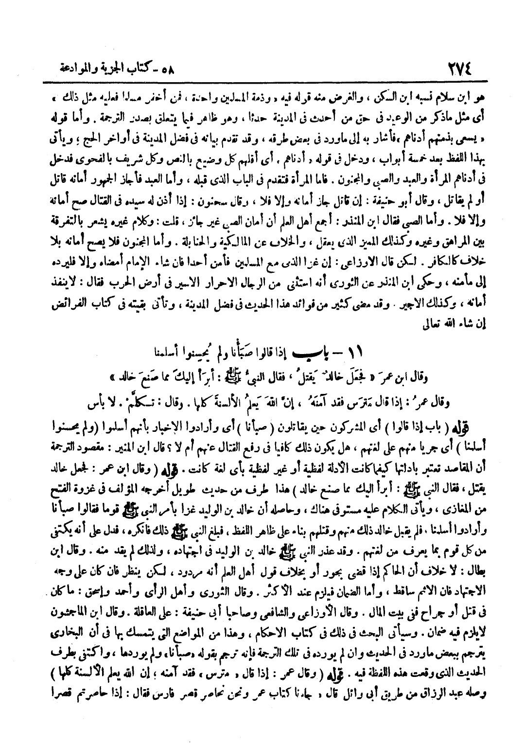 أَيْ وَأَرَادُوا الْإِخْبَارَ بِأَنَّهُمْ أَسْلَمُوا وَلَمْ يُحْسِنُوا أَسْلَمْنَا أَيْ جَرْيًا مِنْهُمْ عَلَى لُغَتِهِمْ هَلْ يَكُونُ ذَلِكَ كَافِيًا فِي رَفْعِ الْقِتَال عَنْهُم أم لَا قَالَ بن الْمُنِير مَقْصُود التَّرْجَمَة أَن الْمَقَاصِد تعْتَبر بأدلتها كَيْفَمَا كَانَتِ الْأَدِلَّةُ لَفْظِيَّةً أَوْ غَيْرَ لَفْظِيَّةٍ بِأَيّ لُغَة كَانَت قَوْله وَقَالَ بن عُمَرَ فَجَعَلَ خَالِدٌ يَقْتُلُ فَقَالَ النَّبِيُّ صَلَّى اللَّهُ عَلَيْهِ وَسَلَّمَ أَبْرَأُ إِلَيْكَ مِمَّا صَنَعَ خَالِدُ هَذَا طَرَفٌ مِنْ حَدِيثٍ طَوِيلٍ أَخْرَجَهُ الْمُؤَلِّفُ فِي غَزْوَةِ الْفَتْحِ مِنَ الْمَغَازِي وَيَأْتِي الْكَلَامُ عَلَيْهِ مُسْتَوْفًى هُنَاكَ وَحَاصِلُهُ أَنَّ خَالِدَ بْنَ الْوَلِيدِ غَزَا بِأَمْرِ النَّبِيِّ صَلَّى اللَّهُ عَلَيْهِ وَسَلَّمَ قَوْمًا فَقَالُوا صَبَأْنَا وَأَرَادُوا أَسْلَمْنَا فَلَمْ يَقْبَلْ خَالِدٌ ذَلِكَ مِنْهُمْ وَقَتَلَهُمْ بِنَاءً عَلَى ظَاهِرِ اللَّفْظِ فَبَلَغَ النَّبِيَّ صَلَّى اللَّهُ عَلَيْهِ وَسَلَّمَ ذَلِكَ فَأَنْكَرَهُ فَدَلَّ عَلَى أَنَّهُ يُكْتَفَى مِنْ كُلِّ قَوْمٍ بِمَا يُعْرَفُ مِنْ لُغَتِهِمْ وَقَدْ عَذَرَ النَّبِيُّ صَلَّى اللَّهُ عَلَيْهِ وَسَلَّمَ خَالِدَ بْنَ الْوَلِيدِ فِي اجْتِهَادِهِ وَلِذَلِكَ لم يقد مِنْهُ وَقَالَ بن بَطَّالٍ لَا خِلَافَ أَنَّ الْحَاكِمَ إِذَا قَضَى بِجَوْرٍ أَوْ بِخِلَافِ قَوْلِ أَهْلِ الْعِلْمِ أَنَّهُ مَرْدُودٌ لَكِنْ يُنْظَرُ فَإِنْ كَانَ عَلَى وَجْهِ الِاجْتِهَادِ فَإِنَّ الْإِثْمَ سَاقِطٌ وَأَمَّا الضَّمَانُ فَيَلْزَمُ عِنْدَ الْأَكْثَرِ وَقَالَ الثَّوْرِيُّ وَأَهْلُ الرَّأْيِ وَأَحْمَدُ وَإِسْحَاقُ مَا كَانَ فِي قَتْلٍ أَوْ جِرَاحٍ فَفِي بَيْتِ الْمَالِ وَقَالَ الْأَوْزَاعِيُّ وَالشَّافِعِيُّ وَصَاحِبَا أبي حنيفَة على الْعَاقِلَة وَقَالَ بن الْمَاجِشُونِ لَا يَلْزَمُ فِيهِ ضَمَانٌ وَسَيَأْتِي الْبَحْثُ فِي ذَلِكَ فِي كِتَابِ الْأَحْكَامِ وَهَذَا مِنَ الْمَوَاضِعِ الَّتِي يُتَمَسَّكُ بِهَا فِي أَنَّ الْبُخَارِيَّ يُتَرْجِمُ بِبَعْضِ مَا وَرَدَ فِي الْحَدِيثِ وَإِنْ لَمْ يُورِدْهُ فِي تِلْكَ التَّرْجَمَةِ فَإِنَّهُ تَرْجَمَ بِقَوْلِهِ صَبَأْنَا وَلَمْ يُورِدْهَا وَاكْتَفَى بِطَرَفِ الْحَدِيثِ الَّذِي وَقَعَتْ هَذِهِ اللَّفْظَةُ فِيهِ قَوْلُهُ وَقَالَ عمر إِذا قَالَ مترس فقد آمنهُ إِن اللَّهَ يَعْلَمُ الْأَلْسِنَةَ كُلَّهَا وَصَلَهُ عَبْدُ الرَّزَّاقِ مِنْ طَرِيقِ أَبِي وَائِلٍ قَالَ جَاءَنَا كِتَابُ عُمَرَ وَنَحْنُ نُحَاصِرُ قَصْرَ فَارِسَ فَقَالَ إِذَا حاصرتم قصرا