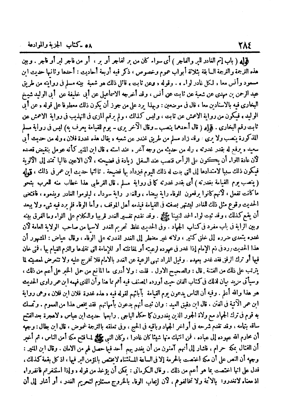 [3186] وَعَنْ ثَابِتٍ قَائِلُ ذَلِكَ هُوَ شُعْبَةُ بَيَّنَهُ مُسْلِمٌ فِي رِوَايَتِهِ مِنْ طَرِيقِ عَبْدِ الرَّحْمَنِ بْنِ مَهْدِيٍّ عَنِ شُعْبَةَ عَنْ ثَابِتٍ عَنْ أَنَسٍ وَقَدْ أَخْرَجَهُ الْإِسْمَاعِيلِيُّ عَنْ أَبِي خَلِيفَةَ عَنْ أَبِي الْوَلِيدِ شَيْخِ الْبُخَارِيِّ فِيهِ بِالْإِسْنَادَيْنِ مَعًا قَالَ فِي مَوْضِعَيْنِ وَبِهَذَا يُرَدُّ عَلَى مَنْ جَوَّزَ أَنْ يَكُونَ ذَلِكَ مَعْطُوفًا عَلَى قَوْلِهِ عَنْ أَبِي الْوَلِيدِ فَيَكُونُ مِنْ رِوَايَةِ الْأَعْمَشِ عَنْ ثَابِتٍ وَلَيْسَ كَذَلِكَ وَلَمْ يُرَقِّمْ الْمِزِّيُّ فِي التَّهْذِيبِ فِي رِوَايَةِ الْأَعْمَشِ عَنْ ثَابِتٍ رَقْمَ الْبُخَارِيِّ قَوْلُهُ قَالَ أَحَدُهُمَا يُنْصَبُ وَقَالَ الْآخَرُ يُرَى يَوْمَ الْقِيَامَةِ يُعْرَفُ بِهِ لَيْسَ فِي رِوَايَةِ مُسْلِمٍ الْمَذْكُورَةِ يُنْصَبُ وَلَا يُرَى وَقَدْ زَادَ مُسْلِمٌ مِنْ طَرِيقِ غُنْدَرٍ عَنْ شُعْبَةَ يُقَالُ هَذِهِ غَدْرَةُ فُلَانٍ وَلَهُ مِنْ حَدِيثِ أَبِي سَعِيدٍ يُرْفَعُ لَهُ بِقَدْرِ غَدْرَتِهِ وَلَهُ مِنْ حَدِيثِهِ مِنْ وَجْهٍ آخَرَ عِنْد استه قَالَ بن الْمُنِيرِ كَأَنَّهُ عُومِلَ بِنَقِيضِ قَصْدِهِ لِأَنَّ عَادَةَ اللِّوَاءِ أَنْ يَكُونَ عَلَى الرَّأْسِ فَنُصِبَ عِنْدَ السُّفْلِ زِيَادَةً فِي فَضِيحَتِهِ لِأَنَّ الْأَعْيُنَ غَالِبًا تَمْتَدُّ إِلَى الْأَلْوِيَةِ فَيَكُونُ ذَلِكَ سَبَبًا لِامْتِدَادِهَا إِلَى الَّتِي بَدَتْ لَهُ ذَلِكَ الْيَوْمَ فَيَزْدَادُ بهَا فضيحة ثَالِثهَا حَدِيث بن عُمَرَ فِي ذَلِكَ قَوْلُهُ يُنْصَبُ يَوْمَ الْقِيَامَةِ بِغَدْرَتِهِ أَيْ بِقَدْرِ غَدْرَتِهِ كَمَا فِي رِوَايَةِ مُسْلِمٍ قَالَ الْقُرْطُبِيُّ هَذَا خِطَابٌ مِنْهُ لِلْعَرَبِ بِنَحْوِ مَا كَانَتْ تَفْعَلُ لِأَنَّهُمْ كَانُوا يَرْفَعُونَ لِلْوَفَاءِ رَايَةً بَيْضَاءَ وَلِلْغَدْرِ رَايَةً سَوْدَاءَ لِيَلُومُوا الْغَادِرَ وَيَذُمُّوهُ فَاقْتَضَى الْحَدِيثُ وُقُوعَ مِثْلِ ذَلِكَ لِلْغَادِرِ لِيَشْتَهِرَ بِصِفَتِهِ فِي الْقِيَامَةِ فَيَذُمُّهُ أَهْلُ الْمَوْقِفِ وَأَمَّا الْوَفَاءُ فَلَمْ يَرِدْ فِيهِ شَيْءٌ وَلَا يَبْعُدُ أَنْ يَقَعَ كَذَلِكَ وَقَدْ ثَبَتَ لِوَاءُ الْحَمْدِ لِنَبِيِّنَا صَلَّى اللَّهُ عَلَيْهِ وَسَلَّمَ وَقَدْ تَقَدَّمَ تَفْسِيرُ الْغَدْرِ قَرِيبًا وَالْكَلَامُ عَلَى اللِّوَاءِ وَمَا الْفَرْقُ بَيْنَهُ وَبَيْنَ الرَّايَةِ فِي بَابٍ مُفْرَدٍ فِي كِتَابِ الْجِهَادِ وَفِي الْحَدِيثِ غِلَظُ تَحْرِيمِ الْغَدْرِ لَا سِيَّمَا مِنْ صَاحِبِ الْوِلَايَةِ الْعَامَّةِ لِأَنَّ غَدْرَهُ يَتَعَدَّى ضَرَرُهُ إِلَى خَلْقٍ كَثِيرٍ وَلِأَنَّهُ غَيْرُ مُضْطَرٍّ إِلَى الْغَدْرِ لِقُدْرَتِهِ عَلَى الْوَفَاءِ وَقَالَ عِيَاضٌ الْمَشْهُورُ أَنَّ هَذَا الْحَدِيثَ وَرَدَ فِي ذَمِّ الْإِمَامِ إِذَا غَدَرَ فِي عُهُودِهِ لِرَعِيَّتِهِ أَوْ لِمُقَاتِلَتِهِ أَوْ لِلْإِمَامَةِ الَّتِي تَقَلَّدَهَا وَالْتَزَمَ الْقِيَامَ بِهَا فَمَتَى خَانَ فِيهَا أَوْ تَرَكَ الرِّفْقَ فَقَدْ غَدَرَ بِعَهْدِهِ وَقِيلَ الْمُرَادُ نَهْيُ الرَّعِيَّةِ عَنِ الْغَدْرِ بِالْإِمَامِ فَلَا تَخْرُجُ عَلَيْهِ وَلَا تَتَعَرَّضُ لِمَعْصِيَتِهِ لِمَا يَتَرَتَّبُ عَلَى ذَلِكَ مِنَ الْفِتْنَةِ قَالَ وَالصَّحِيحُ الْأَوَّلُ قُلْتُ وَلَا أَدْرِي مَا الْمَانِعُ مِنْ حَمْلِ الْخَبَرِ عَلَى أَعَمَّ مِنْ ذَلِكَ وَسَيَأْتِي مَزِيدُ بَيَانٍ لِذَلِكَ فِي كِتَابِ الْفِتَنِ حَيْثُ أَوْرَدَهُ الْمُصَنِّفُ فِيهِ أَتَمَّ مِمَّا هُنَا وَأَنَّ الَّذِي فهمه بن عمر رَاوِي الْحَدِيثِ هُوَ هَذَا وَاللَّهُ أَعْلَمُ وَفِيهِ أَنَّ النَّاسَ يُدْعَوْنَ يَوْمَ الْقِيَامَةِ بِآبَائِهِمْ لِقَوْلِهِ فِيهِ هَذِه غدرة 