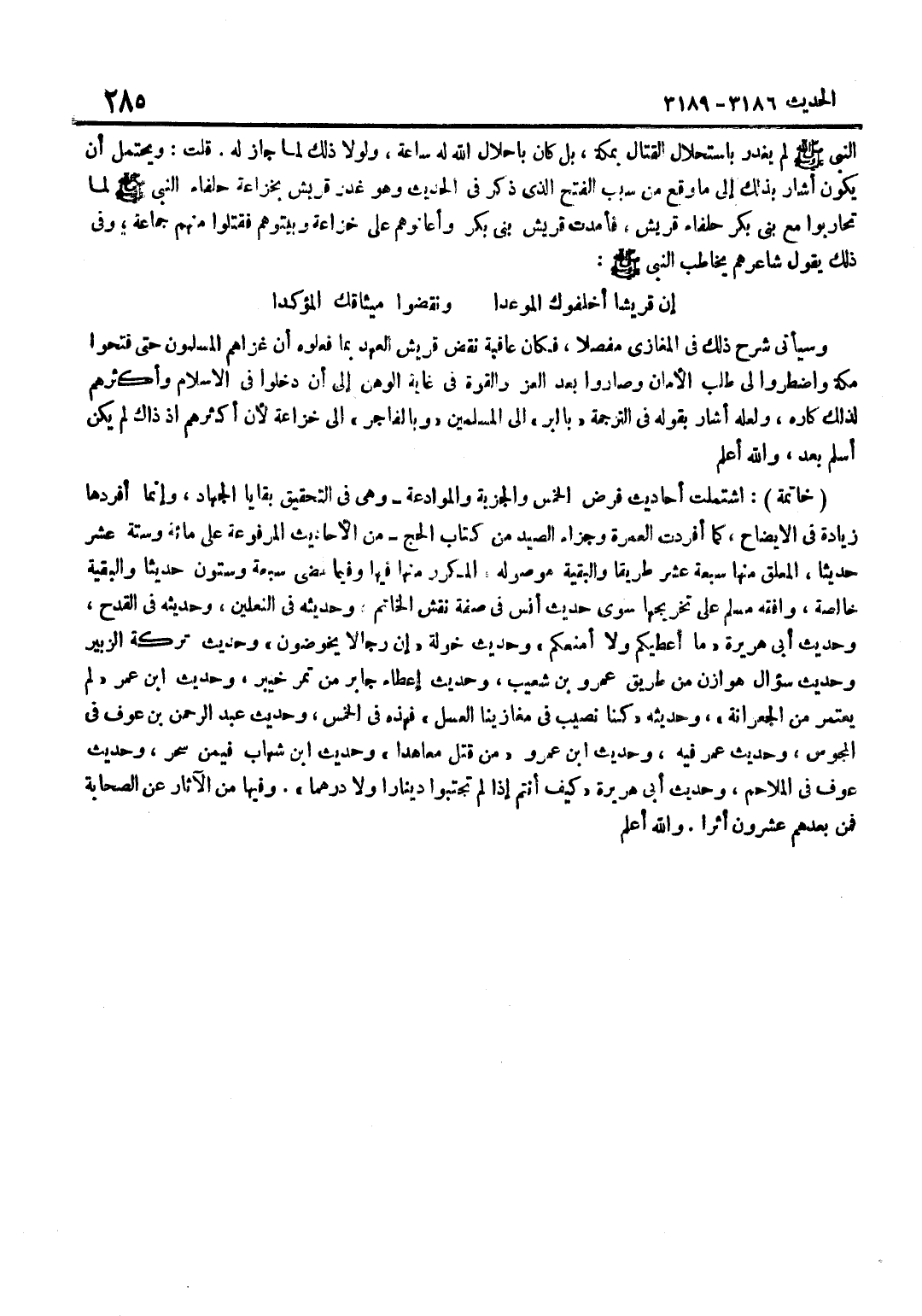 النَّبِيَّ صَلَّى اللَّهُ عَلَيْهِ وَسَلَّمَ لَمْ يَغْدِرْ بِاسْتِحْلَالِ الْقِتَالِ بِمَكَّةَ بَلْ كَانَ بِإِحْلَالِ اللَّهِ لَهُ سَاعَةً وَلَوْلَا ذَلِكَ لَمَا جَازَ لَهُ قُلْتُ وَيُحْتَمَلُ أَنْ يَكُونَ أَشَارَ بِذَلِكَ إِلَى مَا وَقَعَ مِنْ سَبَبِ الْفَتْحِ الَّذِي ذُكِرَ فِي الْحَدِيثِ وَهُوَ غَدْرُ قُرَيْشٍ بِخُزَاعَةَ حُلَفَاءِ النَّبِيِّ صَلَّى اللَّهُ عَلَيْهِ وَسَلَّمَ لَمَّا تَحَارَبُوا مَعَ بَنِي بَكْرٍ حُلَفَاءِ قُرَيْشٍ فَأَمَدَّتْ قُرَيْشٌ بَنِي بَكْرٍ وَأَعَانُوهُمْ عَلَى خُزَاعَةَ وَبَيَّتُوهُمْ فَقَتَلُوا مِنْهُمْ جَمَاعَةً وَفِي ذَلِكَ يَقُولُ شَاعِرُهُمْ يُخَاطِبُ النَّبِيَّ صَلَّى اللَّهُ عَلَيْهِ وَسَلَّمَ إِنَّ قُرَيْشًا أَخْلَفُوكَ الْمَوْعِدَا وَنَقَضُوا مِيثَاقَكَ الْمُؤَكَّدَا وَسَيَأْتِي شَرْحُ ذَلِكَ فِي الْمَغَازِي مُفَصَّلًا فَكَانَ عَاقِبَةُ نَقْضِ قُرَيْشٍ الْعَهْدَ بِمَا فَعَلُوهُ أَنْ غَزَاهُمُ الْمُسْلِمُونَ حَتَّى فَتَحُوا مَكَّةَ وَاضْطَرُّوا إِلَى طَلَبِ الْأَمَانِ وَصَارُوا بَعْدَ الْعِزِّ وَالْقُوَّةِ فِي غَايَةِ الْوَهَنِ إِلَى أَنْ دَخَلُوا فِي الْإِسْلَامِ وَأَكْثَرُهُمْ لِذَلِكَ كَارِهٌ وَلَعَلَّهُ أَشَارَ بِقَوْلِهِ فِي التَّرْجَمَةِ بِالْبَرِّ إِلَى الْمُسْلِمِينَ وَبِالْفَاجِرِ إِلَى خُزَاعَةَ لِأَنَّ أَكْثَرَهَمْ إِذْ ذَاكَ لَمْ يَكُنْ أَسْلَمَ بَعْدُ وَاللَّهُ أَعْلَمُ خَاتِمَةٌ اشْتَمَلَتْ أَحَادِيثُ فَرْضِ الْخُمُسِ وَالْجِزْيَةِ وَالْمُوَادَعَةِ وَهِيَ فِي التَّحْقِيقِ بَقَايَا الْجِهَادِ وَإِنَّمَا أَفْرَدَهَا زِيَادَةً فِي الْإِيضَاحِ كَمَا أُفْرِدَتِ الْعُمْرَةُ وَجَزَاءُ الصَّيْدِ مِنْ كِتَابِ الْحَجِّ مِنَ الْأَحَادِيثِ الْمَرْفُوعَةِ عَلَى مِائَةٍ وَسِتَّةَ عَشَرَ حَدِيثًا الْمُعَلَّقُ مِنْهَا سَبْعَةَ عَشَرَ طَرِيقًا وَالْبَقِيَّةُ مَوْصُولَةٌ الْمُكَرَّرُ مِنْهَا فِيهَا وَفِيمَا مَضَى سَبْعَةٌ وَسِتُّونَ حَدِيثًا وَالْبَقِيَّةُ خَالِصَةٌ وَافَقَهُ مُسْلِمٌ عَلَى تَخْرِيجِهَا سِوَى حَدِيثِ أَنَسٍ فِي صِفَةِ نَقْشِ الْخَاتَمِ وَحَدِيثِهِ فِي النَّعْلَيْنِ وَحَدِيثِهِ فِي الْقَدَحِ وَحَدِيثِ أَبِي هُرَيْرَةَ مَا أُعْطِيكُمْ وَلَا أَمْنَعُكُمْ وَحَدِيثِ خَوْلَةَ إِنَّ رِجَالًا يَخُوضُونَ وَحَدِيثِ تَرِكَةِ الزُّبَيْرِ وَحَدِيثِ سُؤَالِ هَوَازِنَ مِنْ طَرِيقِ عَمْرِو بْنِ شُعَيْبٍ وَحَدِيثِ إِعْطَاءِ جَابِرٍ مِنْ تَمْرِ خَيْبَرَ وَحَدِيثِ بن عُمَرَ لَمْ يَعْتَمِرْ مِنَ الْجِعِرَّانَةِ وَحَدِيثِهِ كُنَّا نُصِيبُ فِي مَغَازِينَا الْعَسَلَ فَهَذِهِ فِي الْخُمُسِ وَحَدِيثِ عَبْدِ الرَّحْمَنِ بْنِ عَوْفٍ فِي الْمَجُوسِ وَحَدِيث عمر فِيهِ وَحَدِيث بن عَمْرو من قتل معاهدا وَحَدِيث بن شِهَابٍ فِيمَنْ سَحَرَ وَحَدِيثِ عَوْفٍ فِي الْمَلَاحِمِ وَحَدِيثِ أَبِي هُرَيْرَةَ كَيْفَ أَنْتُمْ إِذَا لَمْ تَجْتَبُوا دِينَارًا وَلَا دِرْهَمًا وَفِيهَا مِنَ الْآثَارِ عَنِ الصَّحَابَةِ فَمَنْ بَعْدَهُمْ عِشْرُونَ أَثَرًا وَاللَّهُ أعلم
