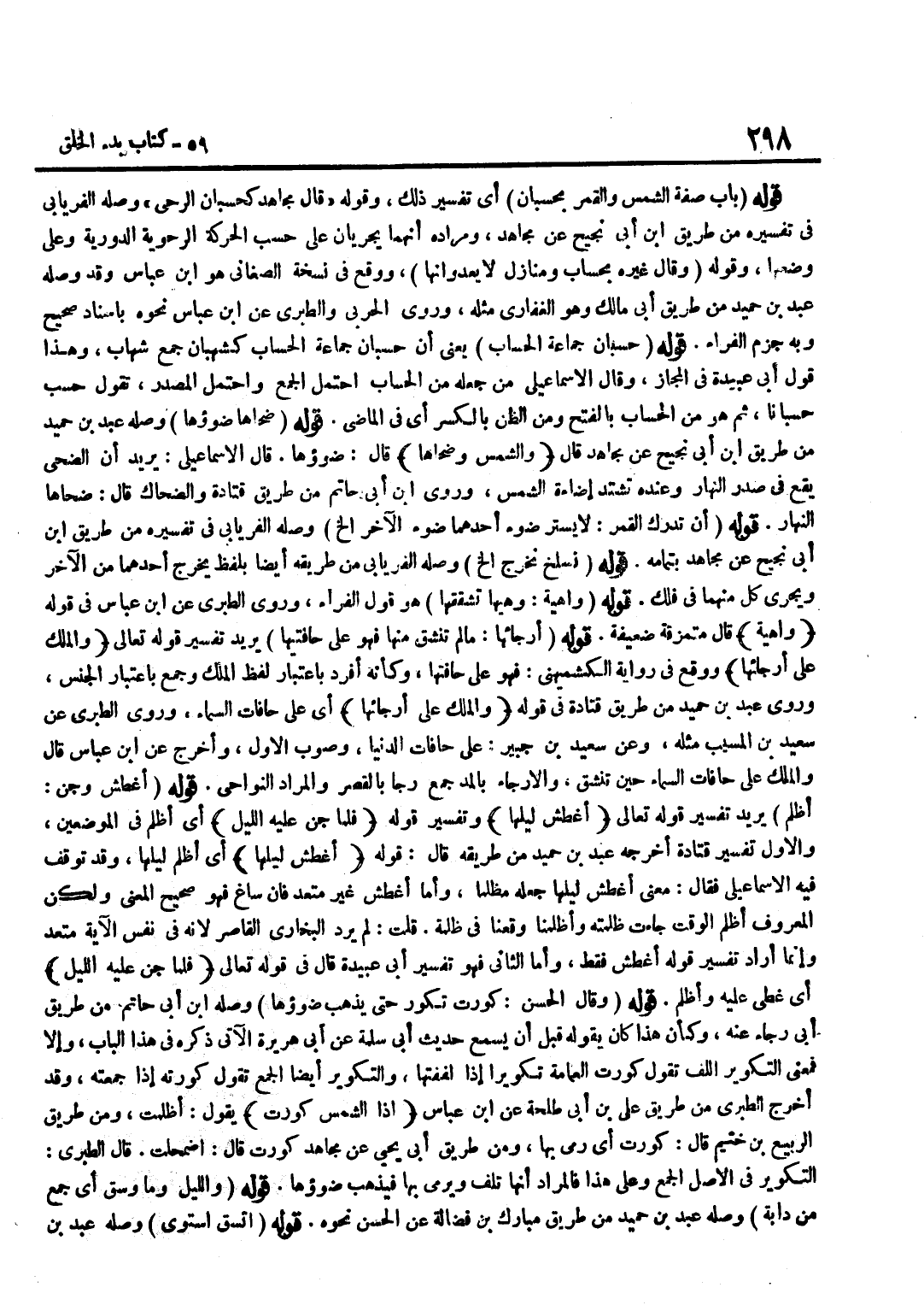 أَيْ تَفْسِيرُ ذَلِكَ وَقَوْلُهُ قَالَ مُجَاهِدٌ كَحُسْبَانِ الرَّحَى وَصله الْفرْيَابِيّ فِي تَفْسِيره من طَرِيق بن أَبِي نَجِيحٍ عَنْ مُجَاهِدٍ وَمُرَادُهُ أَنَّهُمَا يَجْرِيَانِ عَلَى حَسَبِ الْحَرَكَةِ الرَّحَوِيَّةِ الدَّوْرِيَّةِ وَعَلَى وَضْعِهَا وَقَوْلُهُ وَقَالَ غَيْرُهُ بِحِسَابٍ وَمَنَازِلَ لَا يَعْدُوَانِهَا وَوَقع فِي نُسْخَة الصغاني هُوَ بن عَبَّاسٍ وَقَدْ وَصَلَهُ عَبْدُ بْنُ حُمَيْدٍ مِنْ طَرِيقِ أَبِي مَالِكٍ وَهُوَ الْغِفَارِيُّ مِثْلَهُ وَرَوَى الْحَرْبِيّ والطبري عَن بن عَبَّاسٍ نَحْوَهُ بِإِسْنَادٍ صَحِيحٍ وَبِهِ جَزَمَ الْفَرَّاءُ قَوْلُهُ حُسْبَانٌ جَمَاعَةُ الْحِسَابِ يَعْنِي أَنَّ حُسْبَانَ جَمَاعَةُ الْحِسَابِ كَشُهْبَانٍ جَمْعُ شِهَابٍ وَهَذَا قَوْلُ أَبِي عُبَيْدَةَ فِي الْمَجَازِ وَقَالَ الْإِسْمَاعِيلِيُّ مَنْ جَعَلَهُ مِنَ الْحِسَابِ احْتَمَلَ الْجَمْعَ وَاحْتَمَلَ الْمَصْدَرَ تَقُولُ حَسِبَ حُسْبَانًا ثُمَّ هُوَ مِنَ الْحِسَابِ بِالْفَتْحِ وَمِنَ الظَّنِّ بِالْكَسْرِ أَيْ فِي الْمَاضِي قَوْله ضحاها ضوؤها وَصله عبد بن حميد من طَرِيق بن أَبِي نَجِيحٍ عَنْ مُجَاهِدٍ قَالَ وَالشَّمْسِ وَضُحَاهَا قَالَ ضوؤها قَالَ الْإِسْمَاعِيلِيُّ يُرِيدُ أَنَّ الضُّحَى يَقَعُ فِي صَدْرِ النَّهَارِ وَعِنْدَهُ تَشْتَدُّ إِضَاءَةُ الشَّمْسِ وَرَوَى بن أَبِي حَاتِمٍ مِنْ طَرِيقِ قَتَادَةَ وَالضَّحَّاكِ قَالَ ضُحَاهَا النَّهَارُ قَوْلُهُ أَنْ تُدْرِكَ الْقَمَرَ لَا يُسْتَرُ ضَوْءُ أَحَدِهِمَا ضَوْءَ الْآخَرِ إِلَخْ وَصَلَهُ الْفرْيَابِيّ فِي تَفْسِيره من طَرِيق بن أَبِي نَجِيحٍ عَنْ مُجَاهِدٍ بِتَمَامِهِ قَوْلُهُ نَسْلَخْ نُخْرِجْ إِلَخْ وَصَلَهُ الْفِرْيَابِيُّ مِنْ طَرِيقِهِ أَيْضًا بِلَفْظِ يَخْرُجُ أَحَدُهُمَا مِنَ الْآخَرِ وَيَجْرِي كُلٌّ مِنْهُمَا فِي فَلَكٍ قَوْلُهُ وَاهِيَةٌ وَهْيُهَا تَشَقُّقُهَا هُوَ قَول الْفراء وروى الطَّبَرِيّ عَن بن عَبَّاسٍ فِي قَوْلِهِ وَاهِيَةٌ قَالَ مُتَمَزِّقَةٌ ضَعِيفَةٌ قَوْلُهُ أَرْجَائِهَا مَا لَمْ تَنْشَقَّ مِنْهَا فَهُوَ عَلَى حَافَّتَيْهَا يُرِيدُ تَفْسِيرَ قَوْلِهِ تَعَالَى وَالْمَلَكُ على أرجائها وَوَقَعَ فِي رِوَايَةِ الْكُشْمِيهَنِيِّ فَهُوَ عَلَى حَافَّتِهَا وَكَأَنَّهُ أَفْرَدَ بِاعْتِبَارِ لَفْظِ الْمَلَكِ وَجَمَعَ بِاعْتِبَارِ الْجِنْسِ وَرَوَى عَبْدُ بْنُ حُمَيْدٍ مِنْ طَرِيقِ قَتَادَة فِي قَوْله وَالْملك على أرجائها أَيْ عَلَى حَافَّاتِ السَّمَاءِ وَرَوَى الطَّبَرِيُّ عَنْ سَعِيدِ بْنِ الْمُسَيَّبِ مِثْلَهُ وَعَنْ سَعِيدِ بْنِ جُبَيْرٍ عَلَى حَافَّاتِ الدُّنْيَا وَصَوَّبَ الْأَوَّلَ وَأَخْرَجَ عَن بن عَبَّاسٍ قَالَ وَالْمَلَكُ عَلَى حَافَّاتِ السَّمَاءِ حِينَ تَنْشَقُّ وَالْأَرْجَاءُ بِالْمَدِّ جَمْعُ رَجًا بِالْقَصْرِ وَالْمُرَادُ النَّوَاحِي قَوْلُهُ أَغْطَشَ وَجَنَّ أَظْلَمَ يُرِيدُ تَفْسِيرَ قَوْله تَعَالَى أغطش لَيْلهَا وَتَفْسِير قَوْله فَلَمَّا جن عَلَيْهِ اللَّيْل أَيْ أَظْلَمَ فِي الْمَوْضِعَيْنِ وَالْأَوَّلُ تَفْسِيرُ قَتَادَةَ أَخْرَجَهُ عَبْدُ بْنُ حُمَيْدٍ مِنْ طَرِيقِهِ قَالَ قَوْله أغطش لَيْلهَا أَيْ أَظْلَمَ لَيْلَهَا وَقَدْ تَوَقَّفَ فِيهِ الْإِسْمَاعِيلِيُّ فَقَالَ مَعْنَى أَغْطَشَ لَيْلَهَا جَعَلَهُ مُظْلِمًا وَأَمَّا أَغْطَشَ غَيْرُ مُتَعَدٍّ فَإِنْ سَاغَ فَهُوَ صَحِيحُ الْمَعْنَى وَلَكِنَّ الْمَعْرُوفَ أَظْلَمَ الْوَقْتُ جَاءَتْ ظُلْمَتُهُ وَأَظْلَمْنَا وَقَعْنَا فِي ظُلْمَةٍ قُلْتُ لَمْ يُرِدِ الْبُخَارِيُّ الْقَاصِرَ لِأَنَّهُ فِي نَفْسِ الْآيَةِ مُتَعَدٍّ وَإِنَّمَا أَرَادَ تَفْسِيرَ قَوْلِهِ أَغْطَشَ فَقَطْ وَأَمَّا الثَّانِي فَهُوَ تَفْسِيرُ أَب