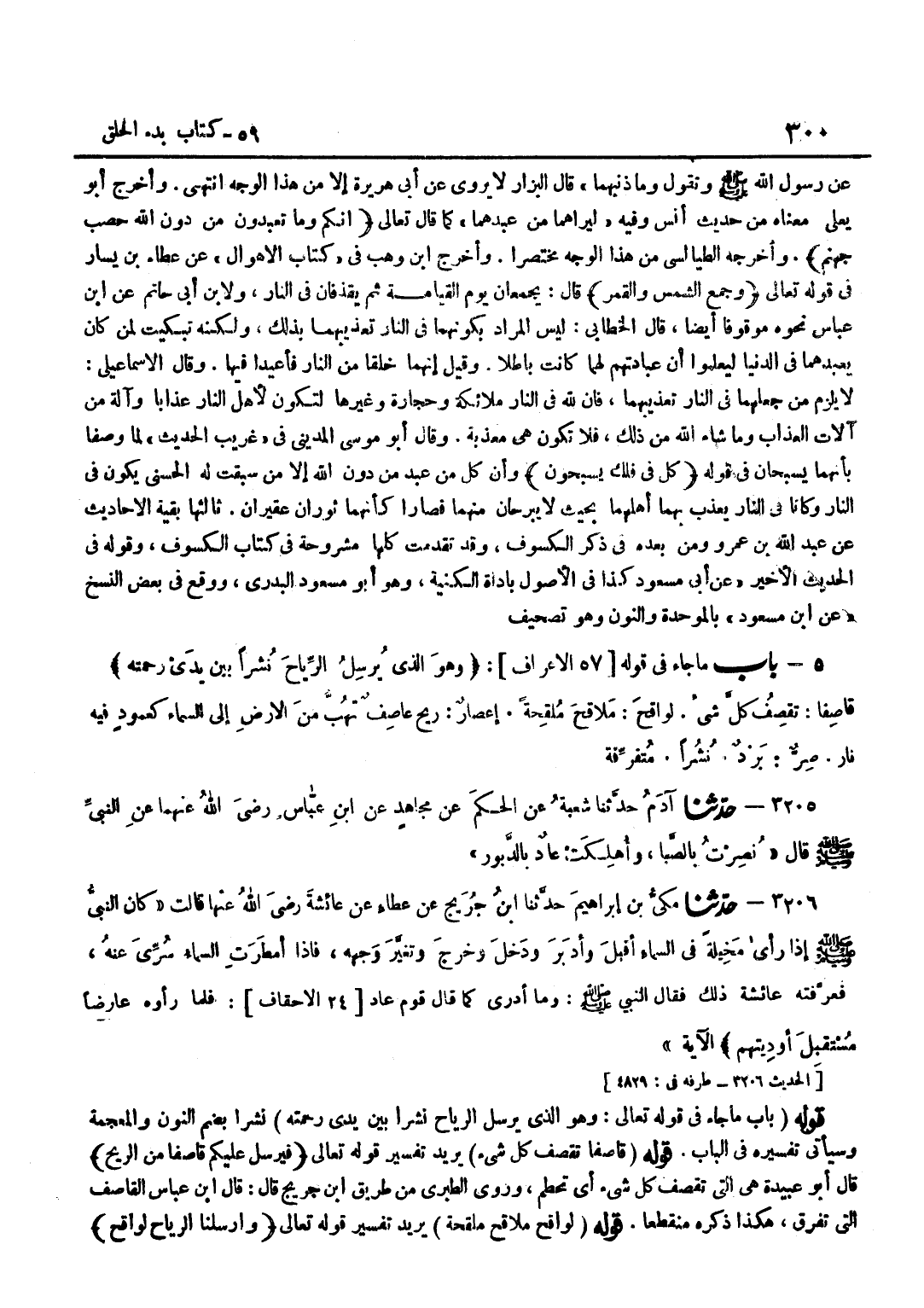 نُشُرًا بِضَمِّ النُّونِ وَالْمُعْجَمَةِ وَسَيَأْتِي تَفْسِيرُهُ فِي الْبَابِ قَوْلُهُ قَاصِفًا تَقْصِفُ كُلَّ شَيْءٍ يُرِيدُ تَفْسِيرَ قَوْلِهِ تَعَالَى فَيُرْسِلَ عَلَيْكُمْ قَاصِفًا من الرّيح قَالَ أَبُو عُبَيْدَةَ هِيَ الَّتِي تَقْصِفُ كُلَّ شَيْءٍ أَيْ تُحَطِّمُ وَرَوَى الطَّبَرِيُّ مِنْ طَرِيقِ بن جريج قَالَ قَالَ بن عَبَّاسٍ الْقَاصِفُ الَّتِي تُفَرِّقُ هَكَذَا ذَكَرَهُ مُنْقَطِعًا قَوْلُهُ لَوَاقِحَ مَلَاقِحٌ مُلَقِّحَةٌ يُرِيدُ تَفْسِيرَ قَوْلِهِ تَعَالَى وارسلنا الرِّيَاح لَوَاقِح