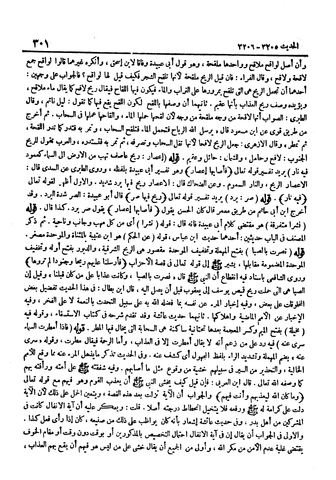وَأَنَّ أَصْلَ لَوَاقِحَ مَلَاقِحُ وَوَاحِدُهَا مُلَقِّحَةٌ وَهُوَ قَوْلُ أَبِي عُبَيْدَةَ وِفَاقًا لِابْنِ إِسْحَاقَ وَأَنْكَرَهُ غَيْرُهُمَا قَالُوا لَوَاقِحُ جَمْعُ لَاقِحَةٍ وَلَاقِحٍ وَقَالَ الْفَرَّاءُ فَإِنْ قِيلَ الرِّيحُ مُلَقِّحَةٌ لِأَنَّهَا تُلَقِّحُ الشَّجَرَ فَكَيْفَ قِيلَ لَهَا لَوَاقِحُ فَالْجَوَابُ عَلَى وَجْهَيْنِ أَحَدُهُمَا أَنْ تُجْعَلَ الرِّيحَ هِيَ الَّتِي تُلَقِّحُ بِمُرُورِهَا عَلَى التُّرَابِ وَالْمَاءِ فَيَكُونُ فِيهَا اللِّقَاحُ فَيُقَالُ رِيحٌ لَاقِحٌ كَمَا يُقَالُ مَاءٌ مَلَاقِحٌ وَيُؤَيِّدُهُ وَصْفُ رِيحِ الْعَذَابِ بِأَنَّهَا عَقِيمٌ ثَانِيهِمَا أَنَّ وَصْفَهَا بِاللَّقْحِ لِكَوْنِ اللَّقْحِ يَقَعُ فِيهَا كَمَا تَقُولُ لَيْلٌ نَائِمٌ وَقَالَ الطَّبَرِيُّ الصَّوَابُ أَنَّهَا لَاقِحَةٌ مِنْ وَجْهٍ مُلَقِّحَةٌ مِنْ وَجْهٍ لِأَنَّ لَقْحَهَا حَمْلُهَا الْمَاءَ وَإِلْقَاحُهَا عَمَلُهَا فِي السَّحَابِ ثُمَّ أَخْرَجَ مِنْ طَرِيقٍ قَوِيٍّ عَن بن مَسْعُودٍ قَالَ يُرْسِلُ اللَّهُ الرِّيَاحَ فَتَحْمِلُ الْمَاءَ فَتُلَقِّحُ السَّحَابَ وَتَمُرُّ بِهِ فَتُدِرُّ كَمَا تُدِرُّ اللِّقْحَةُ ثُمَّ تُمْطِرُ وَقَالَ الْأَزْهَرِيُّ جَعَلَ الرِّيحَ لافحا لِأَنَّهَا تُقِلُّ السَّحَابَ وَتَصْرِفُهُ ثُمَّ تَمُرُّ بِهِ فتستدره وَالْعرب تَقول للريح الْجنُوب لافح وَحَامِلٌ وَلِلشَّمَالِ حَائِلٌ وَعَقِيمٌ قَوْلُهُ إِعْصَارٌ رِيحٌ عَاصِفٌ تَهُبُّ مِنَ الْأَرْضِ إِلَى السَّمَاءِ كَعَمُودٍ فِيهِ نَارٌ يُرِيدُ تَفْسِيرَ قَوْلِهِ تَعَالَى فَأَصَابَهَا اعصار وَهُوَ تَفْسِيرُ أَبِي عُبَيْدَةَ بِلَفْظِهِ وَرَوَى الطَّبَرِيُّ عَنِ السُّدِّيِّ قَالَ الْإِعْصَارُ الرِّيحُ وَالنَّارُ السَّمُومُ وَعَنِ الضَّحَّاكِ قَالَ الْإِعْصَارُ رِيحٌ فِيهَا بَرْدٌ شَدِيدٌ وَالْأَوَّلُ أَظْهَرُ لِقَوْلِهِ تَعَالَى فِيهِ نَارٌ قَوْلُهُ صِرٌّ بَرْدٌ يُرِيدُ تَفْسِيرَ قَوْلِهِ تَعَالَى رِيحٌ فِيهَا صِرٌّ قَالَ أَبُو عُبَيْدَةَ الصِّرُّ شدَّة الْبرد وَقد أخرج بن أَبِي حَاتِمٍ مِنْ طَرِيقِ مَعْمَرٍ قَالَ كَانَ الْحسن يَقُول فأصابها اعصار يَقُولُ صِرٌّ بَرْدٌ كَذَا قَالَ قَوْلُهُ نُشُرًا مُتَفَرِّقَةً هُوَ مُقْتَضَى كَلَامِ أَبِي عُبَيْدَةَ فَإِنَّهُ قَالَ قَوْلُهُ نُشُرًا أَيْ مِنْ كُلِّ مَهَبٍّ وَجَانِبٍ وَنَاحِيَةٍ ثُمَّ ذَكَرَ الْمُصَنِّفُ فِي الْبَابِ حَدِيثَيْنِ أَحَدُهُمَا حَدِيث بن عَبَّاس