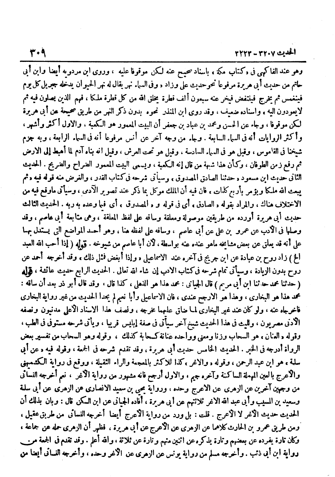 وَهُوَ عِنْدَ الْفَاكِهِيِّ فِي كِتَابِ مَكَّةَ بِإِسْنَادٍ صَحِيح عَنهُ لَكِن مَوْقُوفا عَلَيْهِ وروى بن مرْدَوَيْه أَيْضا وبن أَبِي حَاتِمٍ مِنْ حَدِيثِ أَبِي هُرَيْرَةَ مَرْفُوعًا نَحْوَ حَدِيثِ عَلِيٍّ وَزَادَ وَفِي السَّمَاءِ نَهْرٌ يُقَالُ لَهُ نَهَرُ الْحَيَوَانِ يَدْخُلُهُ جِبْرِيلُ كُلَّ يَوْم فينغمس ثُمَّ يَخْرُجُ فَيَنْتَفِضُ فَيَخِرُّ عَنْهُ سَبْعُونَ أَلْفَ قَطْرَةٍ يَخْلُقُ اللَّهُ مِنْ كُلِّ قَطْرَةٍ مَلَكًا فَهُمُ الَّذِينَ يُصَلُّونَ فِيهِ ثُمَّ لَا يَعُودُونَ إِلَيْهِ وَإِسْنَاده ضَعِيف وَقد روى بن الْمُنْذِرِ نَحْوَهُ بِدُونِ ذِكْرِ النَّهَرِ مِنْ طَرِيقٍ صَحِيحَةٍ عَنْ أَبِي هُرَيْرَةَ لَكِنْ مَوْقُوفًا وَجَاءَ عَنِ الْحَسَنِ وَمُحَمَّدِ بْنِ عَبَّادِ بْنِ جَعْفَرٍ أَنَّ الْبَيْتَ الْمَعْمُورَ هُوَ الْكَعْبَةُ وَالْأَوَّلُ أَكْثَرُ وَأَشْهَرُ وَأَكْثَرُ الرِّوَايَاتِ أَنَّهُ فِي السَّمَاءِ السَّابِعَةِ وَجَاءَ مِنْ وَجْهٍ آخَرَ عَنْ أَنَسٍ مَرْفُوعًا أَنَّهُ فِي السَّمَاءِ الرَّابِعَةِ وَبِهِ جَزَمَ شَيْخُنَا فِي الْقَامُوسِ وَقِيلَ هُوَ فِي السَّمَاءِ السَّادِسَةِ وَقيل هُوَ تَحت الْعَرْش وَقيل أَنه بناه آدَمَ لَمَّا أُهْبِطَ إِلَى الْأَرْضِ ثُمَّ رُفِعَ زَمَنَ الطُّوفَانِ وَكَأَنَّ هَذَا شَبَّهَهُ مَنْ قَالَ إِنَّهُ الْكَعْبَةُ وَيُسَمَّى الْبَيْتُ الْمَعْمُورُ الضِّرَاحَ وَالضَّرِيحَ الحَدِيث الثَّانِي حَدِيث بن مَسْعُودٍ حَدَّثَنَا الصَّادِقُ الْمَصْدُوقُ وَسَيَأْتِي شَرْحُهُ فِي كِتَابِ الْقَدَرِ وَالْغَرَضُ مِنْهُ قَوْلُهُ فِيهِ ثُمَّ يَبْعَثُ اللَّهُ مَلَكًا وَيُؤْمَرُ بِأَرْبَعِ كَلِمَاتٍ فَإِنَّ فِيهِ أَنَّ الْمَلَكَ مُوَكَّلٌ بِمَا ذُكِرَ عِنْدَ تَصْوِيرِ الْآدَمِيِّ وَسَيَأْتِي مَا وَقَعَ فِيهِ مِنْ الِاخْتِلَافِ هُنَاكَ وَالْمُرَادُ بِقَوْلِهِ
