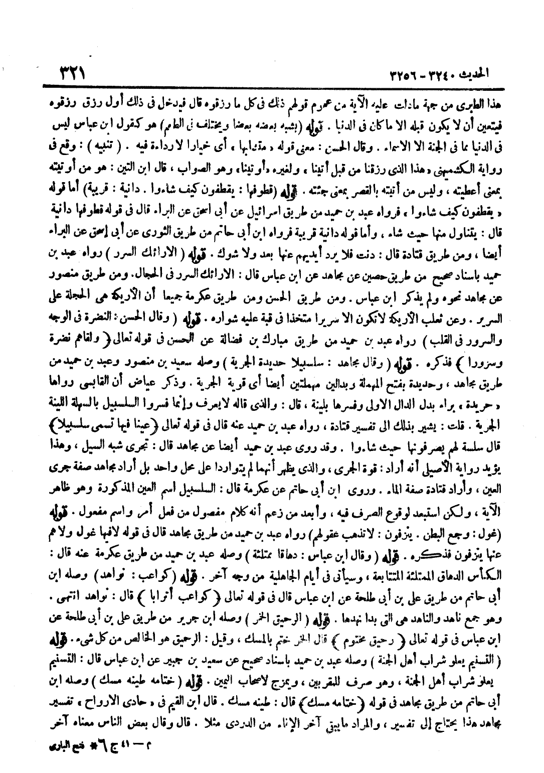 هَذَا الطَّبَرِيُّ مِنْ جِهَةِ مَا دَلَّتْ عَلَيْهِ الْآيَةُ مِنْ عُمُومِ قَوْلِهِمْ ذَلِكَ فِي كُلِّ مَا رُزِقُوهُ قَالَ فَيَدْخُلُ فِي ذَلِكَ أَوَّلُ رِزْقٍ رُزِقُوهُ فَيَتَعَيَّنُ أَنْ لَا يَكُونَ قَبْلَهُ إِلَّا مَا كَانَ فِي الدُّنْيَا قَوْلُهُ يُشْبِهُ بَعْضُهُ بَعْضًا وَيَخْتَلِفُ فِي الطَّعْمِ هُوَ كَقَوْلِ بن عَبَّاسٍ لَيْسَ فِي الدُّنْيَا مِمَّا فِي الْجَنَّةِ إِلَّا الْأَسْمَاءُ وَقَالَ الْحَسَنُ مَعْنَى قَوْلِهِ مُتَشَابِهًا أَيْ خِيَارًا لَا رَدَاءَةَ فِيهِ تَنْبِيهٌ وَقَعَ فِي رِوَايَةِ الْكُشْمِيهَنِيِّ هَذَا الَّذِي رُزِقْنَا مِنْ قَبْلُ أُتِينَا وَلِغَيْرِهِ أُوتِينَا وَهُوَ الصَّوَابُ قَالَ بن التِّينِ هُوَ مِنْ أُوتِيتُهُ بِمَعْنَى أُعْطِيتُهُ وَلَيْسَ مِنْ أَتَيْتُهُ بِالْقَصْرِ بِمَعْنَى جِئْتُهُ قَوْلُهُ قُطُوفُهَا يَقْطِفُونَ كَيْفَ شَاءُوا دَانِيَةً قَرِيبَةً أَمَّا قَوْلُهُ يَقْطِفُونَ كَيْفَ شَاءُوا فَرَوَاهُ عَبْدُ بْنُ حُمَيْدٍ مِنْ طَرِيقِ إِسْرَائِيلَ عَنْ أَبِي إِسْحَاقَ عَنْ الْبَرَاءِ قَالَ فِي قَوْلِهِ قُطُوفُهَا دَانِيَةٌ قَالَ يَتَنَاوَلُ مِنْهَا حَيْثُ شَاءَ وَأَمَّا قَوْلُهُ دَانِيَةً قريبَة فَرَوَاهُ بن أَبِي حَاتِمٍ مِنْ طَرِيقِ الثَّوْرِيِّ عَنْ أَبِي إِسْحَاقَ عَنِ الْبَرَاءِ أَيْضًا وَمِنْ طَرِيقِ قَتَادَةَ قَالَ دَنَتْ فَلَا يَرُدُّ أَيْدِيَهُمْ عَنْهَا بُعْدٌ وَلَا شَوْكٌ قَوْلُهُ الْأَرَائِكُ السُّرُرُ رَوَاهُ عَبْدُ بْنُ حُمَيْدٍ بِإِسْنَادٍ صَحِيحٍ مِنْ طَرِيقِ حُصَيْنٍ عَن مُجَاهِد عَن بن عَبَّاسٍ قَالَ الْأَرَائِكُ السُّرُرُ فِي الْحِجَالِ وَمِنْ طَرِيقِ مَنْصُورٍ عَنْ مُجَاهِدٍ نَحْوَهُ وَلَمْ يَذْكُرِ بن عَبَّاسٍ وَمِنْ طَرِيقِ الْحَسَنِ وَمِنْ طَرِيقِ عِكْرِمَةَ جَمِيعًا أَنَّ الْأَرِيكَةَ هِيَ الْحَجْلَةُ عَلَى السَّرِيرِ وَعَنْ ثَعْلَبٍ الْأَرِيكَةُ لَا تَكُونُ إِلَّا سَرِيرًا مُتَّخَذًا فِي قُبَّةٍ عَلَيْهِ شَوَارِهُ قَوْلُهُ وَقَالَ الْحَسْنُ النَّضْرَةُ فِي الْوَجْهِ وَالسُّرُورُ فِي الْقَلْبِ رَوَاهُ عَبْدُ بْنُ حُمَيْدٍ مِنْ طَرِيقِ مُبَارَكِ بْنِ فَضَالَةَ عَنِ الْحَسَنِ فِي قَوْلِهِ تَعَالَى ولقاهم نَضرة وسرورا فَذَكَرَهُ قَوْلُهُ وَقَالَ مُجَاهِدٌ سَلْسَبِيلًا حَدِيدَةُ الْجِرْيَةِ وَصَلَهُ سَعِيدُ بْنُ مَنْصُورٍ وَعَبْدُ بْنُ حُمَيْدٍ مِنْ طَرِيقِ مُجَاهِدٍ وَحَدِيدَةُ بِفَتْحِ الْمُهْمَلَةِ وَبِدَالَيْنِ مُهْمَلَتَيْنِ أَيْضًا أَيْ قَوِيَّةُ الْجِرْيَةِ وَذَكَرَ عِيَاضٌ أَنَّ الْقَابِسِيَّ رَوَاهَا حَرِيدَةُ بِرَاءٍ بَدَلَ الدَّالِ الْأُولَى وَفَسَّرَهَا بِلَيِّنَةٍ قَالَ وَالَّذِي قَالَهُ لَا يُعْرَفُ وَإِنَّمَا فَسَرُّوا السَّلْسَبِيلَ بِالسَّهْلَةِ اللَّيِّنَةِ الْجِرْيَةِ قُلْتُ يُشِيرُ بِذَلِكَ إِلَى تَفْسِيرِ قَتَادَةَ رَوَاهُ عَبْدُ بْنُ حُمَيْدٍ عَنْهُ قَالَ فِي قَوْلِهِ تَعَالَى عينا فِيهَا تسمى سلسبيلا قَالَ سلسة لَهُمْ يَصْرِفُونَهَا حَيْثُ شَاءُوا وَقَدْ رَوَى عَبْدُ بْنُ حُمَيْدٍ أَيْضًا عَنْ مُجَاهِدٍ قَالَ تَجْرِي شِبْهَ السَّيْلِ وَهَذَا يُؤَيِّدُ رِوَايَةَ الْأَصِيلِيِّ أَنَّهُ أَرَادَ قُوَّةَ الْجَرْيِ وَالَّذِي يَظْهَرُ أَنَّهُمَا لَمْ يَتَوَارَدَا عَلَى مَحَلٍّ وَاحِدٍ بَلْ أَرَادَ مُجَاهِدٌ صِفَةَ جَرْيِ الْعَيْنِ وَأَرَادَ قَتَادَةُ صِفَةَ الْمَاءِ وروى بن أَبِي حَاتِمٍ عَنْ عِكْرِمَةَ قَالَ السَّلْسَبِيلُ اسْمُ الْعَيْنِ الْمَذْكُورَةِ وَهُوَ ظَاهِرُ الْآيَةِ وَلَكِنِ اسْتُبْعِدَ لِوُقُوعِ الصَّرْفِ فِيهِ وَأَبْعَدَ مَنْ زَعَمَ أَنَّهُ كَلَامٌ مَفْصُولٌ مِنْ فِعْلِ أَمْرٍ وَاسْمِ مَفْعُولٍ قَوْلُهُ غَوْلٌ وَجَعُ الْبَطْنِ يُنْزَفُونَ لَا تَذْهَبُ عُ