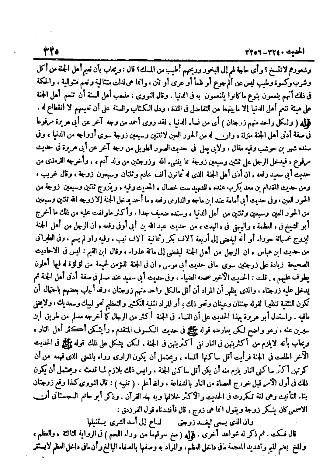 وَشُعُورُهُمْ لَا تَتَّسِخُ وَأَيُّ حَاجَةٍ لَهُمْ إِلَى الْبَخُورِ وَرِيحُهُمْ أَطْيَبُ مِنَ الْمِسْكِ قَالَ وَيُجَابُ بِأَنَّ نَعِيمَ أَهْلِ الْجَنَّةِ مِنْ أَكْلٍ وَشُرْبٍ وَكِسْوَة وَطيب لَيْسَ عَنْ أَلَمِ جُوعٍ أَوْ ظَمَإٍ أَوْ عُرْيٍ أَوْ نَتْنٍ وَإِنَّمَا هِيَ لَذَّاتٌ مُتَتَالِيَةٌ وَنِعَمٌ مُتَوَالِيَةٌ وَالْحِكْمَةُ فِي ذَلِكَ أَنَّهُمْ يُنَعَّمُونَ بِنَوْعِ مَا كَانُوا يَتَنَعَّمُونَ بِهِ فِي الدُّنْيَا وَقَالَ النَّوَوِيُّ مَذْهَبُ أَهْلِ السُّنَّةِ أَنَّ تَنَعُّمَ أَهْلِ الْجَنَّةِ عَلَى هَيْئَةِ تَنَعُّمِ أَهْلِ الدُّنْيَا إِلَّا مَا بَيْنَهُمَا مِنَ التَّفَاضُلِ فِي اللَّذَّةِ وَدَلَّ الْكِتَابُ وَالسُّنَّةُ عَلَى أَنَّ نَعِيمَهُمْ لَا انْقِطَاعَ لَهُ قَوْلُهُ وَلِكُلِّ وَاحِدٍ مِنْهُمْ زَوْجَتَانِ أَيْ مِنْ نِسَاءِ الدُّنْيَا فَقَدْ رَوَى أَحْمَدُ مِنْ وَجْهٍ آخَرَ عَنْ أَبِي هُرَيْرَةَ مَرْفُوعًا فِي صِفَةِ أَدْنَى أَهْلِ الْجَنَّةِ مَنْزِلَةً وَإِنَّ لَهُ مِنَ الْحُورِ الْعِينِ لَاثْنَتَيْنِ وَسَبْعِينَ زَوْجَةً سِوَى أَزْوَاجِهِ مِنَ الدُّنْيَا وَفِي سَنَدِهِ شَهْرُ بْنُ حَوْشَبٍ وَفِيهِ مَقَالٌ وَلِأَبِي يَعْلَى فِي حَدِيثِ الصُّوَرِ الطَّوِيلِ مِنْ وَجْهٍ آخَرَ عَنْ أَبِي هُرَيْرَةَ فِي حَدِيثٍ مَرْفُوعٍ فَيَدْخُلُ الرَّجُلُ عَلَى ثِنْتَيْنِ وَسَبْعِينَ زَوْجَةً مِمَّا يُنْشِئُ اللَّهُ وَزَوْجَتَيْنِ مِنْ وَلَدِ آدَمَ وَأَخْرَجَهُ التِّرْمِذِيُّ مِنْ حَدِيثِ أَبِي سَعِيدٍ رَفَعَهُ إِنَّ أَدْنَى أَهْلِ الْجَنَّةِ الَّذِي لَهُ ثَمَانُونَ أَلْفَ خَادِمٍ وَثِنْتَانِ وَسَبْعُونَ زَوْجَةً وَقَالَ غَرِيبٌ وَمِنْ حَدِيثِ الْمِقْدَامِ بْنِ مَعْدِ يَكْرِبَ عِنْدَهُ لِلشَّهِيدِ سِتُّ خِصَالٍ الْحَدِيثَ وَفِيهِ وَيَتَزَوَّجُ ثِنْتَيْنِ وَسَبْعِينَ زَوْجَةً مِنَ الْحُورِ الْعين وَفِي حَدِيث أبي أُمَامَة عِنْد بن مَاجَهْ وَالدَّارِمِيِّ رَفَعَهُ مَا أَحَدٌ يَدْخُلُ الْجَنَّةَ إِلَّا زَوَّجَهُ اللَّهُ ثِنْتَيْنِ وَسَبْعِينَ مِنَ الْحُورِ الْعِينِ وَسَبْعِينَ وَثِنْتَيْنِ مِنْ أَهْلِ الدُّنْيَا وَسَنَدُهُ ضَعِيفٌ جِدًّا وَأَكْثَرُ مَا وَقَفْتُ عَلَيْهِ مِنْ ذَلِكَ مَا أَخْرَجَ أَبُو الشَّيْخِ فِي الْعَظَمَةِ وَالْبَيْهَقِيُّ فِي الْبَعْثِ مِنْ حَدِيثِ عَبْدِ اللَّهِ بْنِ أَبِي أَوْفَى رَفَعَهُ إِنَّ الرَّجُلَ مِنْ أَهْلِ الْجَنَّةِ لَيُزَوَّجُ خَمْسَمِائَةِ حَوْرَاءَ أَوْ إِنَّهُ لَيُفْضِي إِلَى أَرْبَعَةِ آلَافِ بِكْرٍ وَثَمَانِيَةِ آلَافِ ثَيِّبٍ وَفِيهِ رَاوٍ لَمْ يُسَمَّ وَفِي الطَّبَرَانِيِّ من حَدِيث بن عَبَّاسٍ إِنَّ الرَّجُلَ مِنْ أَهْلِ الْجَنَّةِ لَيُفْضِي إِلَى مائَة عذراء وَقَالَ بن الْقَيِّمِ لَيْسَ فِي الْأَحَادِيثِ الصَّحِيحَةِ زِيَادَةٌ عَلَى زَوْجَتَيْنِ سِوَى مَا فِي حَدِيثِ أَبِي مُوسَى إِنَّ فِي الْجَنَّةِ لِلْمُؤْمِنِ لَخَيْمَةٌ مِنْ لُؤْلُؤَةٍ لَهُ فِيهَا أَهْلُونَ يَطُوفُ عَلَيْهِمْ قُلْتُ الْحَدِيثُ الْأَخِيرُ صَحَّحَهُ الضِّيَاءُ وَفِي حَدِيثِ أَبِي سَعِيدٍ عِنْدَ مُسْلِمٍ فِي صِفَةِ أَدْنَى أَهْلِ الْجَنَّةِ ثُمَّ يَدْخُلُ عَلَيْهِ زَوْجَتَاهُ وَالَّذِي يَظْهَرُ أَنَّ الْمُرَادَ أَنَّ أَقَلَّ مَا لِكُلِّ وَاحِدٍ مِنْهُمْ زَوْجَتَانِ وَقَدْ أَجَابَ بَعْضُهُمْ بِاحْتِمَالِ أَنْ تَكُونَ التَّثْنِيَةُ تَنْظِيرًا لِقَوْلِهِ جَنَّتَانِ وَعَيْنَانِ وَنَحْوُ ذَلِكَ أوالمراد تَثْنِيَةُ التَّكْثِيرِ وَالتَّعْظِيمِ نَحْوُ لَبَّيْكَ وَسَعْدَيْكَ وَلَا يَخْفَى مَا فِيهِ وَاسْتَدَلَّ أَبُو هُرَيْرَةَ بِهَذَا الْحَدِيثِ عَلَى أَنَّ النِّسَاءَ فِي الْجَنَّةِ أَكْثَرُ مِنَ الرِّجَالِ كَمَا أَخْرَجَهُ مُسْلِمٌ مِنْ طَرِي