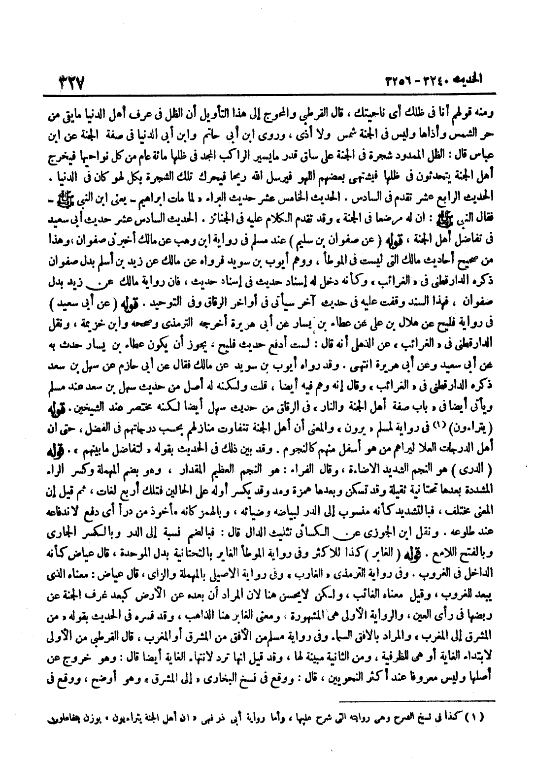 [3256] قَوْلُهُ عَنْ صَفْوَانَ بن سليم عِنْد مُسلم فِي رِوَايَة بن وَهْبٍ عَنْ مَالِكٍ أَخْبَرَنِي صَفْوَانُ وَهَذَا مِنْ صَحِيحِ أَحَادِيثِ مَالِكٍ الَّتِي لَيْسَتْ فِي الْمُوَطَّإِ وَوَهِمَ أَيُّوبُ بْنُ سُوَيْدٍ فَرَوَاهُ عَنْ مَالِكٍ عَنْ زَيْدِ بْنِ أَسْلَمَ بَدَلَ صَفْوَانَ ذَكَرَهُ الدَّارَقُطْنِيُّ فِي الْغَرَائِبِ وَكَأَنَّهُ دَخَلَ لَهُ إِسْنَادُ حَدِيثٍ فِي إِسْنَادِ حَدِيثٍ فَإِنَّ رِوَايَةَ مَالِكٍ عَنْ زَيْدٍ بَدَلَ صَفْوَانَ فَهَذَا السَّنَدُ وَقَفْتُ عَلَيْهِ فِي حَدِيثٍ آخَرَ سَيَأْتِي فِي أَوَاخِرِ الرِّقَاقِ وَفِي التَّوْحِيدِ قَوْلُهُ عَنْ أَبِي سَعِيدٍ فِي رِوَايَةِ فُلَيْحٍ عَنْ هِلَالِ بْنِ عَلِيٍّ عَنْ عَطَاءِ بْنِ يَسَارٍ عَنْ أَبِي هُرَيْرَةَ أخرجه التِّرْمِذِيّ وَصَححهُ وبن خُزَيْمَةَ وَنَقَلَ الدَّارَقُطْنِيُّ فِي الْغَرَائِبِ عَنِ الذُّهْلِيِّ أَنَّهُ قَالَ لَسْتُ أَدْفَعُ حَدِيثَ فُلَيْحٍ يَجُوزُ أَنْ يَكُونَ عَطَاءُ بْنُ يَسَارٍ حَدَّثَ بِهِ عَنْ أَبِي سَعِيدٍ وَعَنْ أَبِي هُرَيْرَةَ انْتَهَى وَقَدْ رَوَاهُ أَيُّوبُ بْنُ سُوَيْدٍ عَنْ مَالِكٍ فَقَالَ عَنْ أَبِي حَازِمٍ عَنْ سَهْلِ بْنِ سَعْدٍ ذَكَرَهُ الدَّارَقُطْنِيُّ فِي الْغَرَائِبِ وَقَالَ إِنَّهُ وَهِمَ فِيهِ أَيْضًا قُلْتُ وَلَكِنَّهُ لَهُ أَصْلٌ مِنْ حَدِيثِ سَهْلِ بْنِ سَعْدٍ عِنْدَ مُسْلِمٍ وَيَأْتِي أَيْضًا فِي بَابِ صِفَةِ أَهْلِ الْجَنَّةِ وَالنَّارِ فِي الرِّقَاقِ مِنْ حَدِيثِ سَهْلٍ أَيْضًا لكنه مُخْتَصر عِنْد الشَّيْخَيْنِ قَوْله يتراءون فِي رِوَايَةٍ لِمُسْلِمٍ يَرَوْنَ وَالْمَعْنَى أَنَّ أَهْلَ الْجَنَّةِ تَتَفَاوَتُ مَنَازِلُهُمْ بِحَسَبِ دَرَجَاتِهِمْ فِي الْفَضْلِ حَتَّى إِنَّ أَهْلَ الدَّرَجَاتِ الْعُلَا لَيَرَاهُمْ مَنْ هُوَ أَسْفَلُ مِنْهُمْ كَالنُّجُومِ وَقَدْ بَيَّنَ ذَلِكَ فِي الْحَدِيثِ بِقَوْلِهِ لِتَفَاضُلِ مَا بَيْنَهُمْ قَوْلُهُ الدُّرِّيُّ هُوَ النَّجْمُ الشَّدِيدُ الْإِضَاءَةِ وَقَالَ الْفَرَّاءُ هُوَ النَّجْمُ الْعَظِيمُ الْمِقْدَارِ وَهُوَ بِضَمِّ الْمُهْمَلَةِ وَكَسْرِ الرَّاءِ الْمُشَدَّدَةِ بَعْدَهَا تَحْتَانِيَّةٌ ثَقِيلَةٌ وَقَدْ تُسَكَّنُ وَبَعْدَهَا هَمْزَةٌ وَمَدٌّ وَقَدْ يُكْسَرُ أَوَّلُهُ عَلَى الْحَالَيْنِ فَتِلْكَ أَرْبَعُ لُغَاتٍ ثُمَّ قِيلَ إِنَّ الْمَعْنَى مُخْتَلِفٌ فَبِالتَّشْدِيدِ كَأَنَّهُ مَنْسُوبٌ إِلَى الدُّرِّ لِبَيَاضِهِ وَضِيَائِهِ وَبِالْهَمْزِ كَأَنَّهُ مَأْخُوذٌ مِنْ دَرَأَ أَيْ دَفَعَ لِانْدِفَاعِهِ عِنْدَ طُلُوعِهِ وَنَقَلَ بن الْجَوْزِيِّ عَنِ الْكِسَائِيِّ تَثْلِيثَ الدَّالِ قَالَ فَبِالضَّمِّ نِسْبَةً إِلَى الدُّرِّ وَبِالْكَسْرِ الْجَارِي وَبِالْفَتْحِ اللَّامِعُ قَوْلُهُ الْغَابِرُ كَذَا لِلْأَكْثَرِ وَفِي رِوَايَةِ الْمُوَطَّإِ الْغَايِرُ بِالتَّحْتَانِيَّةِ بَدَلَ الْمُوَحَّدَةِ قَالَ عِيَاضٌ كَأَنَّهُ الدَّاخِلُ فِي الْغُرُوبِ وَفِي رِوَايَةِ التِّرْمِذِيِّ الْغَارِبُ وَفِي رِوَايَةِ الْأَصِيلِيِّ بِالْمُهْمَلَةِ وَالزَّايِ قَالَ عِيَاضٌ مَعْنَاهُ الَّذِي يَبْعُدُ لِلْغُرُوبِ وَقِيلَ مَعْنَاهُ الْغَائِبُ وَلَكِنْ لَا يَحْسُنُ هُنَا لِأَنَّ الْمُرَادَ أَنَّ بُعْدَهُ عَنِ الْأَرْضِ كَبُعْدِ غُرَفِ الْجَنَّةِ عَنْ رَبَضِهَا فِي رَأْيِ الْعَيْنِ وَالرِّوَايَةُ الْأُولَى هِيَ الْمَشْهُورَةُ وَمَعْنَى الْغَابِرِ هُنَا الذَّاهِبُ وَقَدْ فَسَّرَهُ فِي الْحَدِيثِ بِقَوْلِهِ مِنَ الْمَشْرِقِ إِلَى الْمَغْرِبِ وَالْمُرَادُ بِالْأُفُقِ السَّمَاءُ وَفِي رِوَايَةِ مُسْلِمٍ مِنَ الْأُفُقِ مِنَ الْمَشْرِقِ أَوِ الْمَغْرِبِ قَالَ الْقُرْطُبِيُّ مِنْ الْأُولَى لِابْتِدَاءِ الْغَايَةِ أَوْ هِيَ لِ